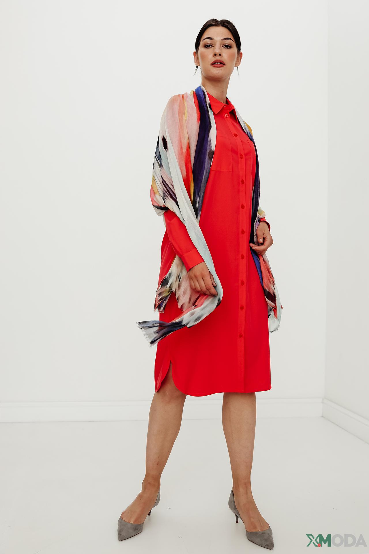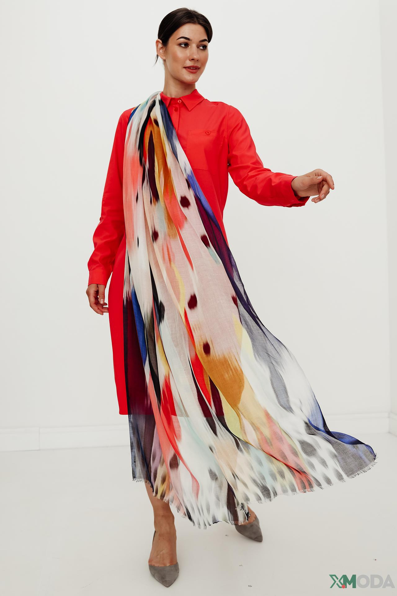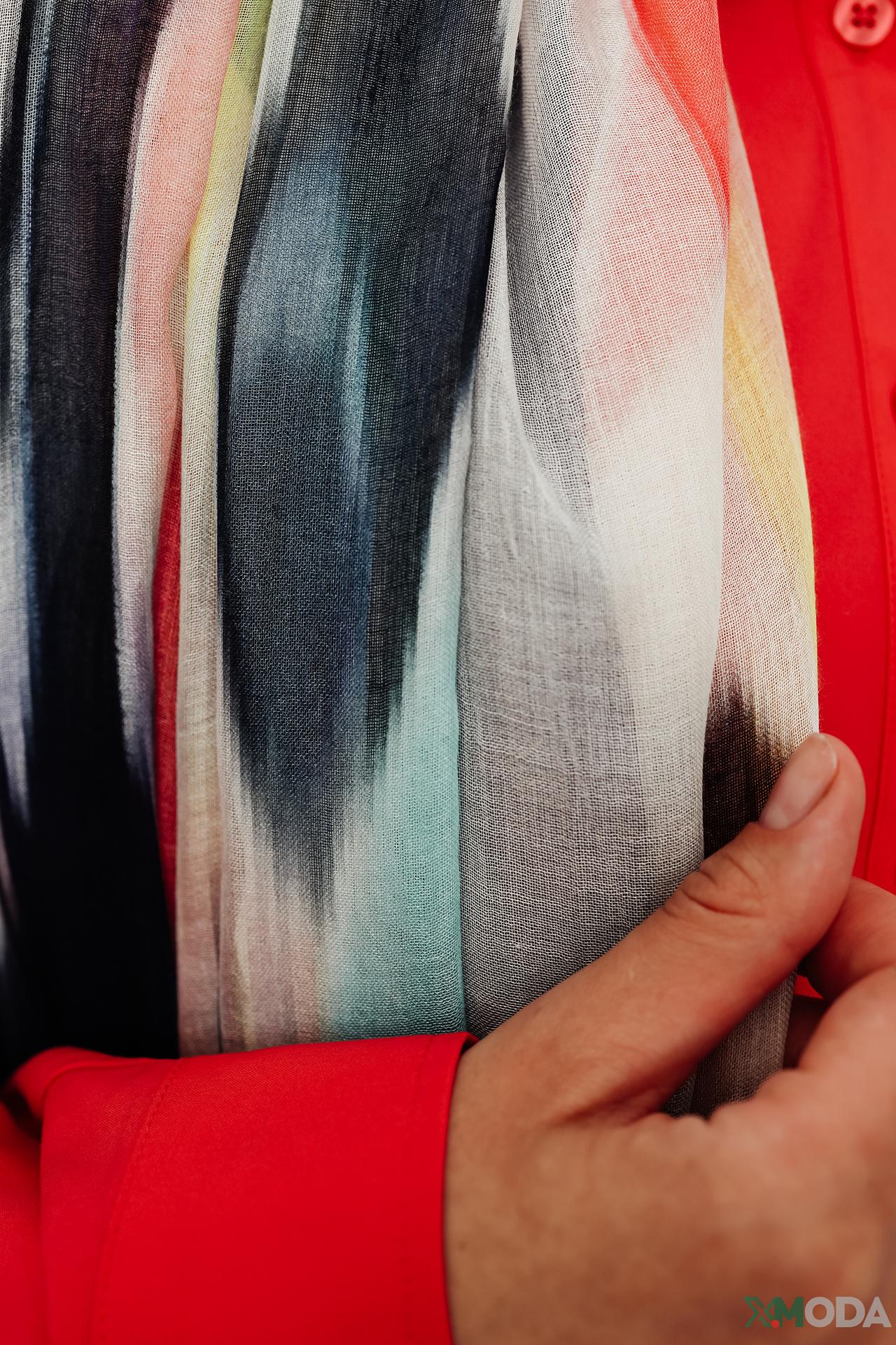 - Легкость и воздушность: Тонкая и струящаяся ткань из модала и шелка придает шарфу необыкновенную легкость и изящный вид. Он красиво драпируется вокруг шеи или плеч, создавая элегантные складки и не утяжеляя образ.