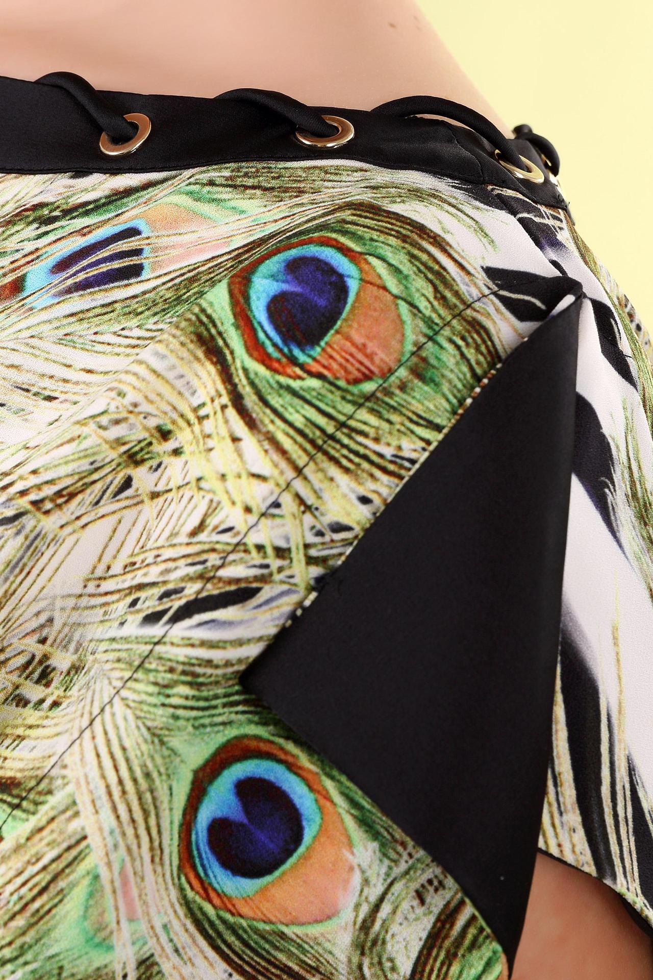 - Уникальный принт: Дизайн с изображением павлиньих перьев делает эту блузу неповторимой и привлекательной.
