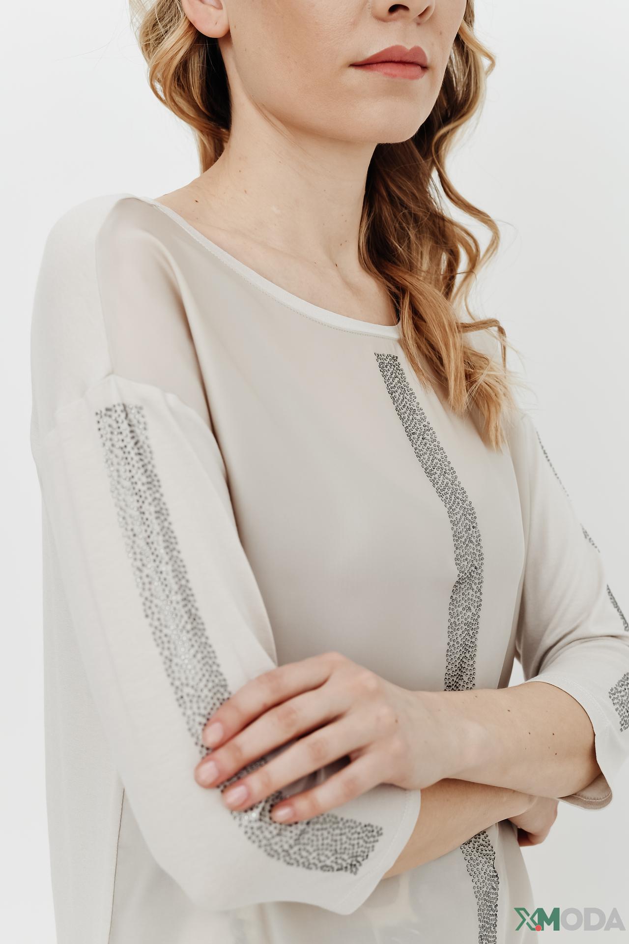 Модель отличается изысканным декором: вертикальные блестящие полосы расположены по центру переда и на рукавах, добавляя изделию особого шарма и динамичности. Свободный силуэт с рукавами ¾ создает непринужденный, но при этом утонченный образ.