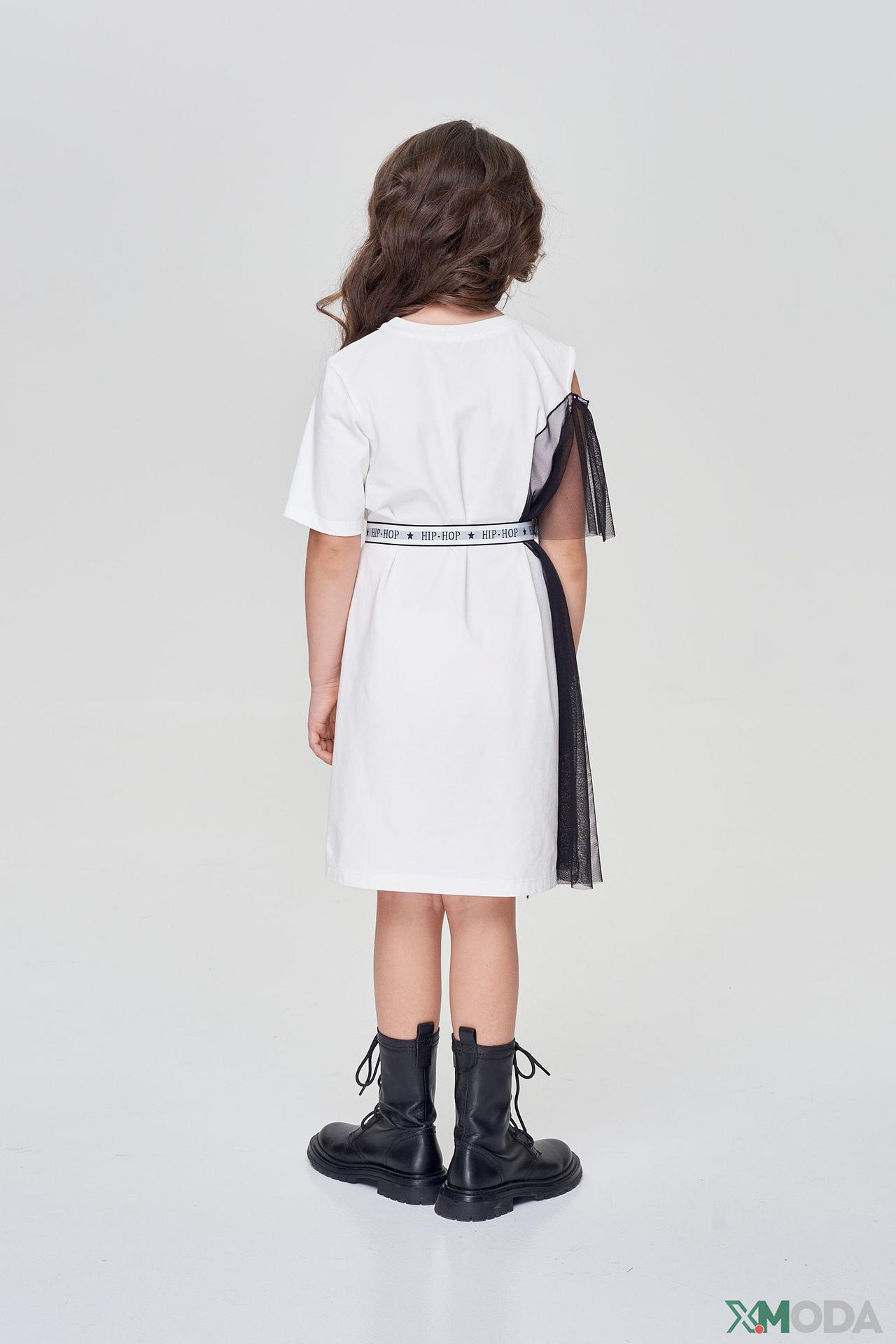 - Оригинальные детали. Открытое плечо дополнено объемным декоративным рукавом из черного фатина, создавая эффектный и современный акцент. Съемный пояс с надписью "HIP-HOP" позволяет регулировать посадку и добавляет спортивный шик.