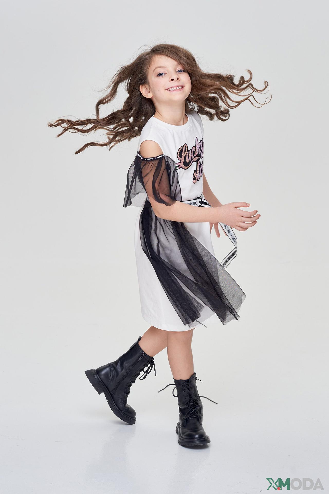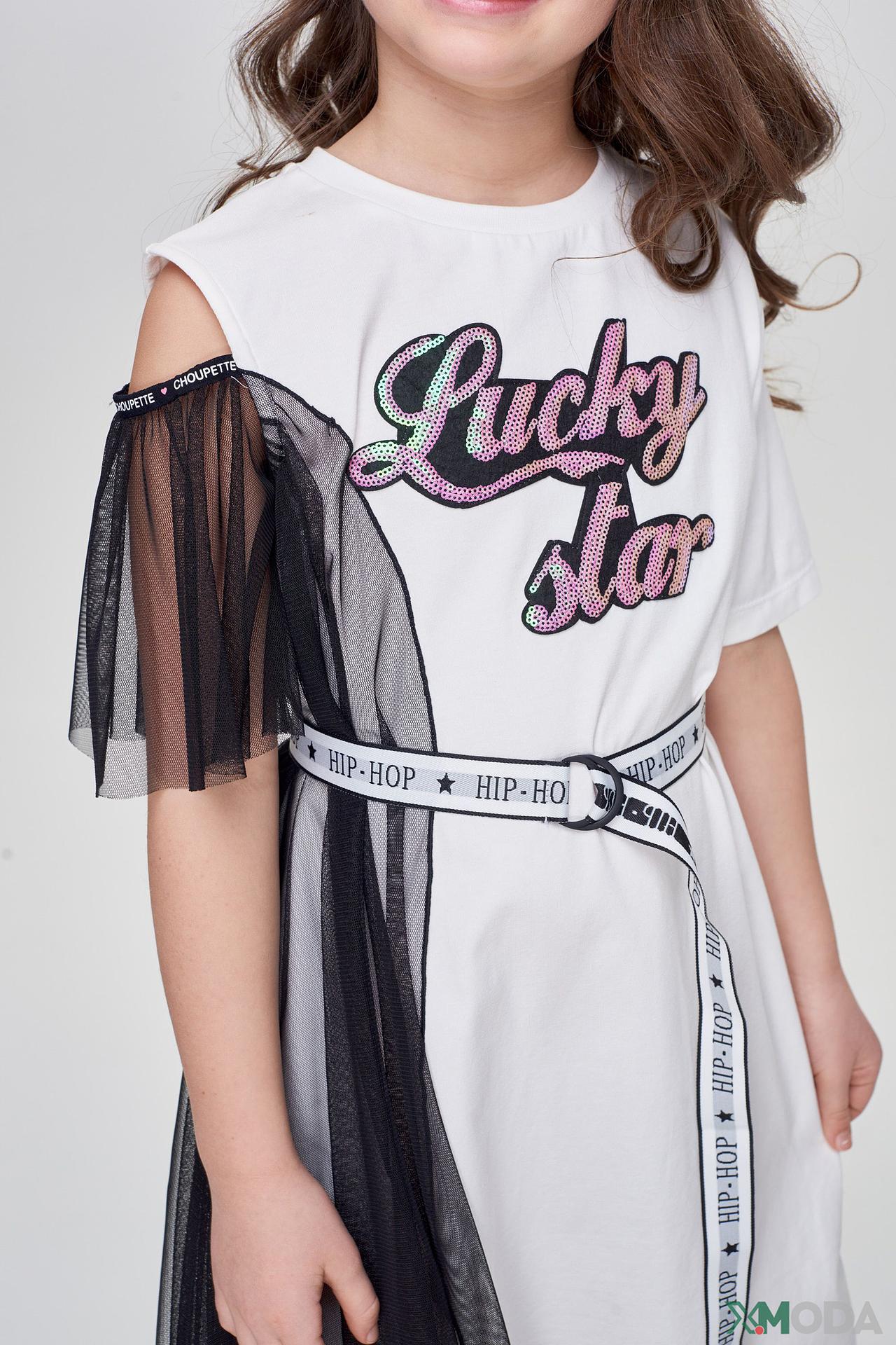 - Модный дизайн. Платье выполнено в контрастном белом цвете с яркой надписью "Lucky star", украшенной переливающимися пайетками, что придает образу игривость и блеск.