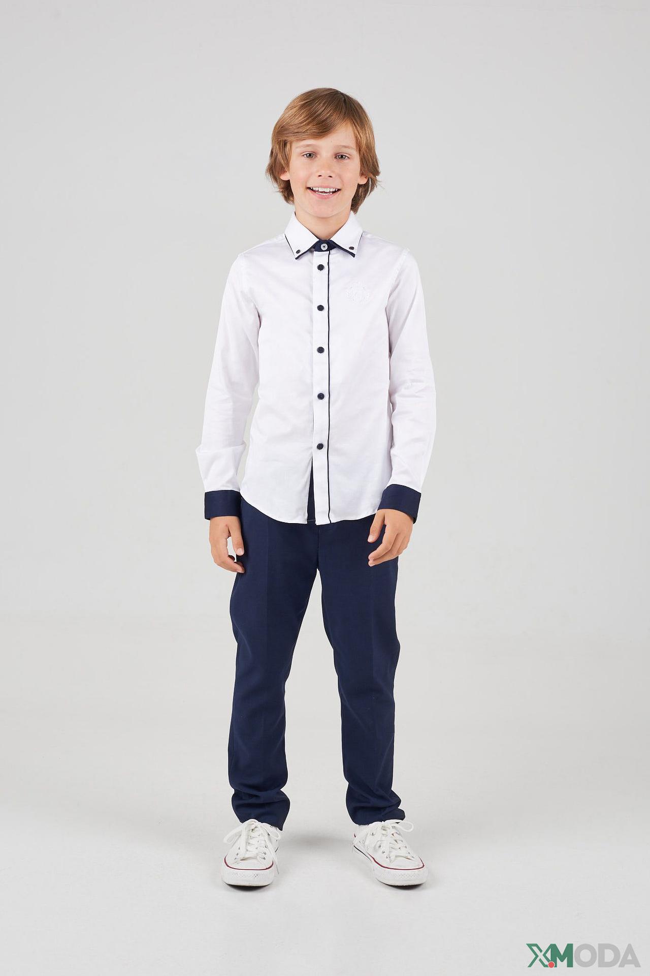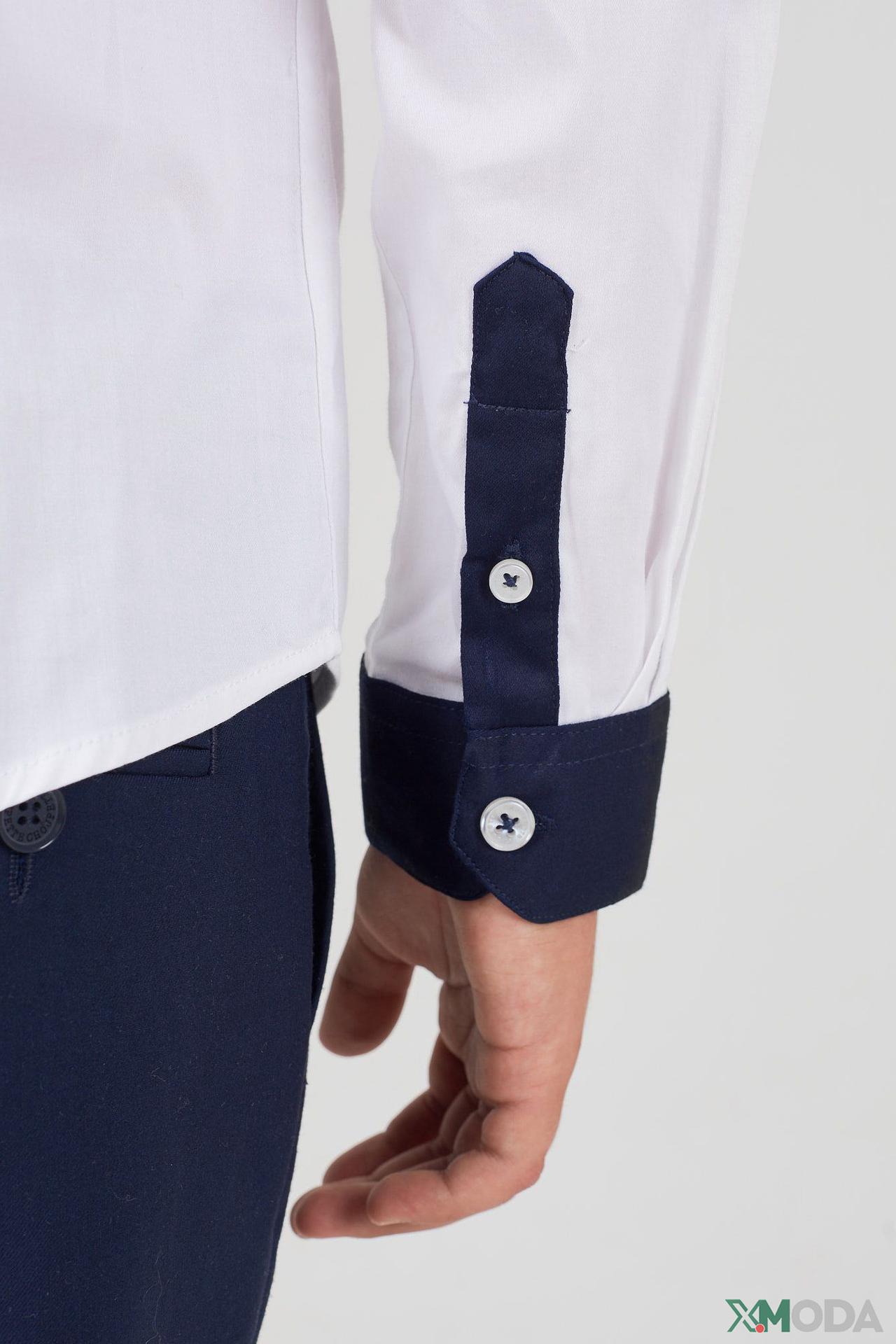 - Стильный дизайн. Рубашка выполнена в белом цвете с контрастными тёмно-синими элементами на воротнике, манжетах и вдоль планки. Декоративная вышивка на груди в виде герба придает изделию изысканность.