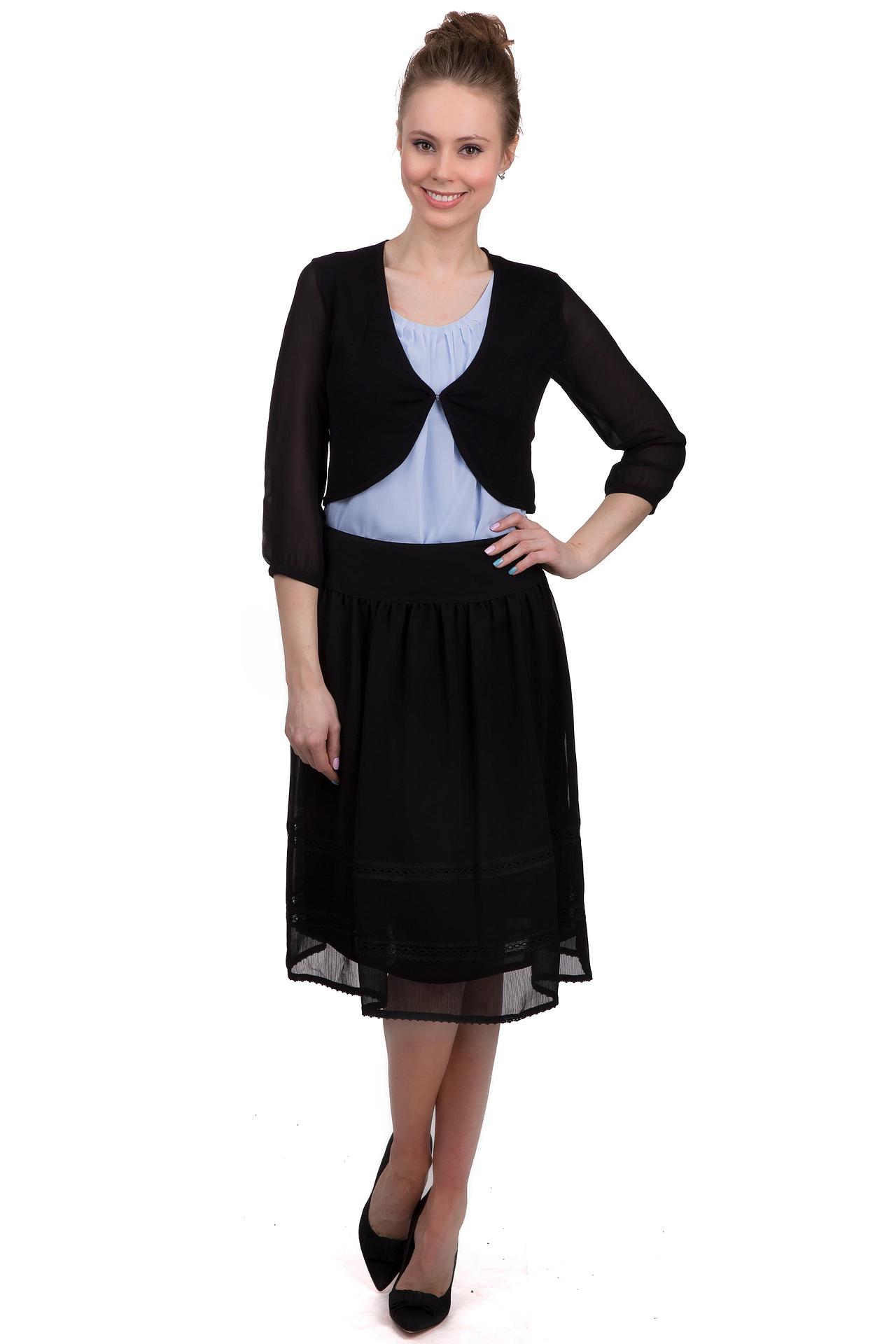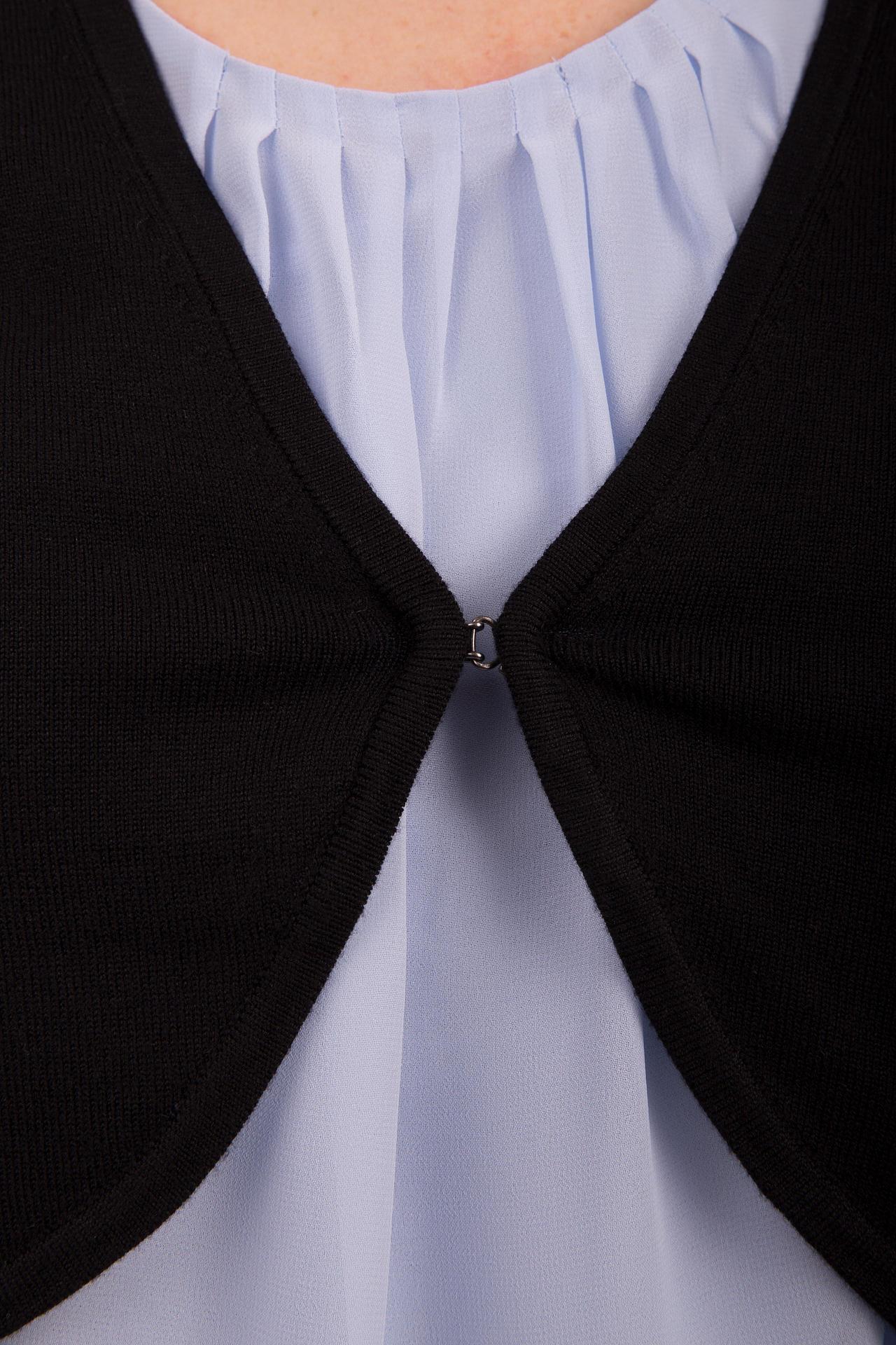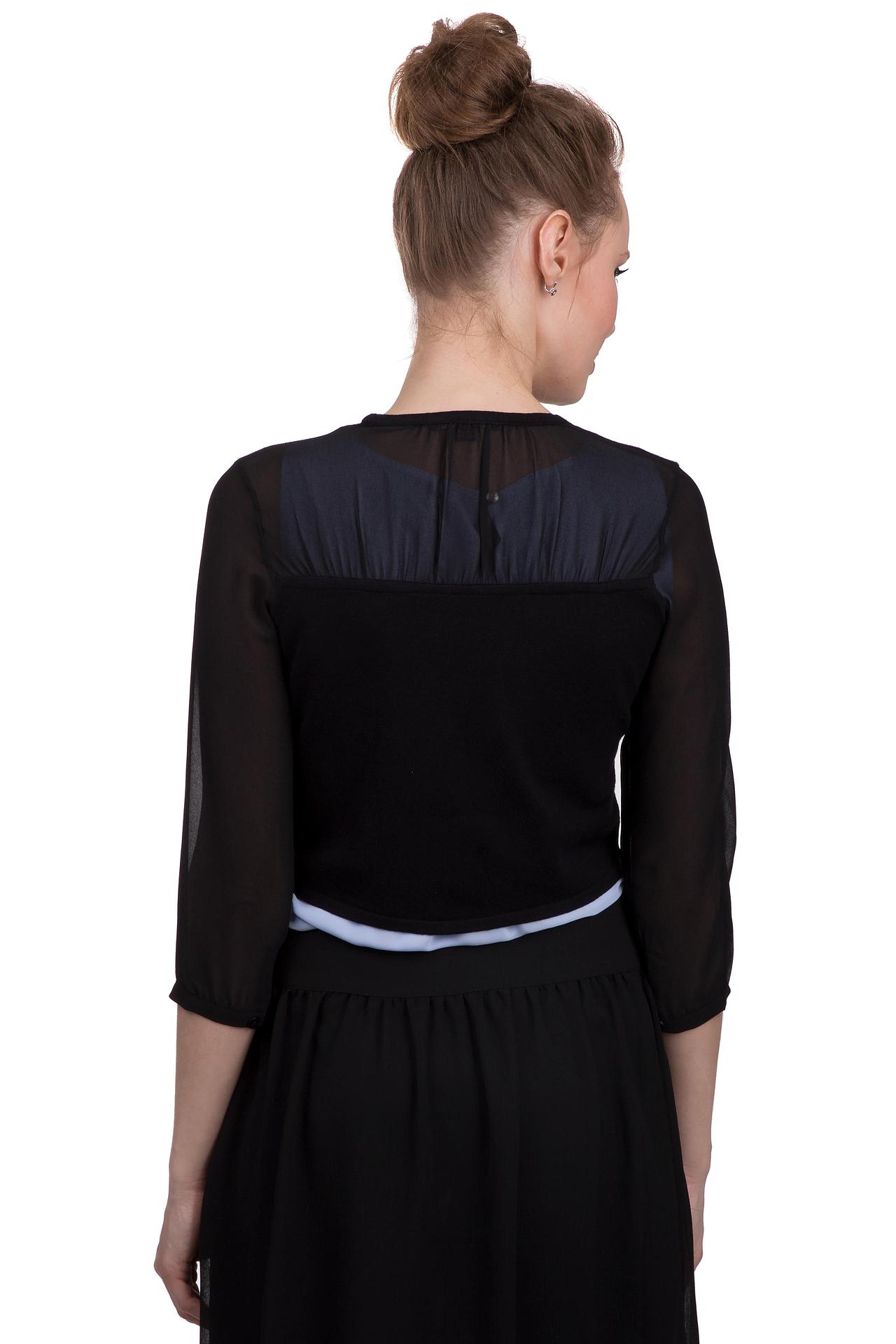 - Дизайн: Классический крой жакета-болеро с V-образным вырезом и объемной драпировкой спереди. Рукава ¾ выполнены из полупрозрачной ткани, что придает изделию легкость.