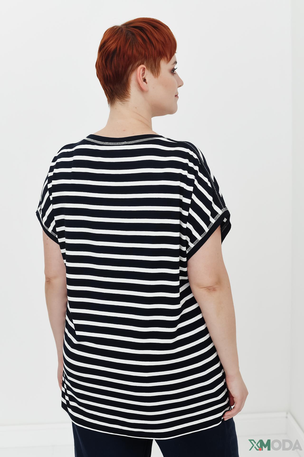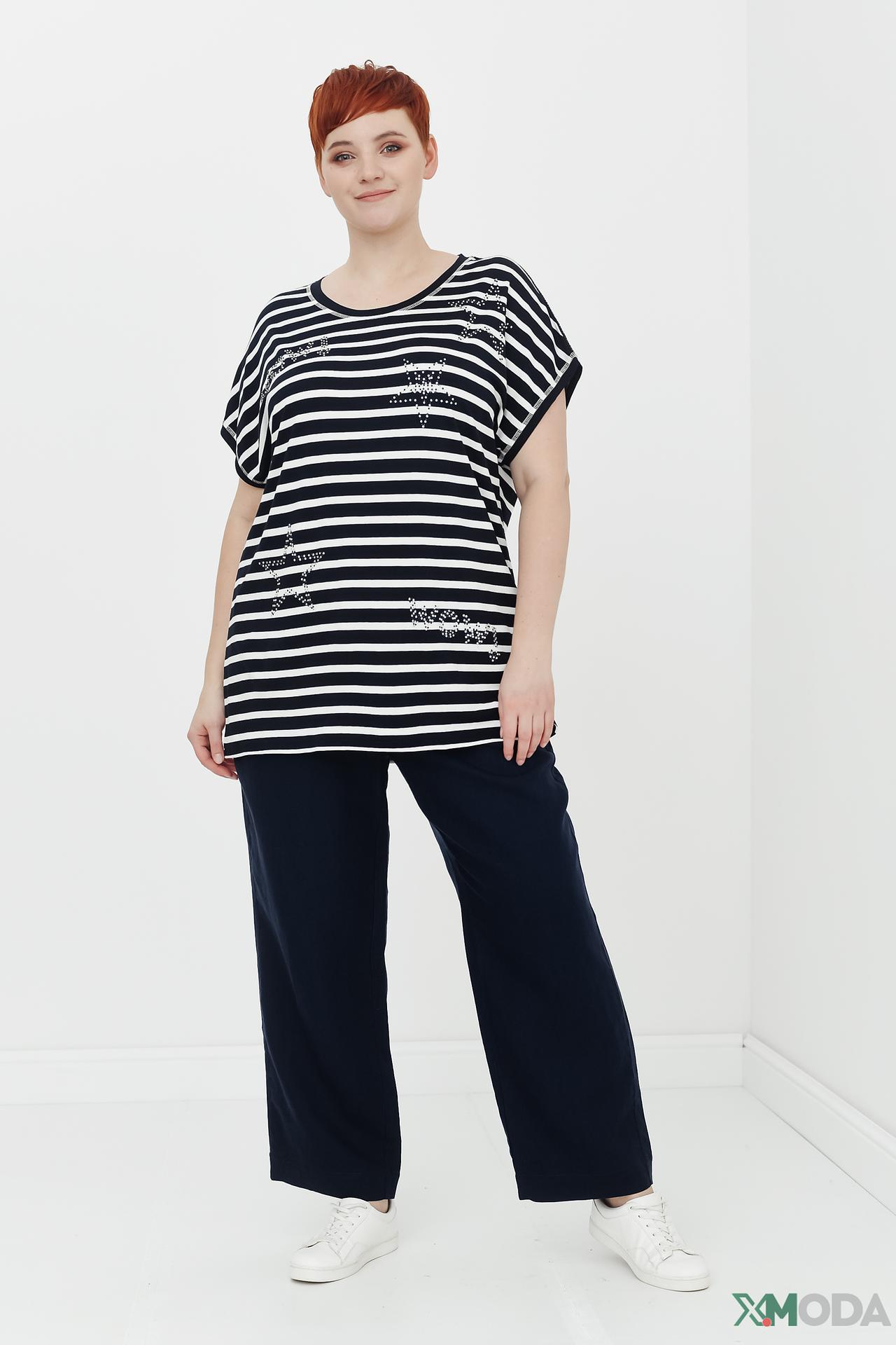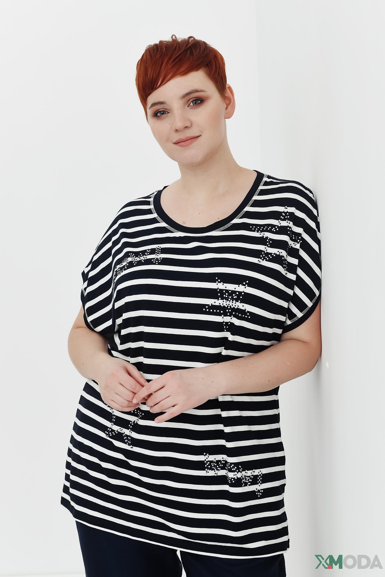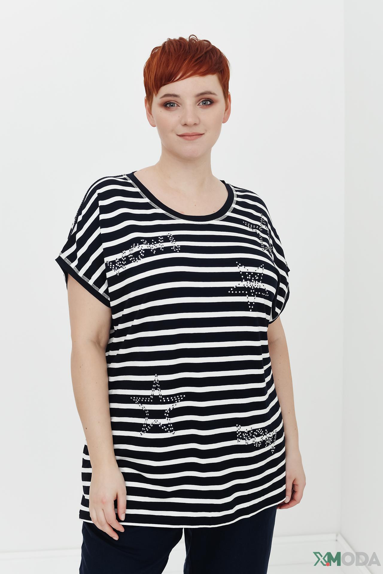 - Дизайн: Классическая полоска в контрастных тонах создает элегантный и всегда актуальный вид. Декор в виде звезд из страз добавляет блеска и делает футболку более нарядной.