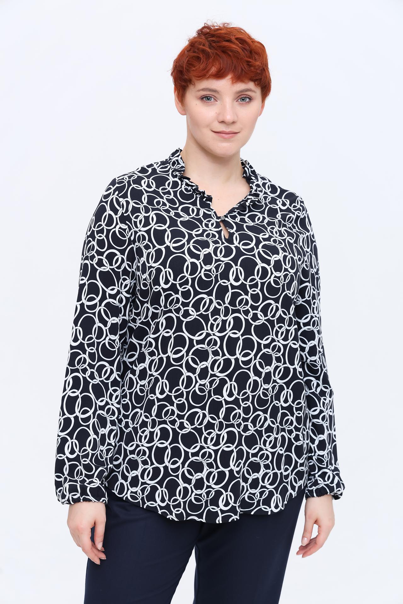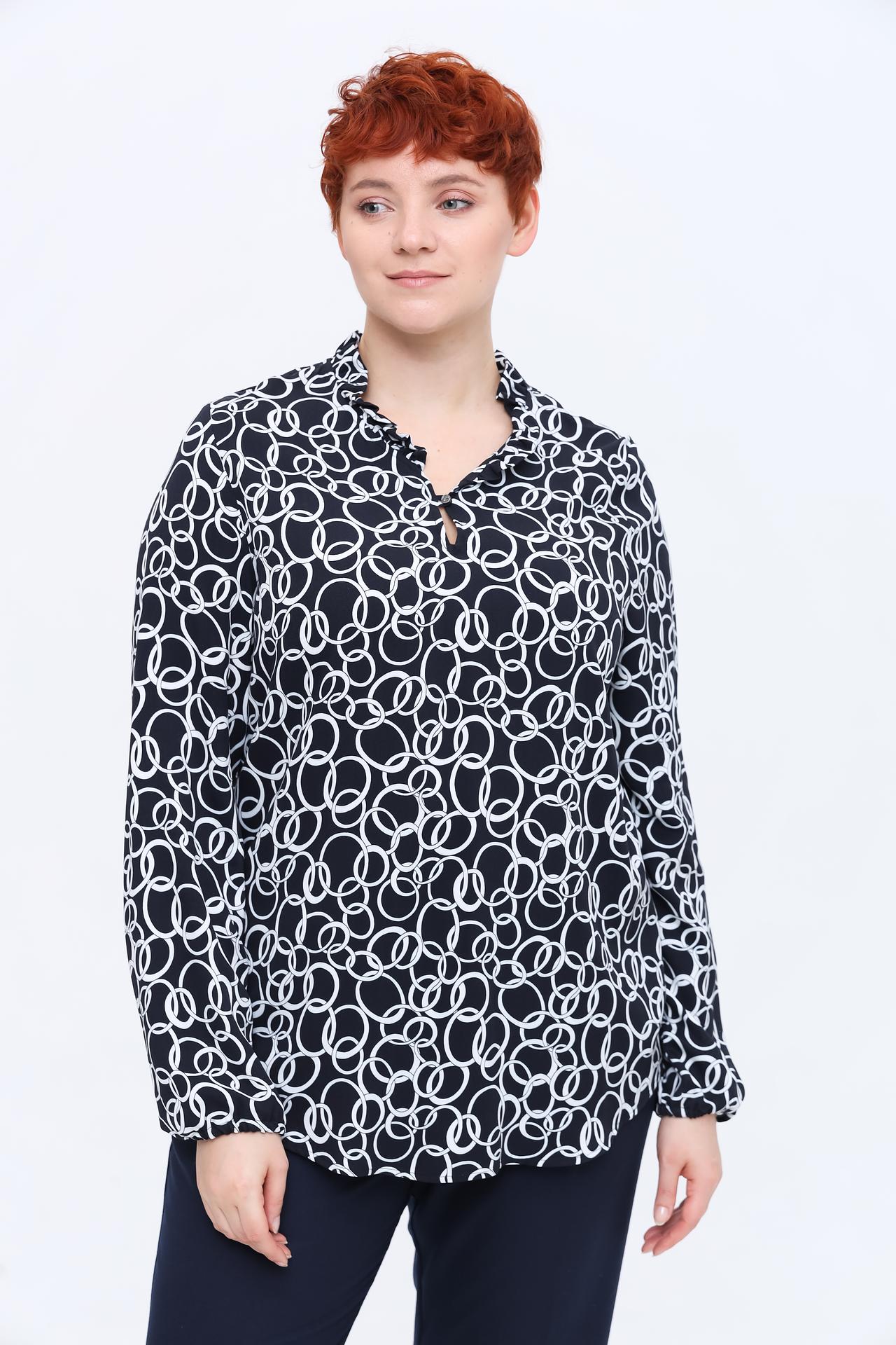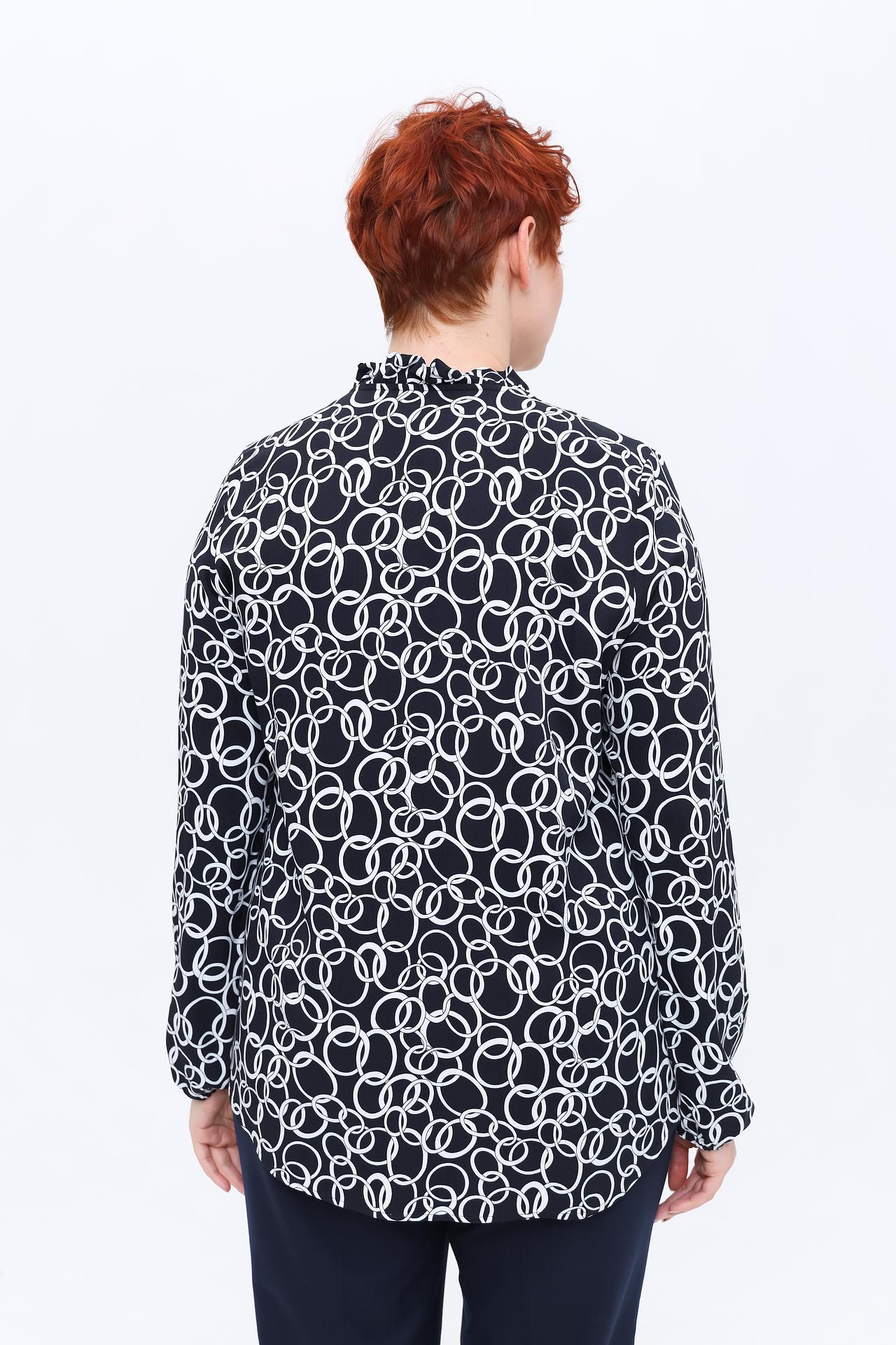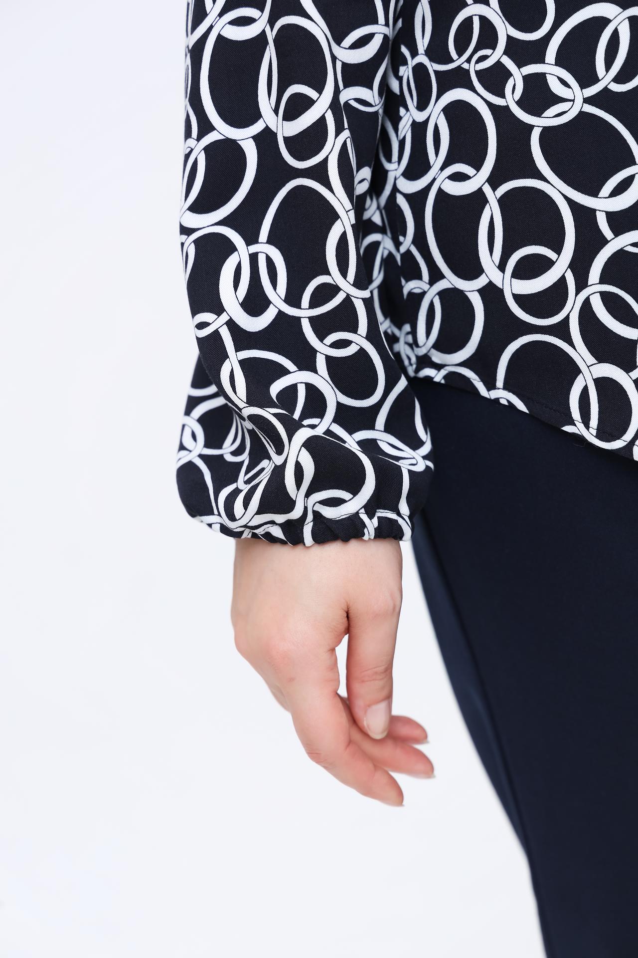 Оригинальный принт с белыми кольцами на тёмно-синем фоне добавит яркости Вашему гардеробу. Блуза идеально подходит для офиса, прогулок и вечеринок, сочетаясь как с классическими брюками, так и с джинсами.