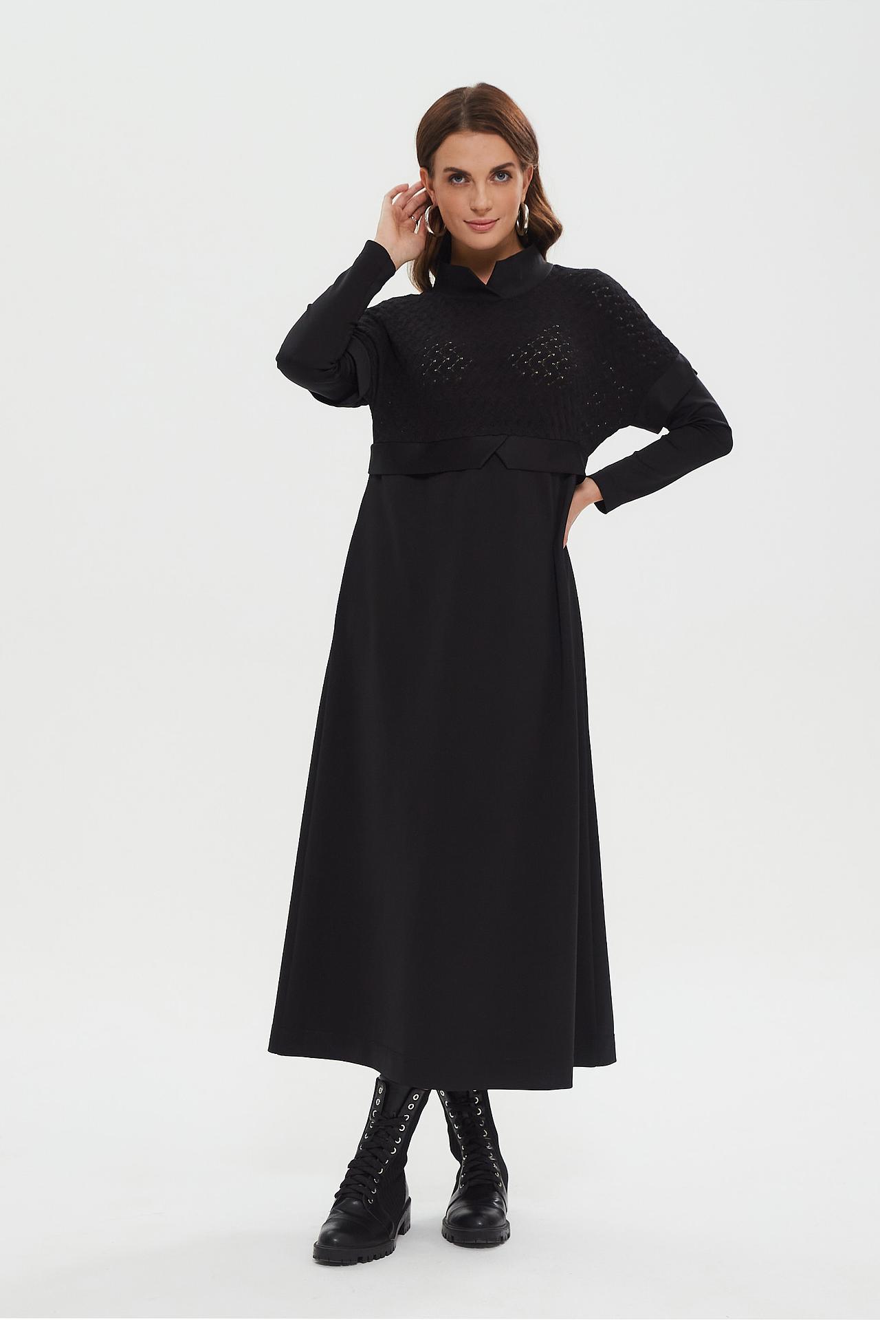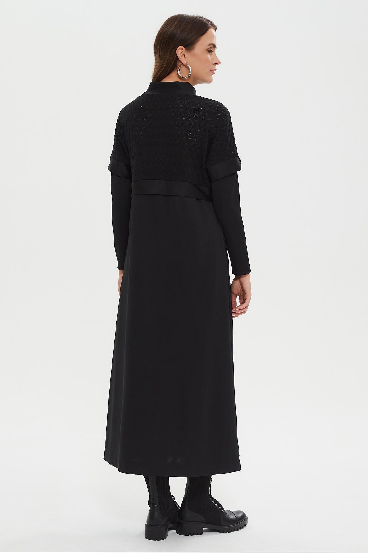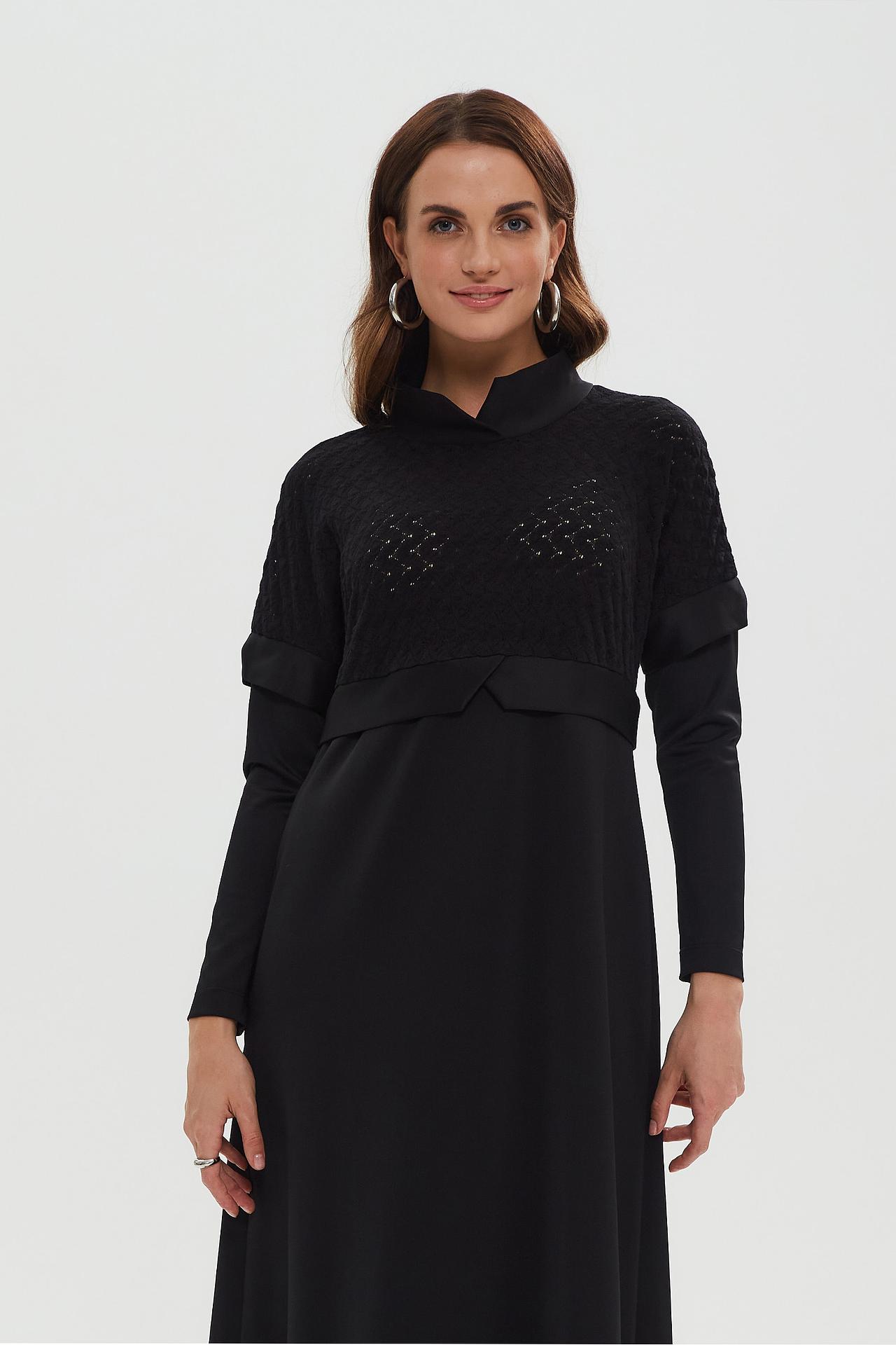 Модель выполнена из высококачественного материала, состоящего из 95% полиэстера и 5% эластана, что гарантирует износостойкость и идеальную посадку. Верхняя часть платья оформлена оригинальным ажурным вязаным узором, создающим эффект многослойности и придающим изделию особый шарм. Воротник-стойка с V-образным вырезом добавляет изысканности.