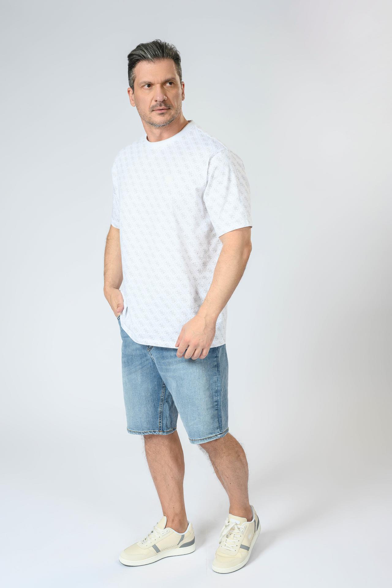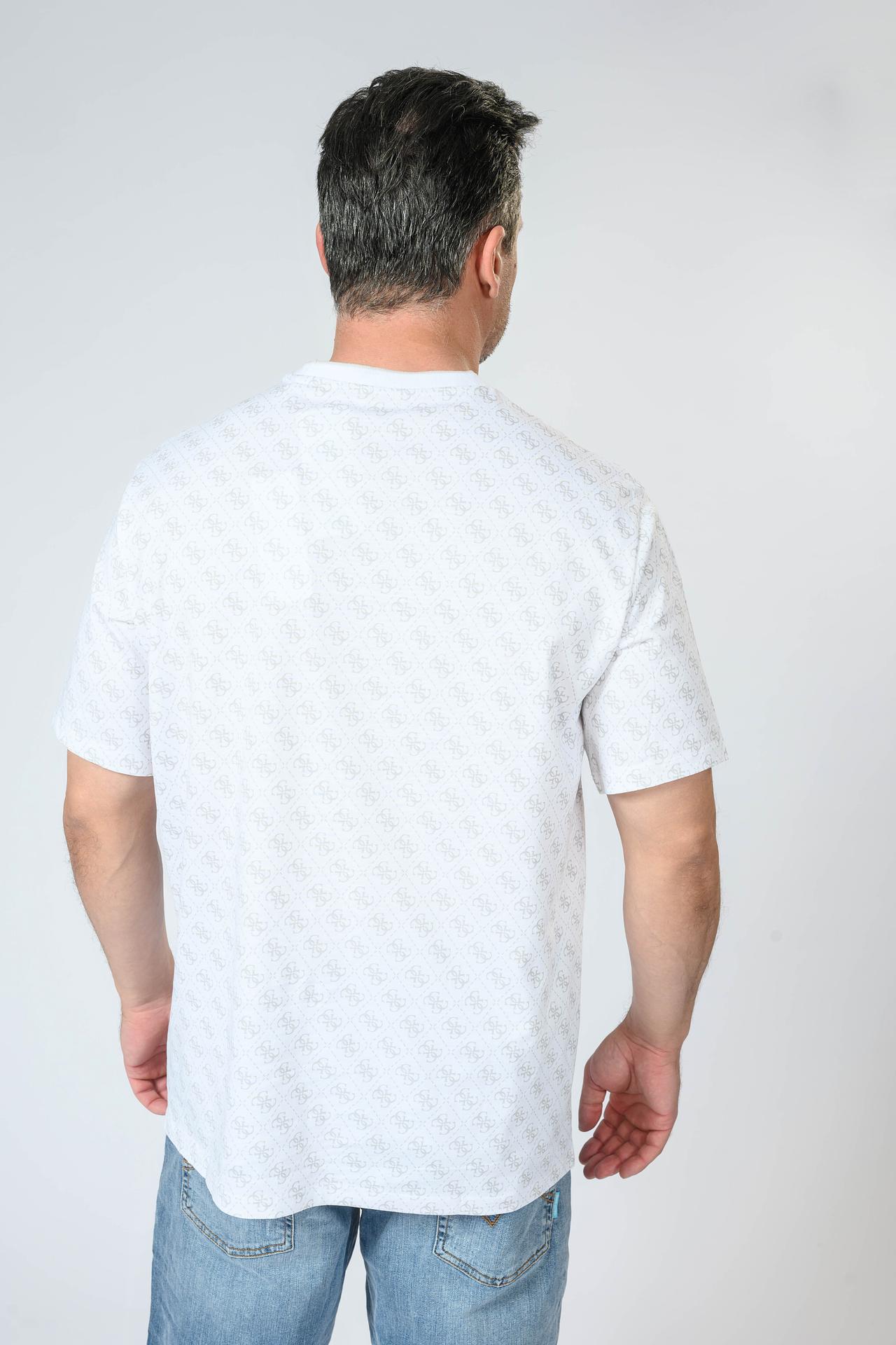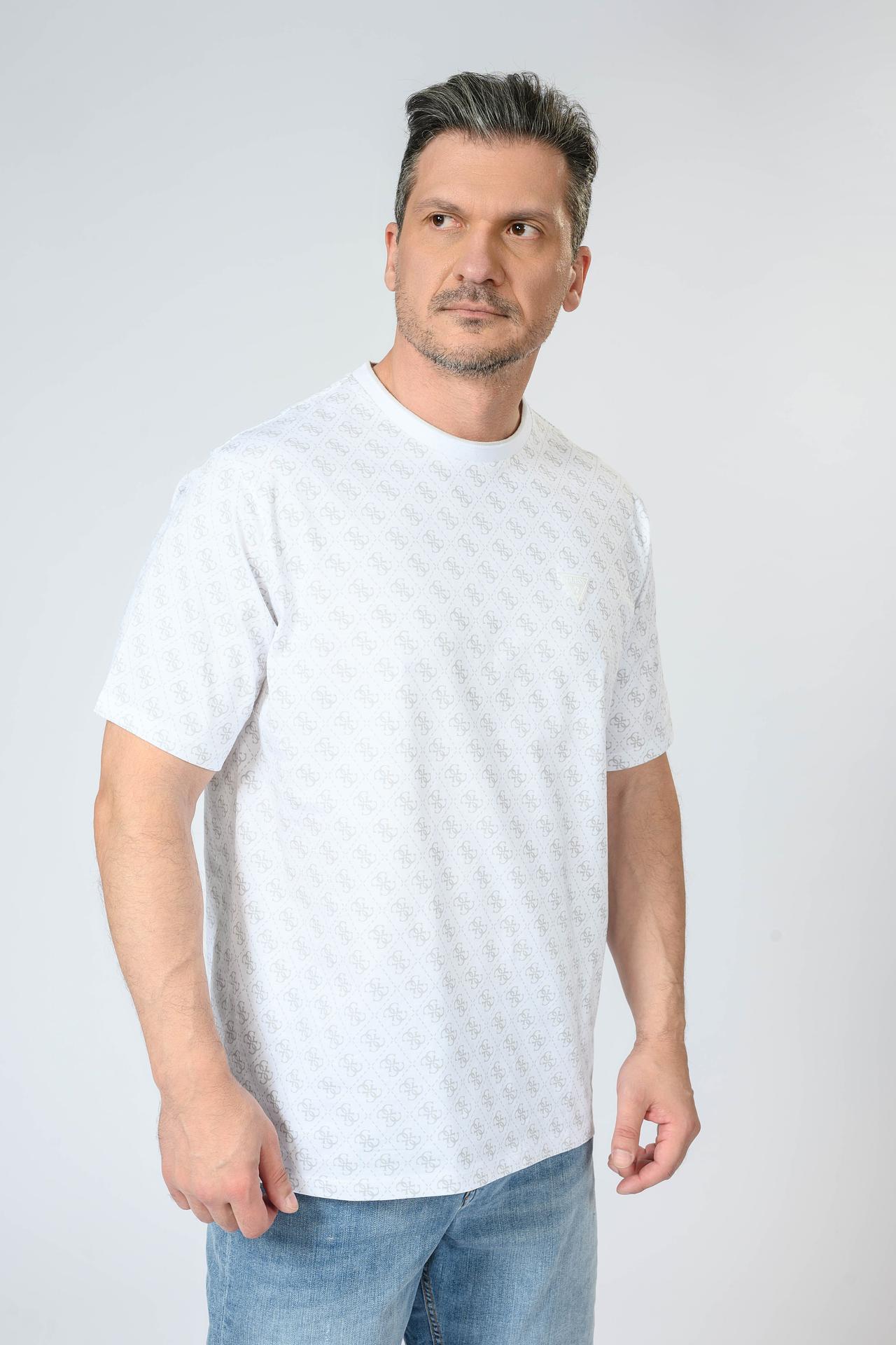- Дизайн: Белоснежное полотно украшено изысканным монограмным узором Guess, который добавляет изделию узнаваемости и шика. На груди расположен компактный треугольный значок с логотипом бренда, подчеркивающий его эксклюзивность.