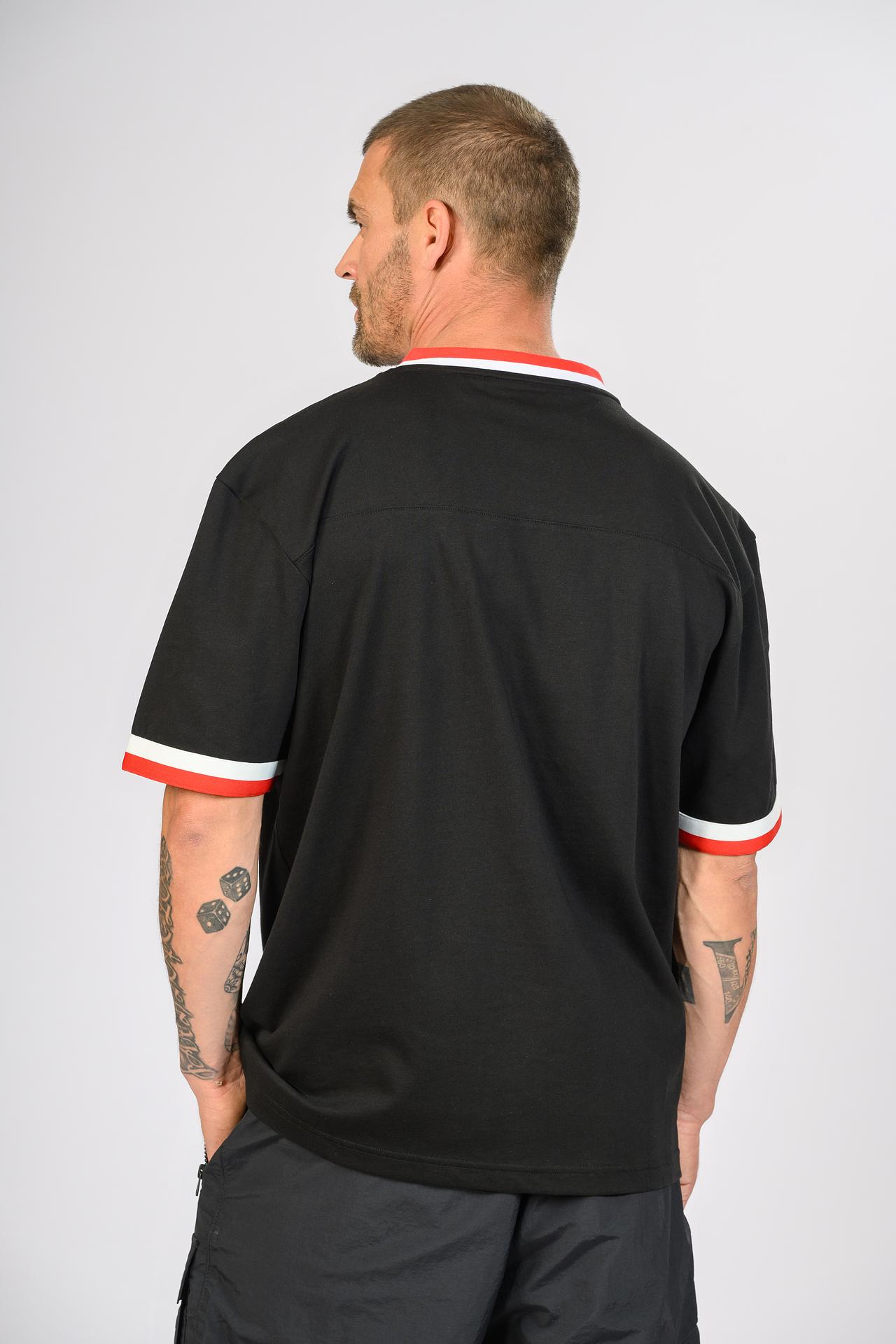 - Яркий дизайн. Классический V-образный вырез дополнен контрастными красно-белыми полосками на воротнике и рукавах, что придает изделию динамичный и спортивный вид. Чёрный цвет легко сочетается с другими элементами гардероба.