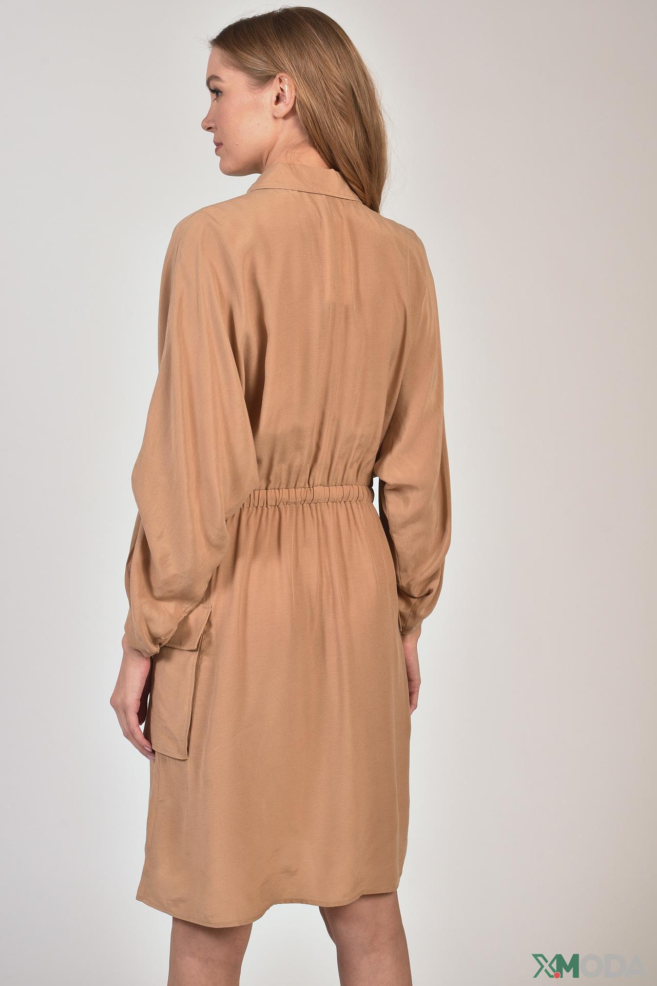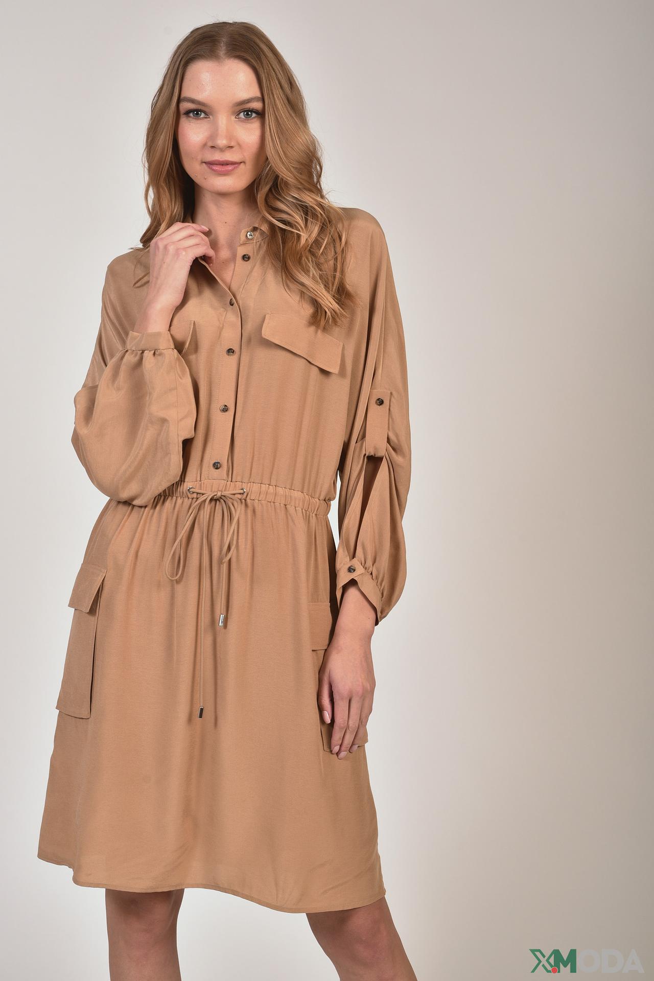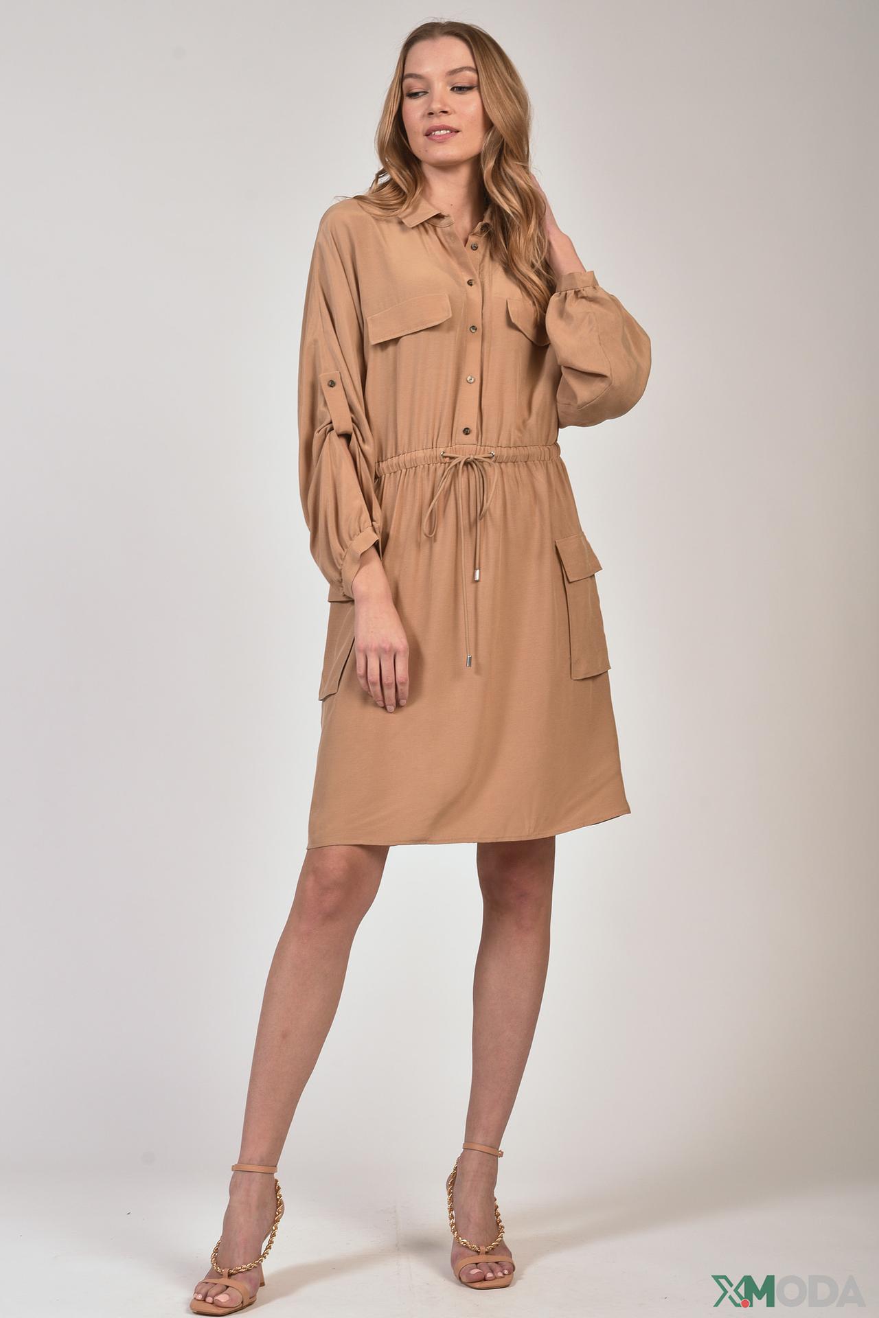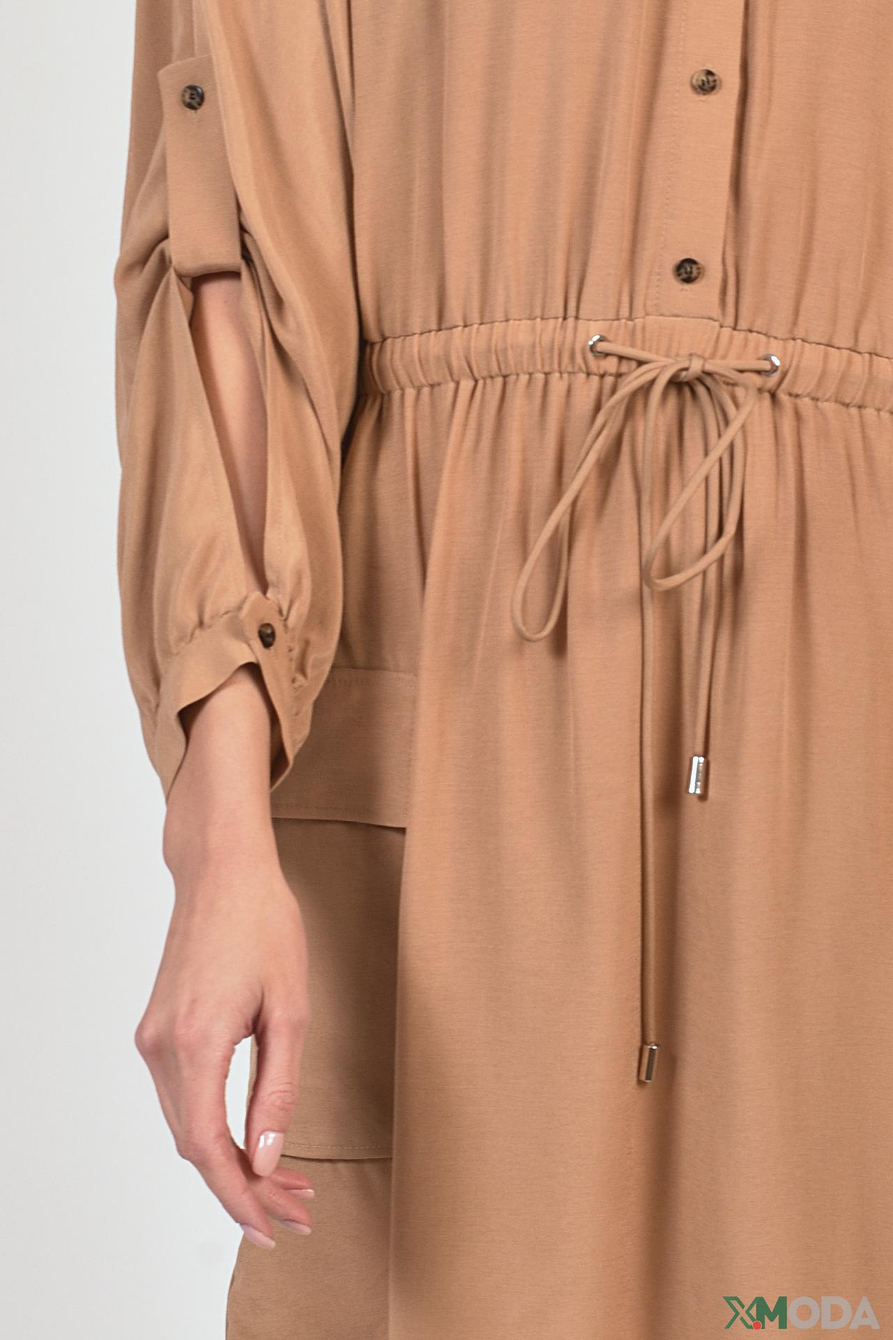 - Дизайн: Платье-рубашка с поясом на кулиске. Функциональные накладные карманы и возможность регулировки силуэта добавляют практичности и стиля.