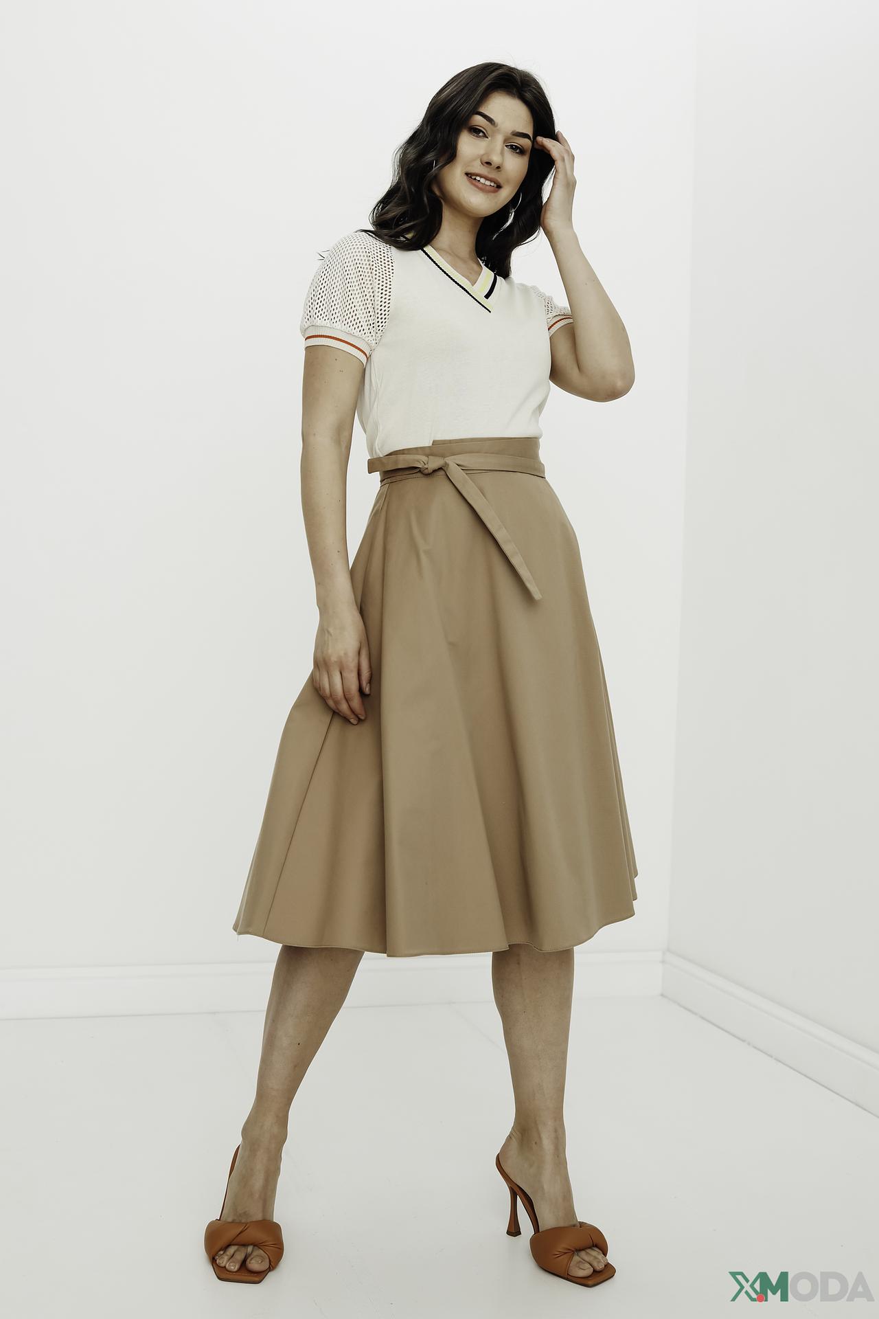 - Крой: А-силуэт. Юбка расширяется книзу, создавая изящный и женственный образ.