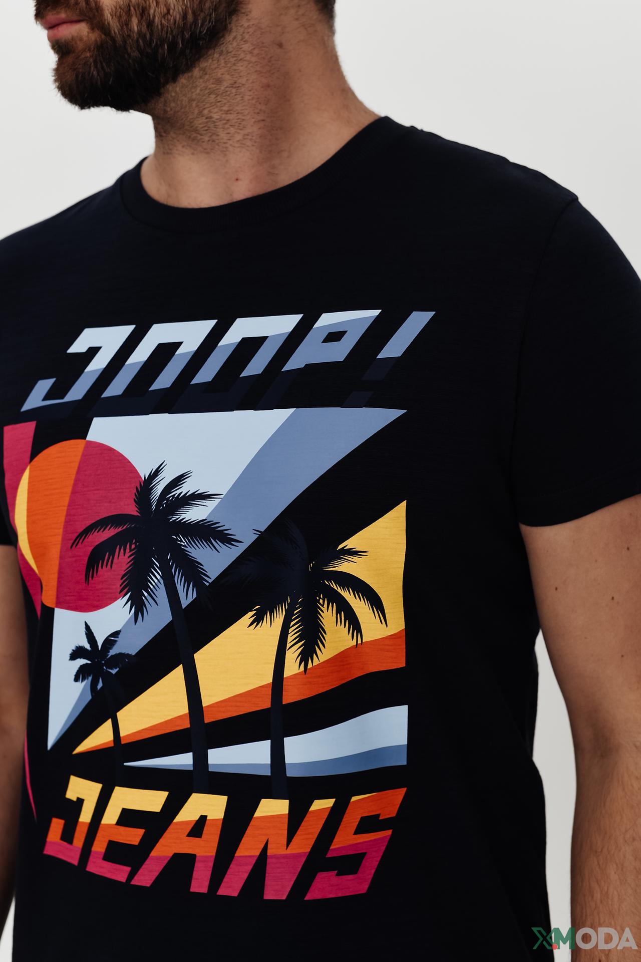 - Яркий принт: Центральный элемент дизайна – красочный графический принт с изображением пальм и надписи "JOOP! JEANS", выполненный в смелых оранжевых, красных, синих и желтых тонах. Этот принт добавляет уникальности и акцента вашему образу.