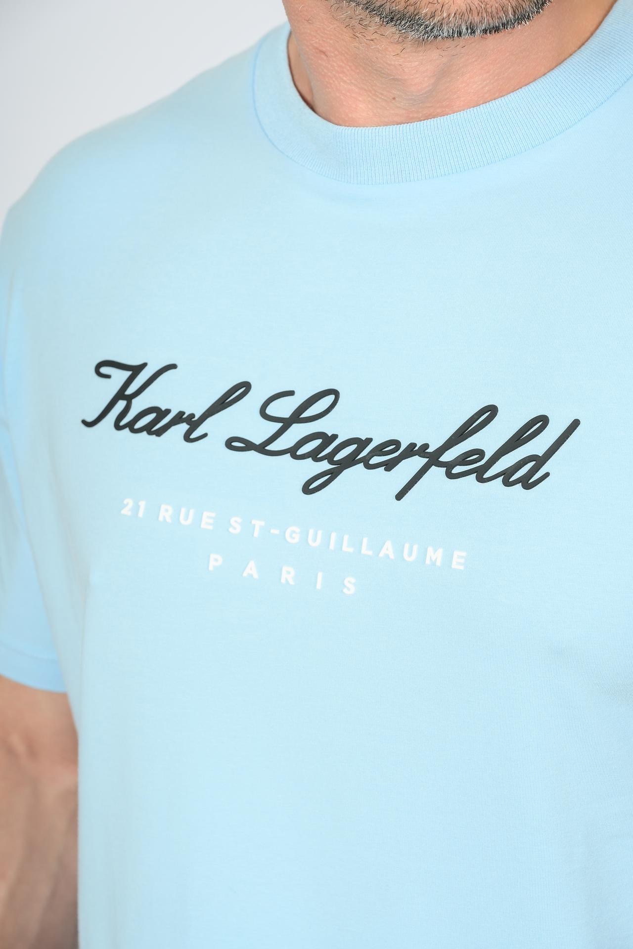 Лаконичный дизайн футболки подчеркивает ее элегантность. На груди расположен стильный принт с логотипом Karl Lagerfeld и адресом бренда в Париже. Футболка идеально подходит для повседневной носки, создавая образ, полный уверенности и индивидуальности.