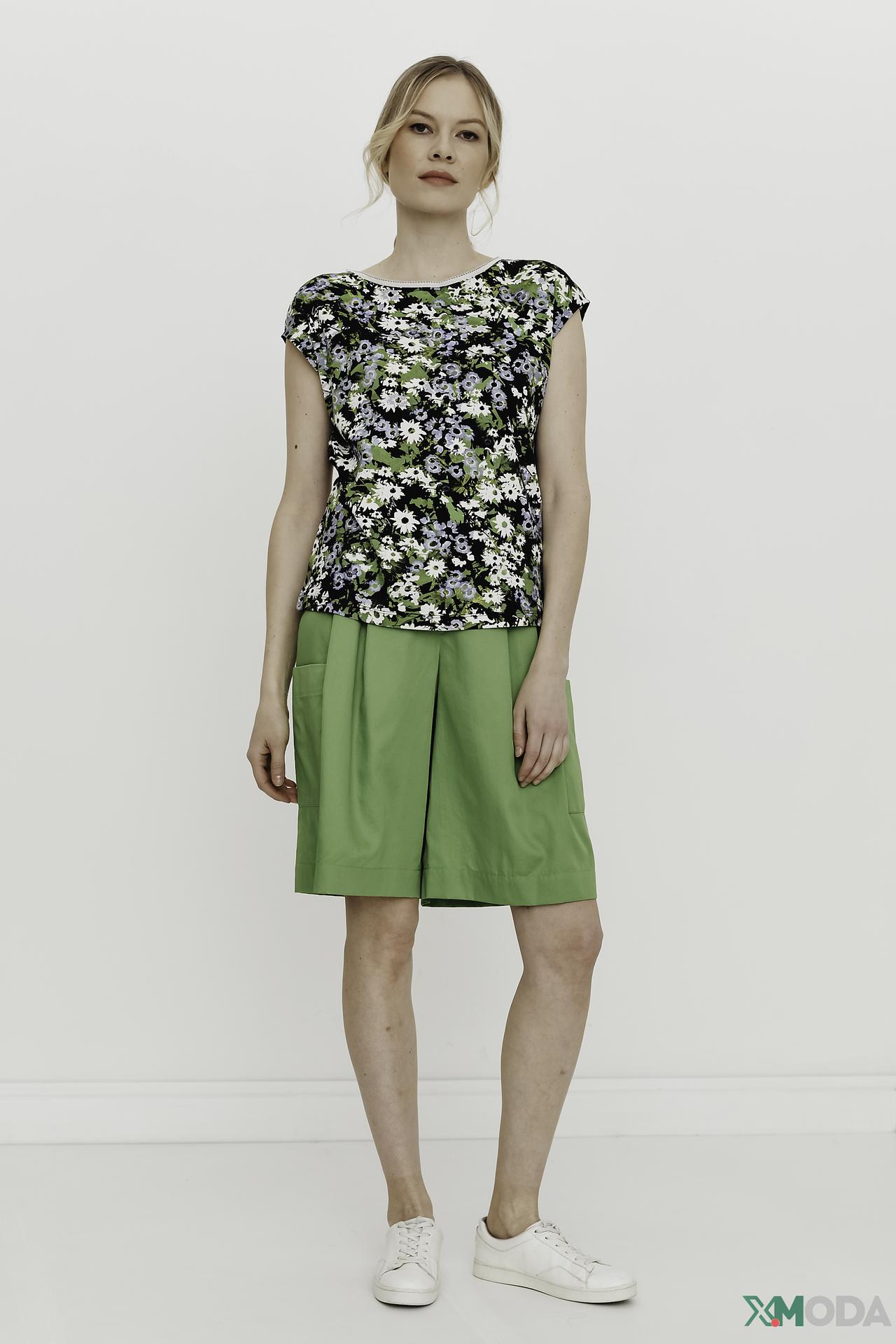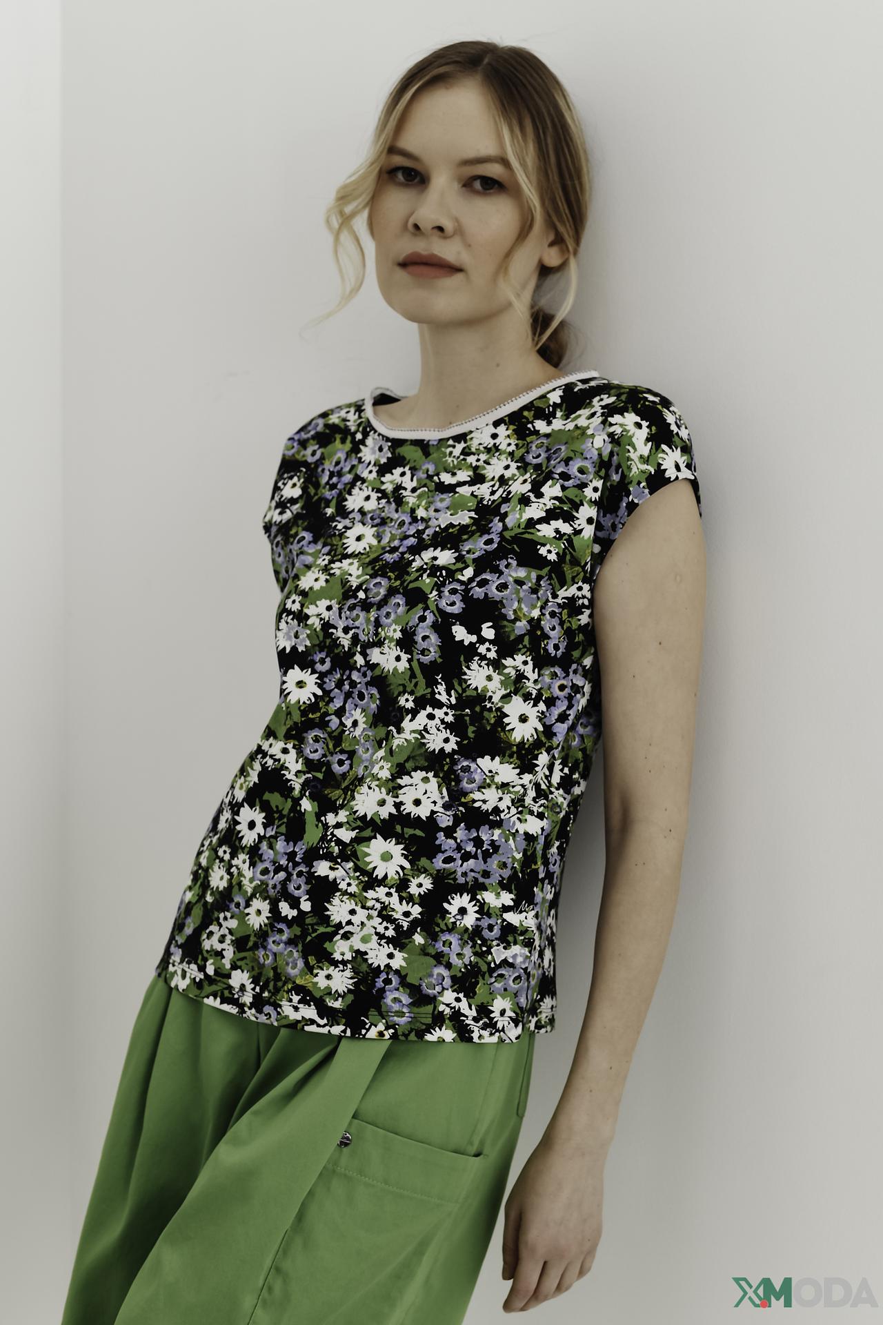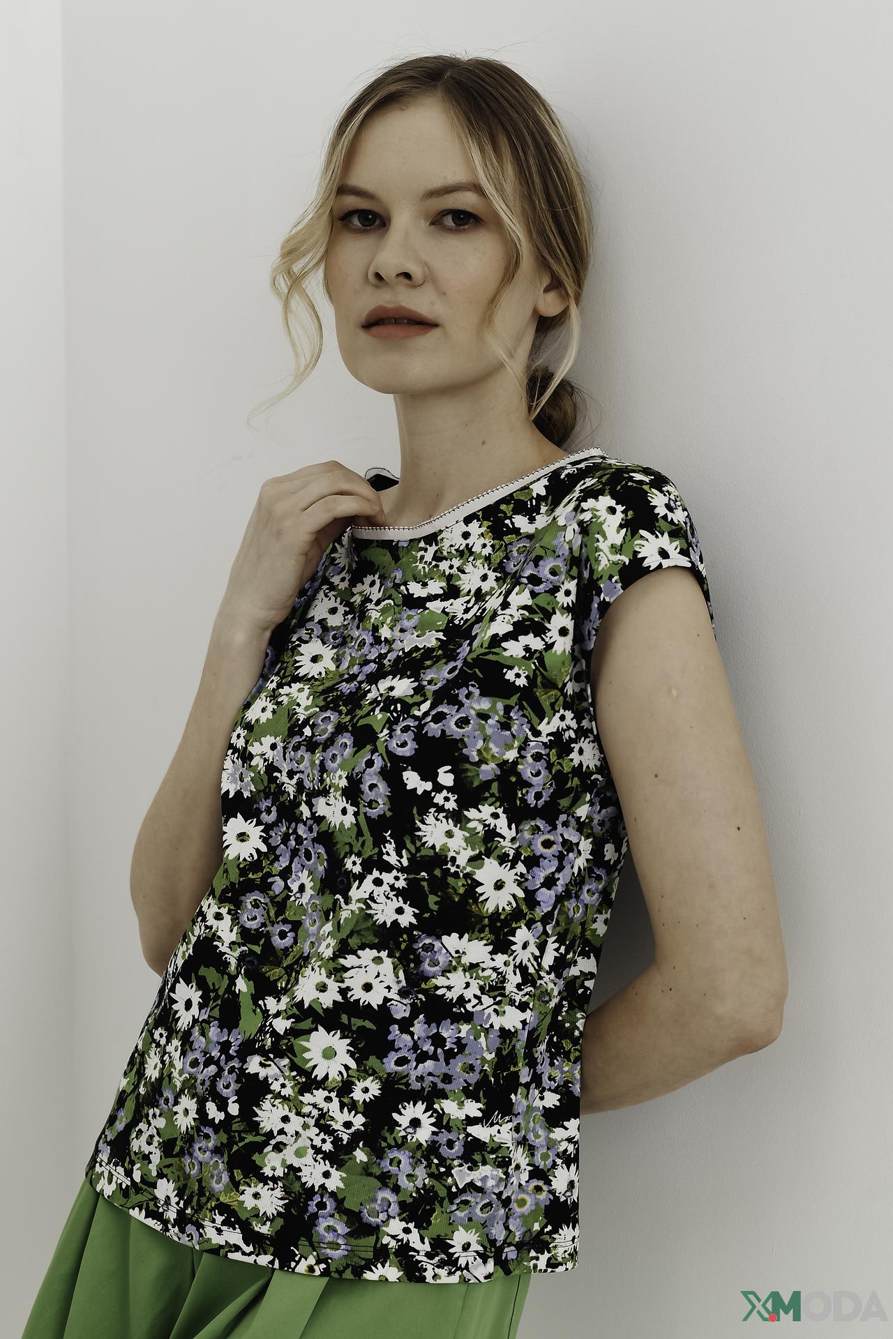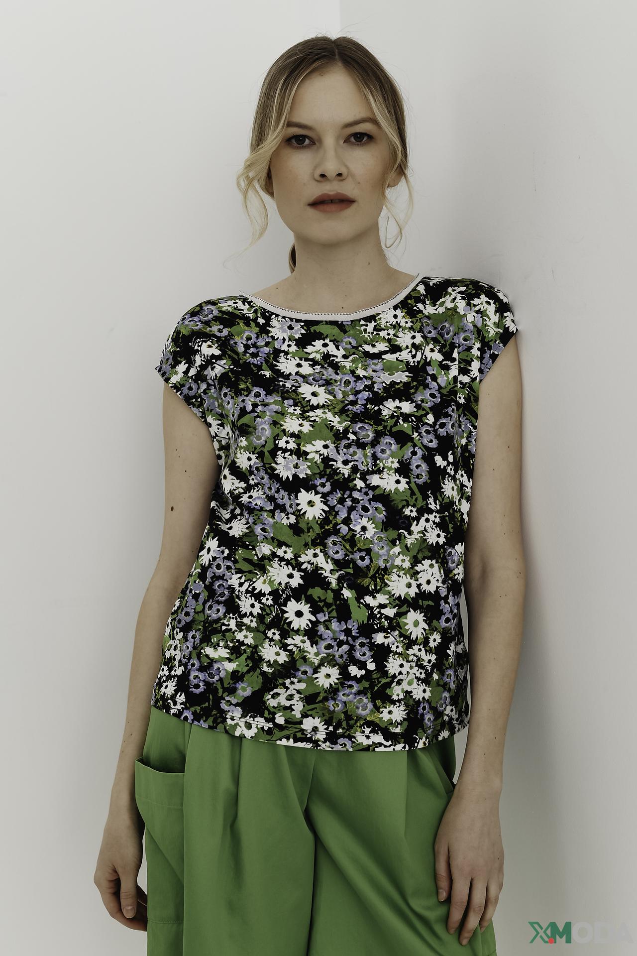 - Яркий цветочный принт: Насыщенное сочетание черного, белого, зеленого и голубого оттенков в цветочном узоре придает этой модной блузке особую изюминку, делая ее центральным элементом любого комплекта.
