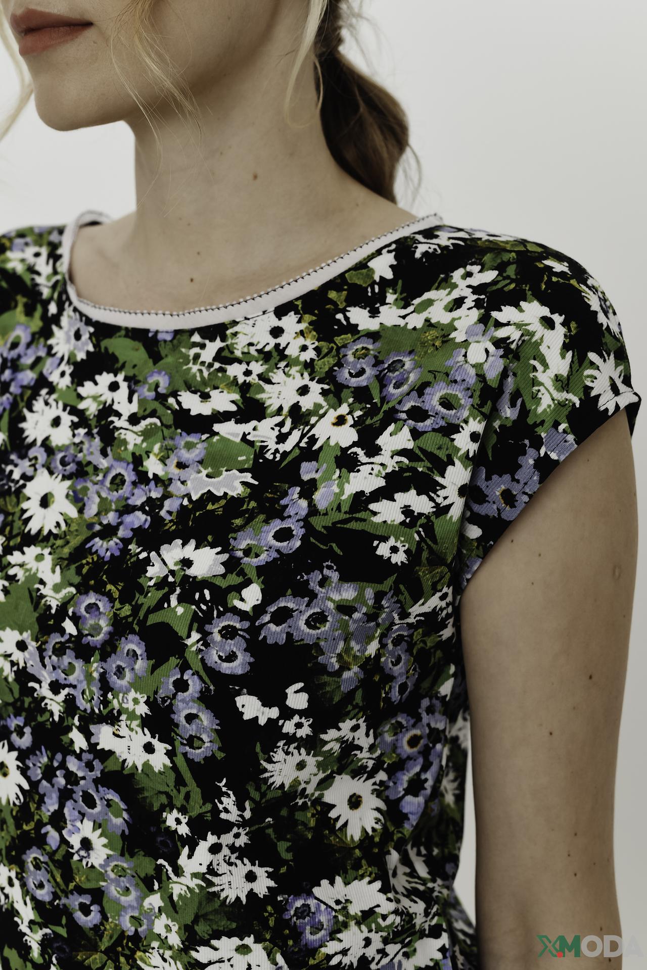 - Изысканные детали: Аккуратный округлый вырез горловины, дополненный контрастным белым кантом, добавляет изысканности и подчеркивает линию шеи, делая образ завершенным.
