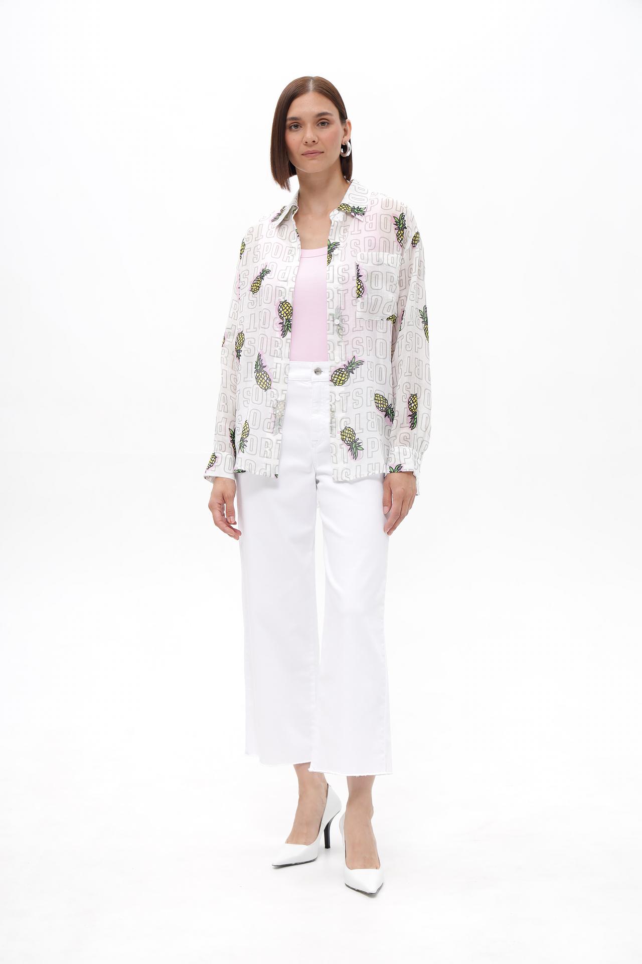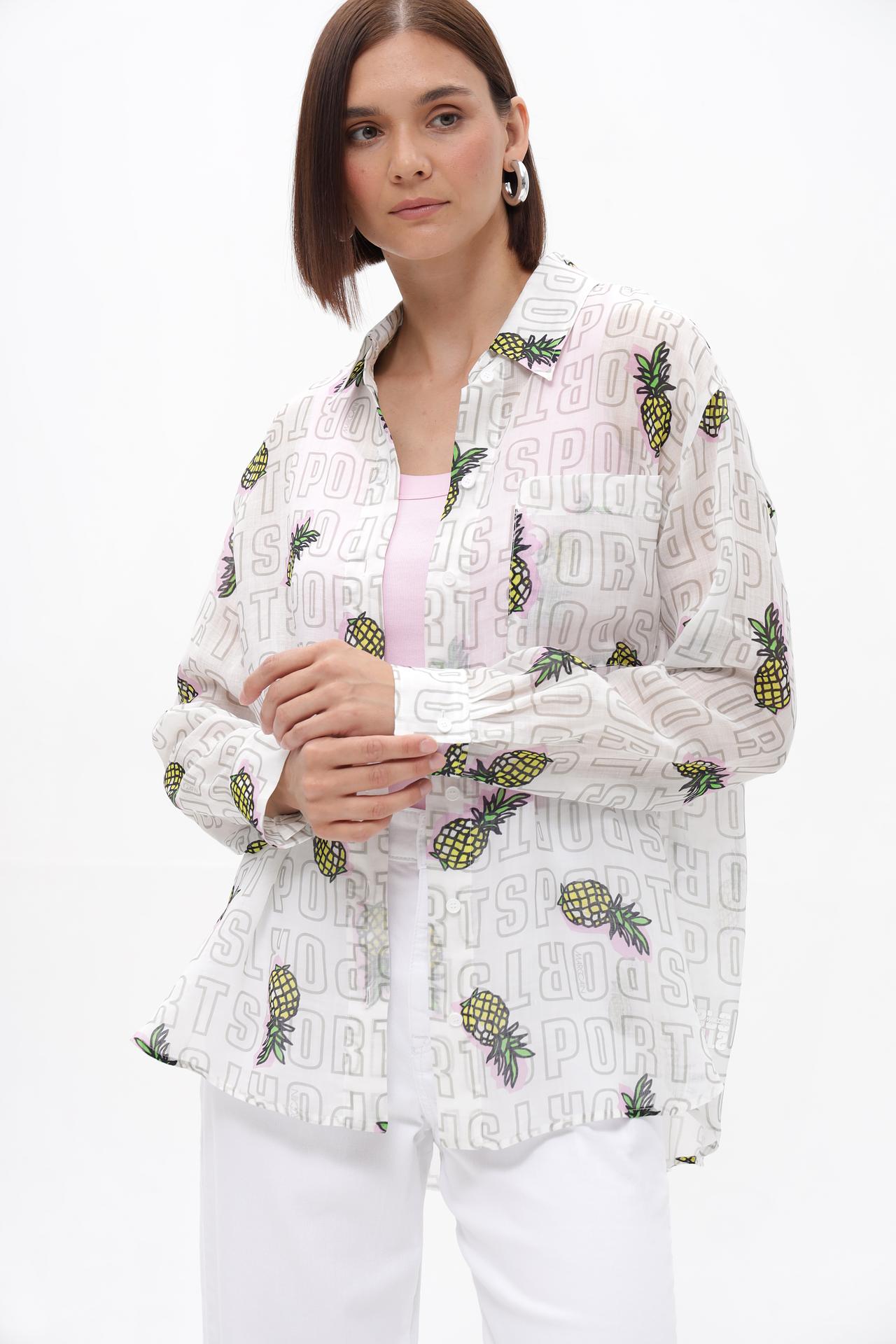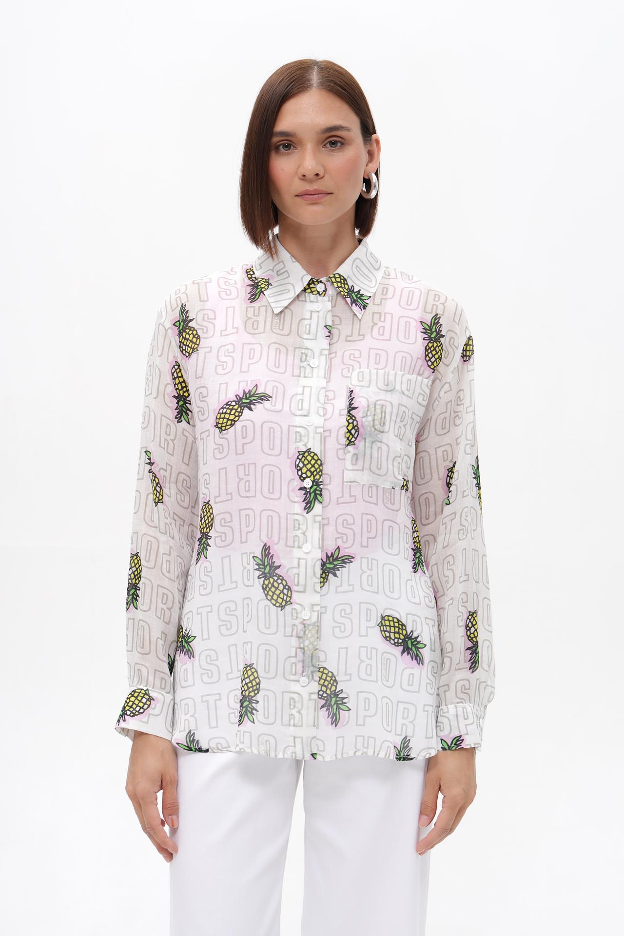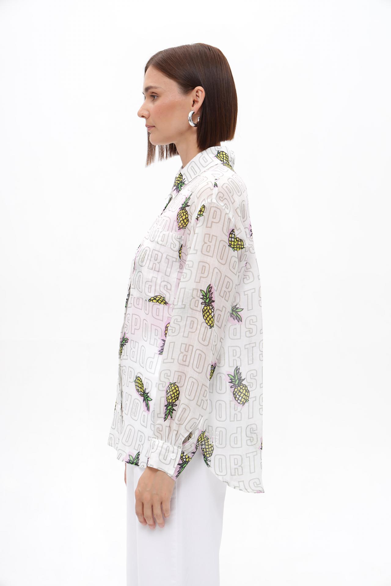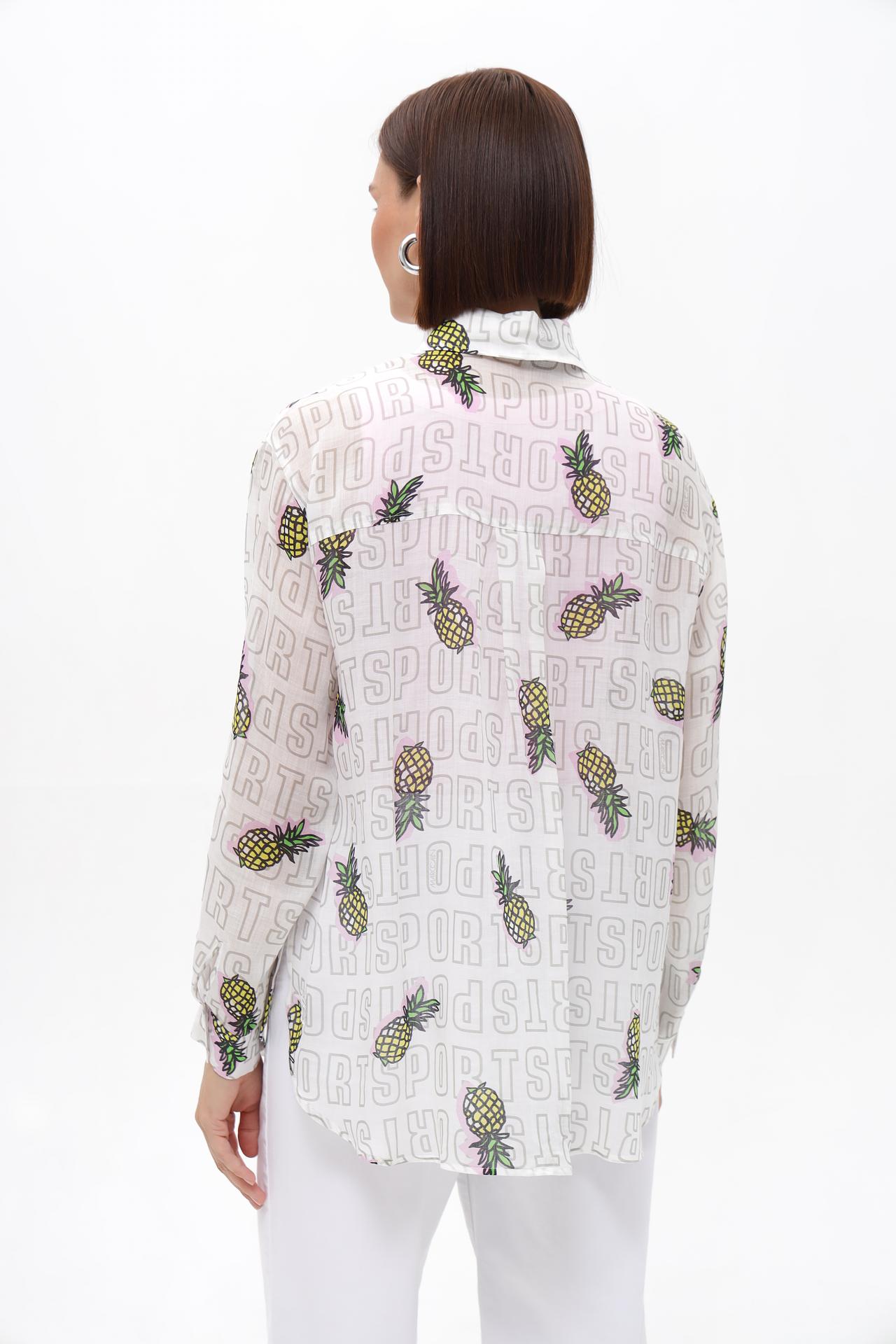 - Дизайн: Оригинальный и запоминающийся принт с повторяющимися надписями "SPORT" и стилизованными изображениями ананасов создает динамичный и игривый образ. Сочетание основного белого фона с яркими элементами принта делает эту блузу заметной деталью любого ансамбля.