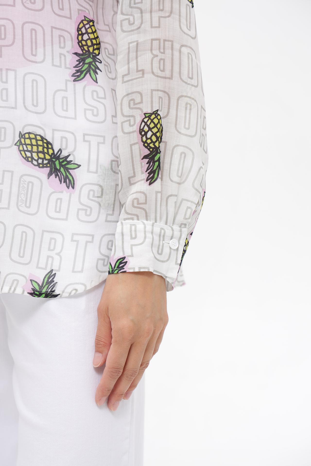 Блуза Marc Cain из 100% рами – это идеальное решение для стильного и комфортного летнего гардероба. Модель прямого кроя с длинными рукавами и классическим воротником украшена уникальным принтом, включающим надписи "SPORT" и яркие ананасы. Легкий и воздухопроницаемый материал обеспечивает приятные ощущения на коже даже в жаркую погоду.