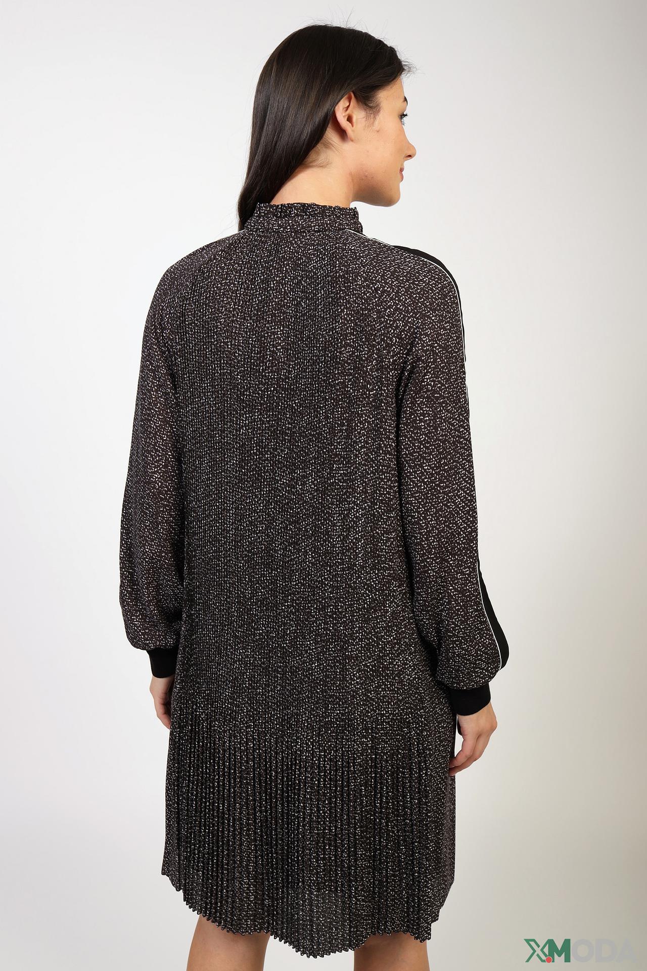 - Дизайн: Платье с принтом в мелкий горошек, воротником-стойкой и разрезом у горловины. Плиссированная юбка и манжеты добавляют изысканности.