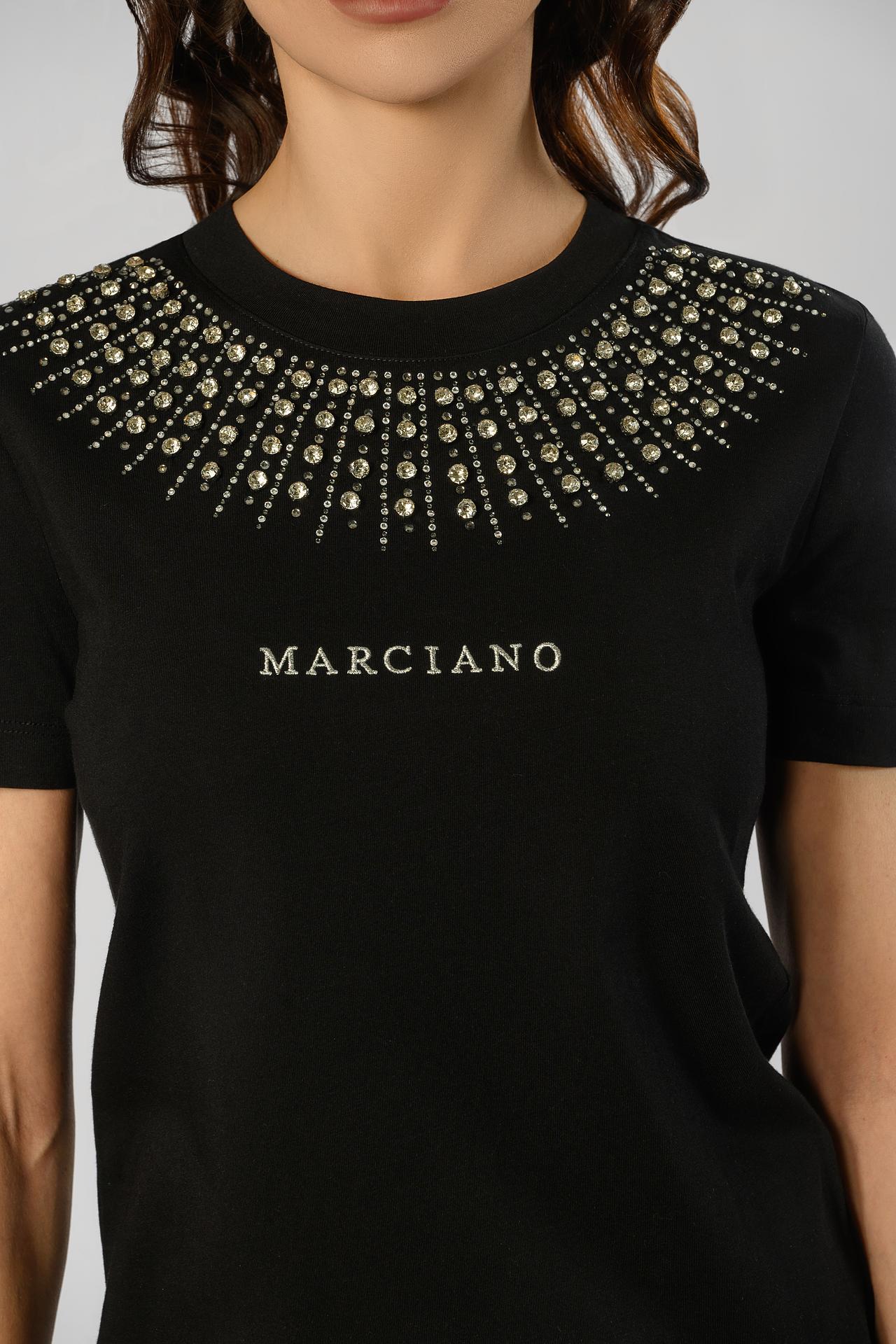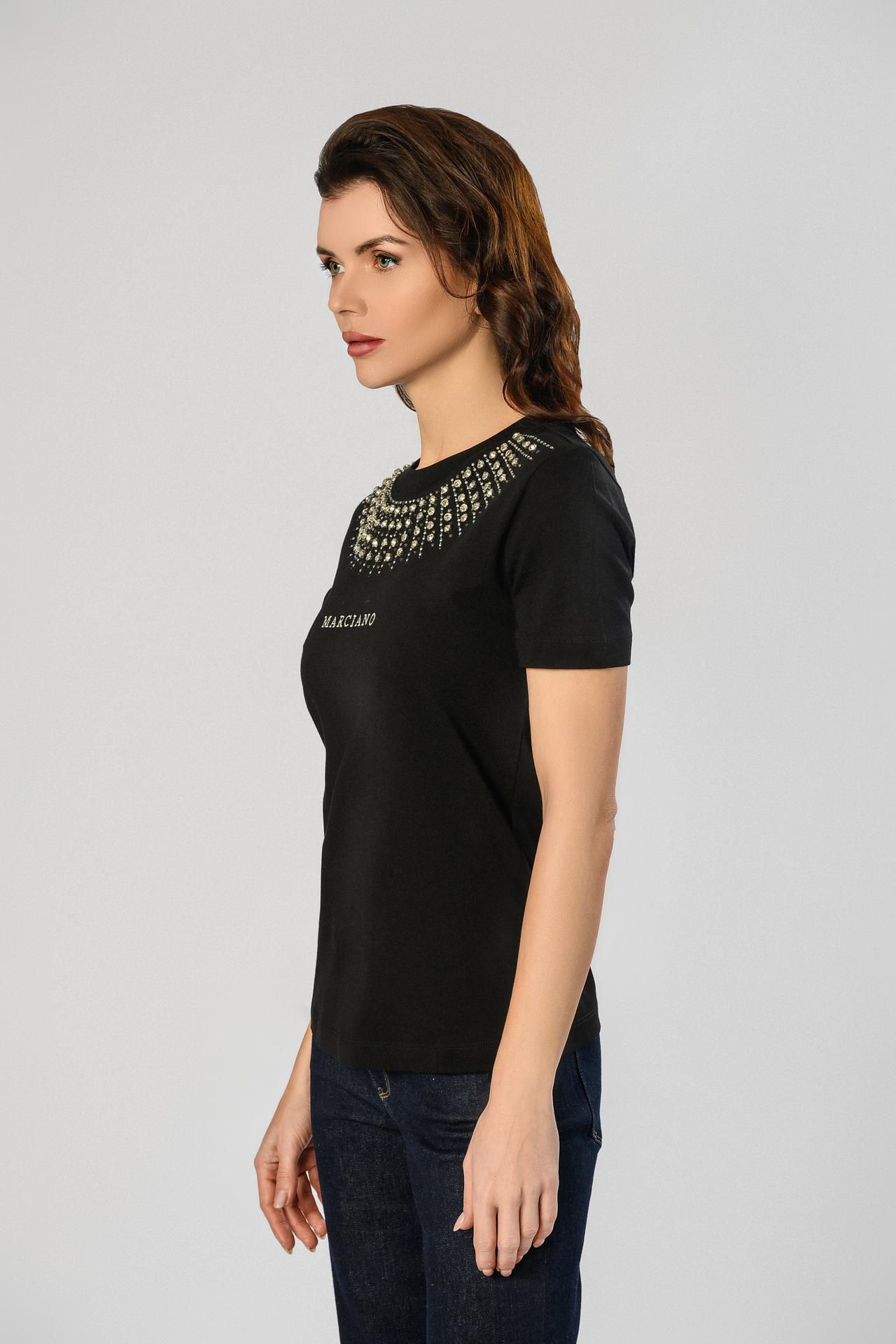 Стильная черная футболка Marciano – идеальный выбор для создания элегантных повседневных образов. Модель украшена эффектным декором из страз в области воротника, который придает изделию изысканность и сияние. Футбoлка с коротким рукавом и круглым вырезом гарантирует комфорт в течение всего дня.
