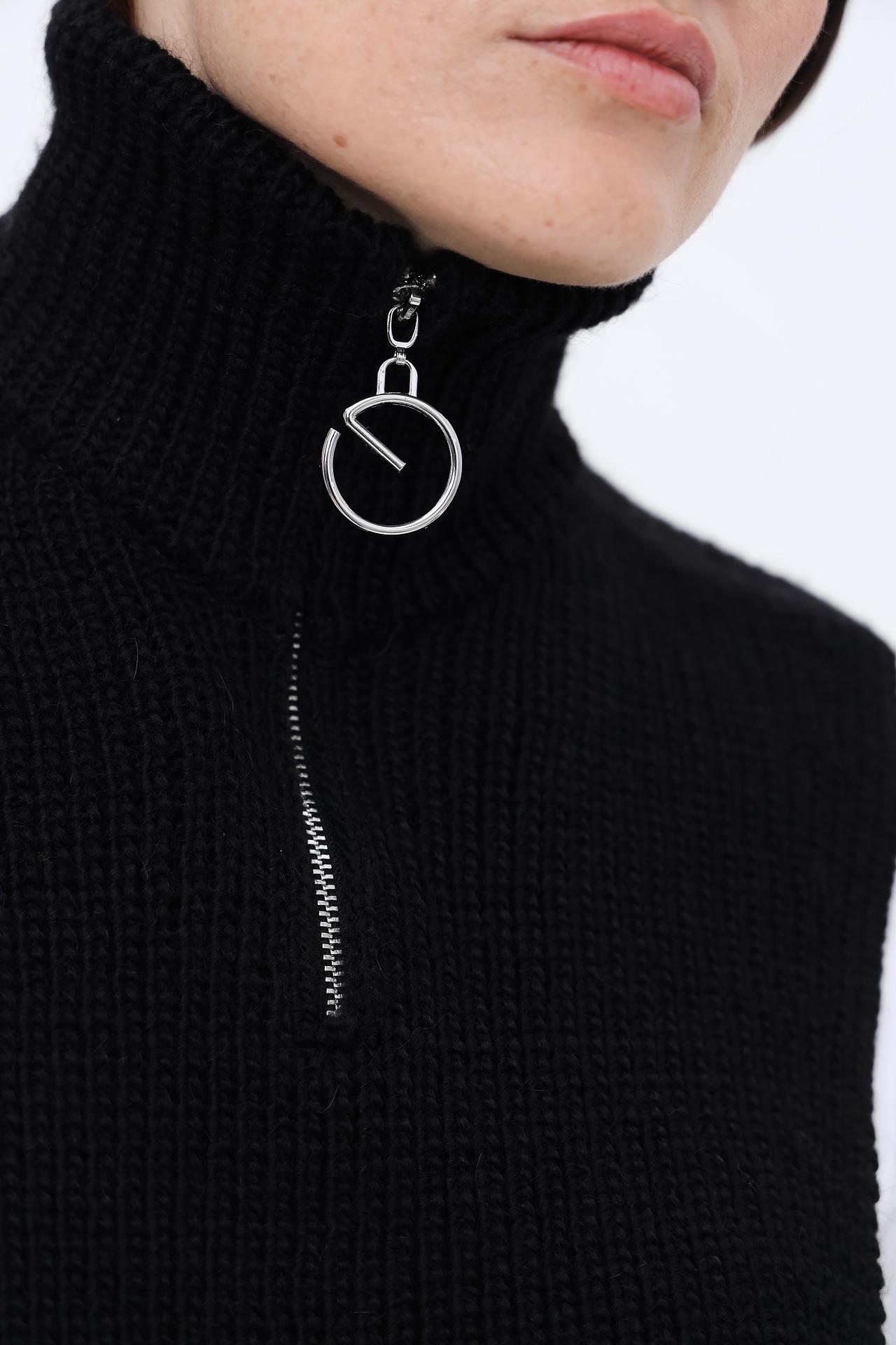 Идеально подходит для создания модных и уютных образов. Состав пряжи (50% шерсть, 40% акрил, 10% альпака) гарантирует долговечность и практичность изделия. Манишка декорирована молнией и оригинальной подвеской.