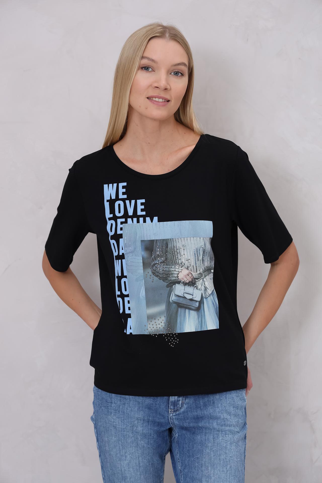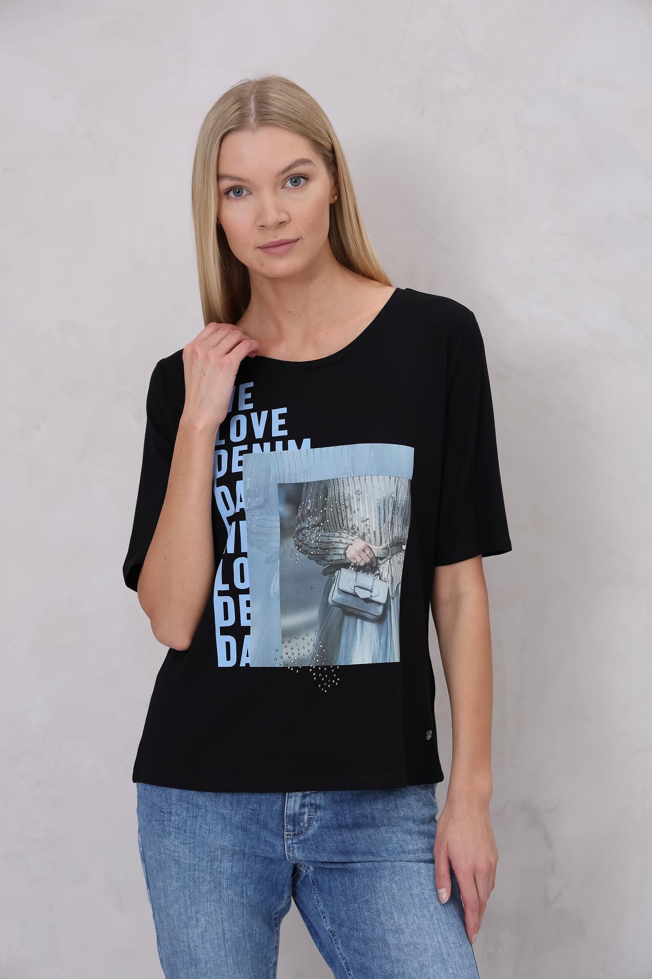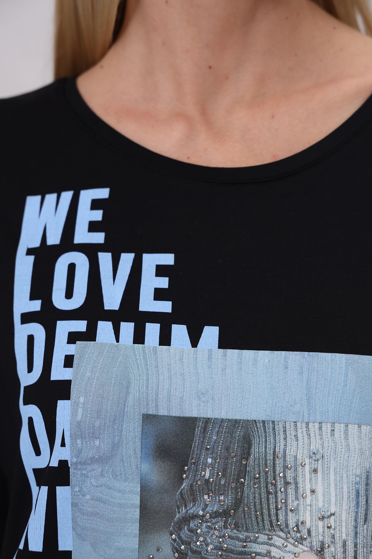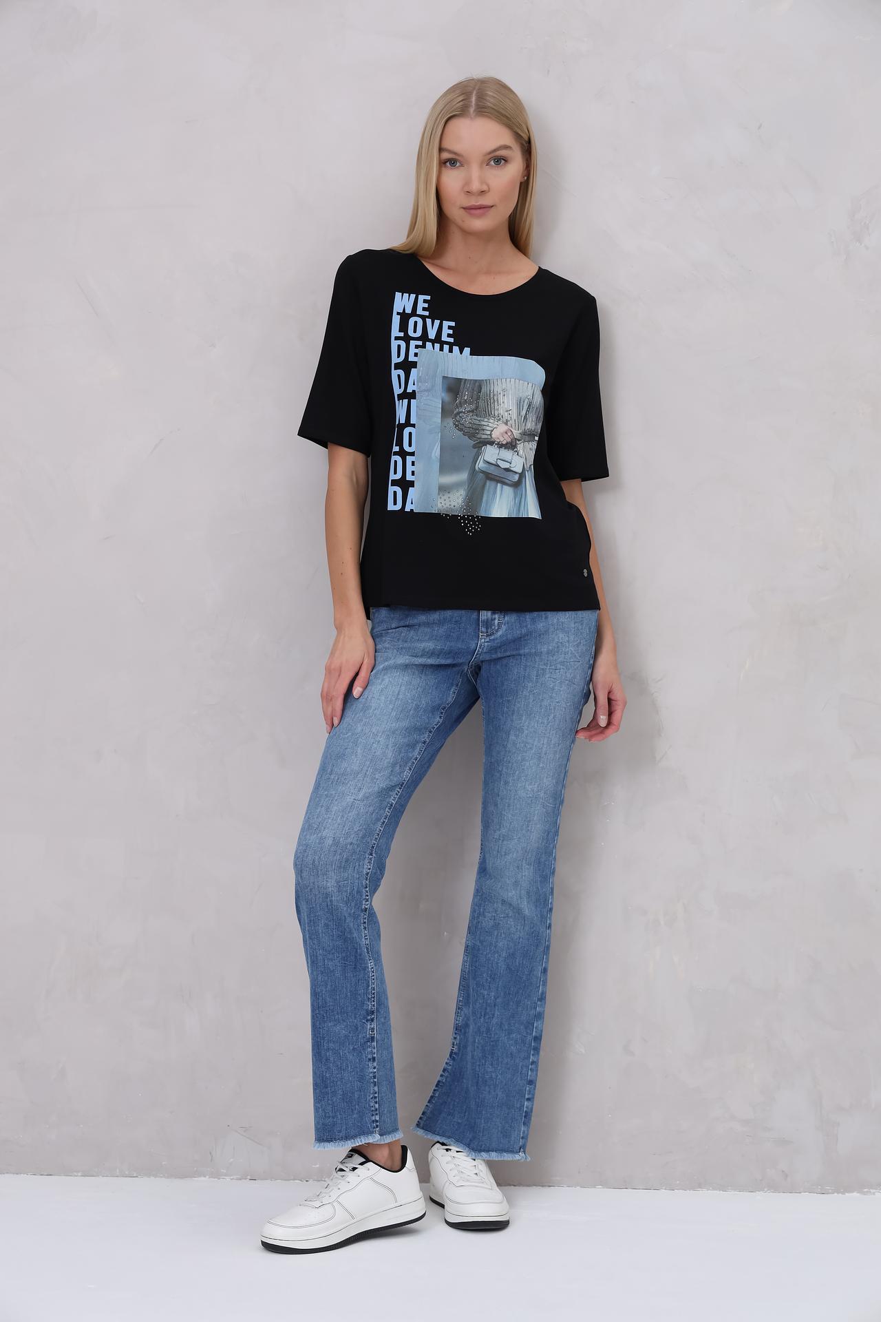 Элегантная футболка Monari станет базой для множества стильных образов. Модель выполнена из высококачественной ткани, которая обеспечивает комфорт и приятные тактильные ощущения. Оригинальный принт с надписью "WE LOVE DENIM" и изображение модного образа, украшенное стразами, добавляют изделию актуальности и изысканности. Эта футболка идеально сочетается с джинсами и юбками, позволяя создавать разнообразные повседневные и вечерние наряды.