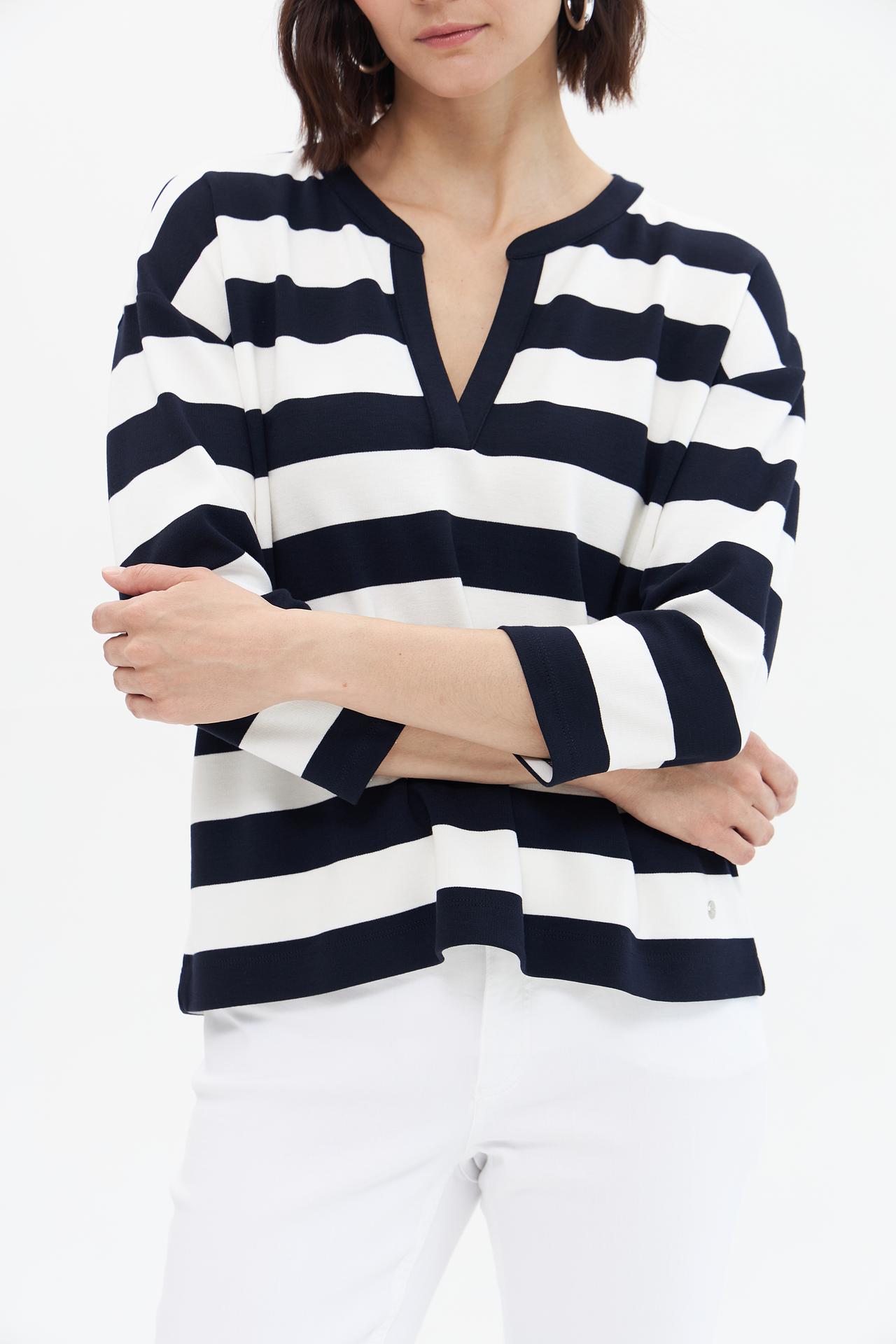 Оцените комфорт и стиль с этим элегантным лонгсливом от Monari. Изготовленный из мягкой и эластичной ткани (5% эластан, 80% вискоза, 15% полиэстер), он идеально подходит для создания непринужденных, но изысканных образов. Полосатый дизайн придает образу свежесть и динамичность, а V-образный вырез горловины добавляет женственности.
