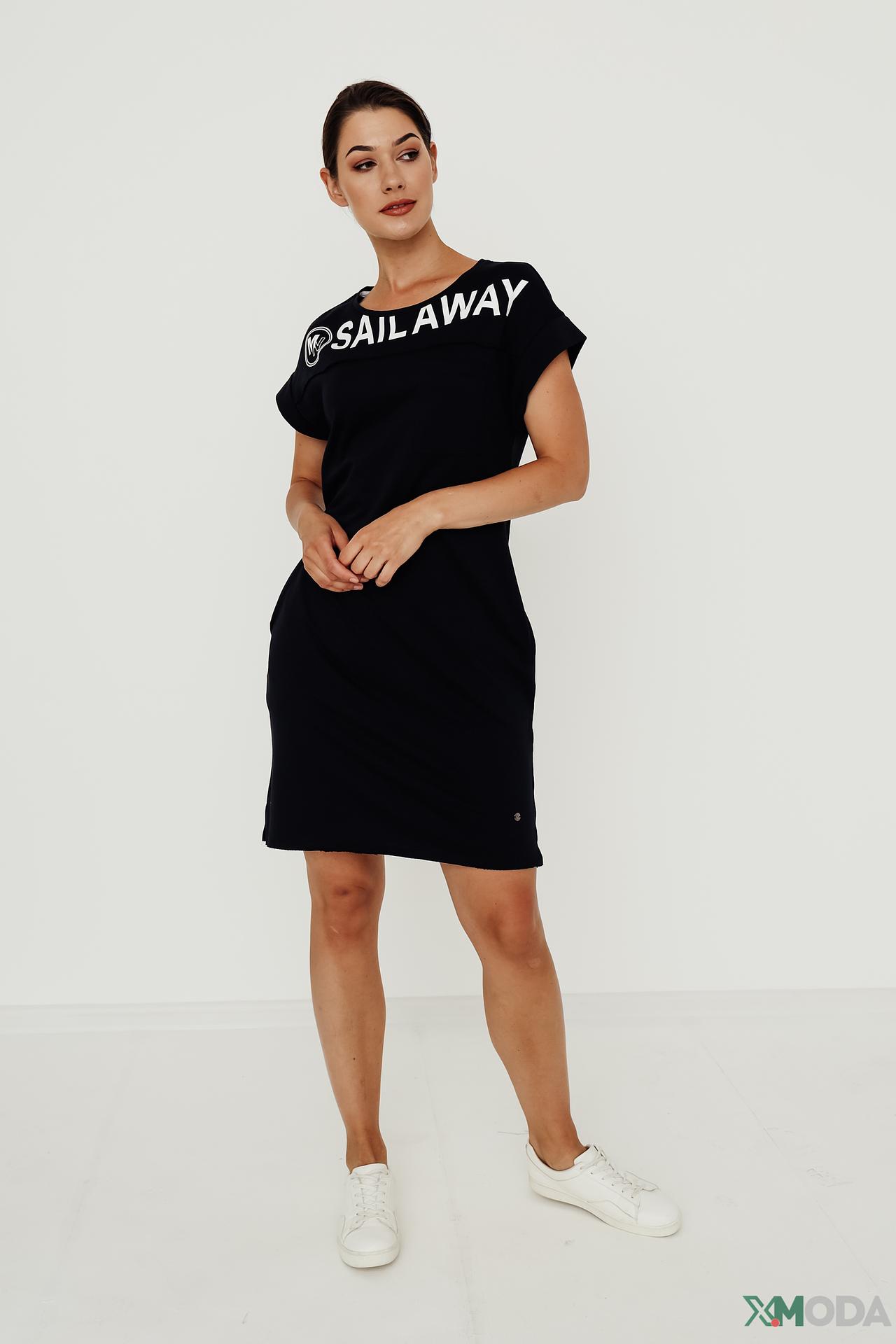 - Декор: Оригинальный принт "SAIL AWAY" на груди в контрастном белом цвете добавляет платью динамичности и характера.