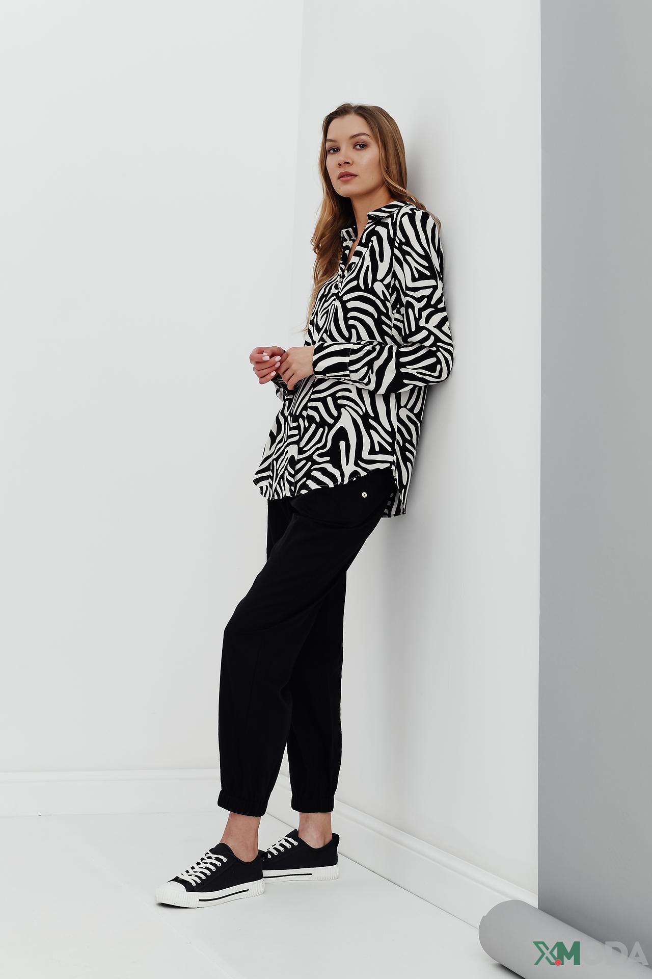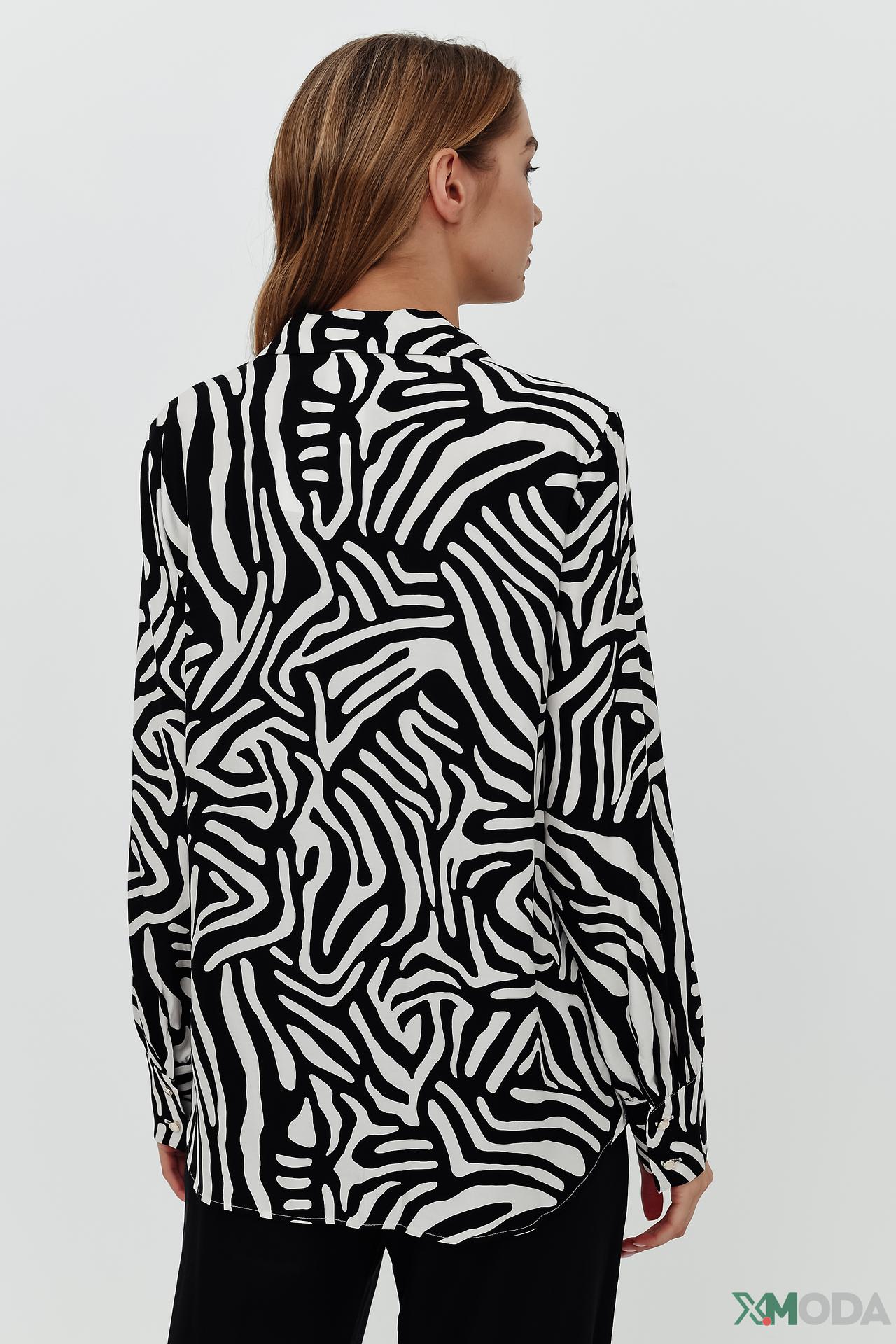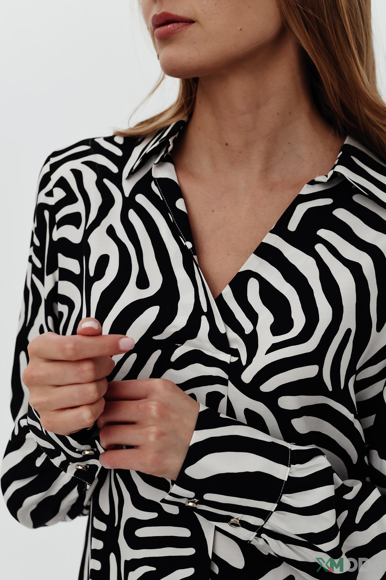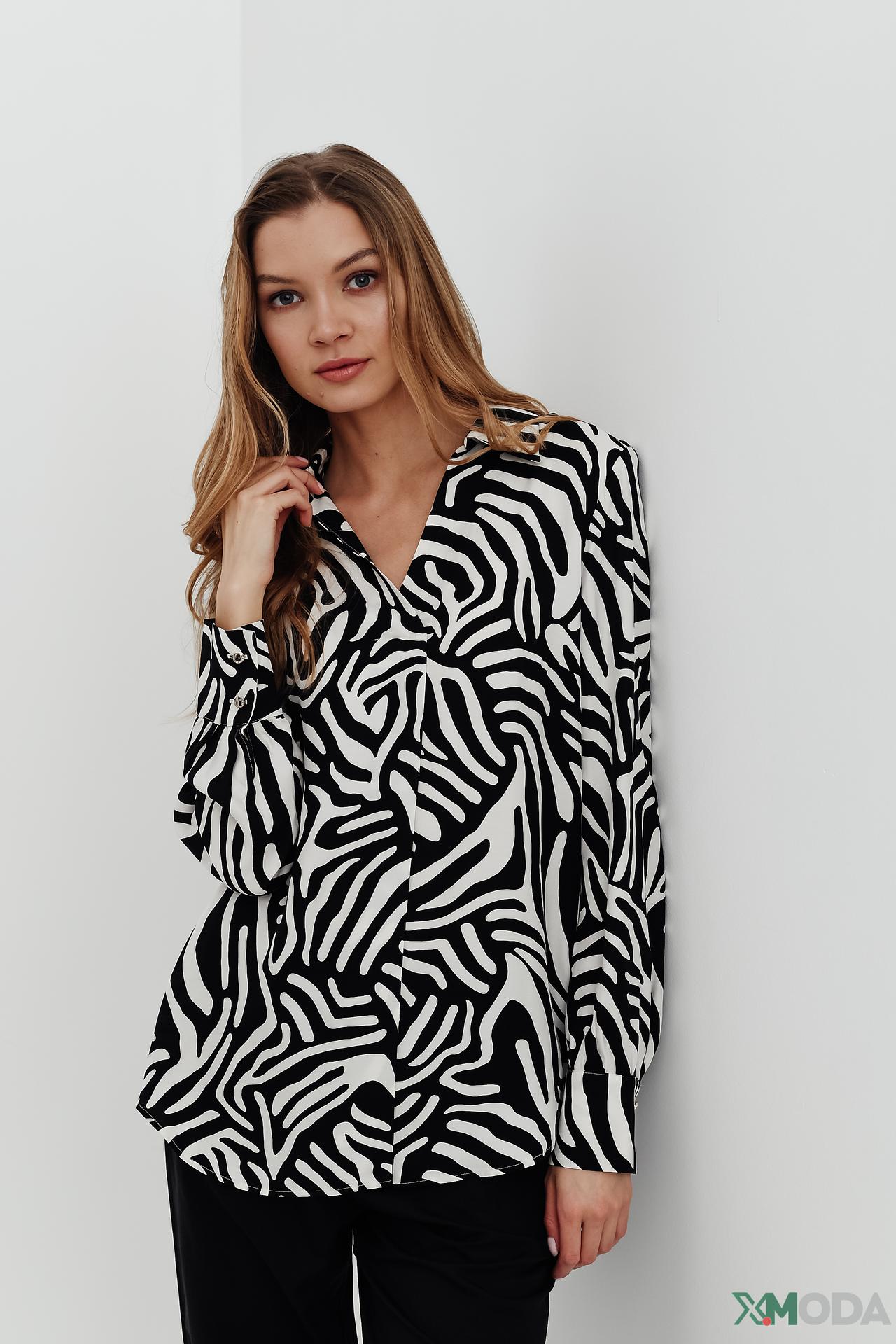 - Дизайн: Блуза украшена узнаваемым принтом «зебра», который придает образу динамичность и выразительность. Классический воротник и длинные рукава добавляют элегантности.