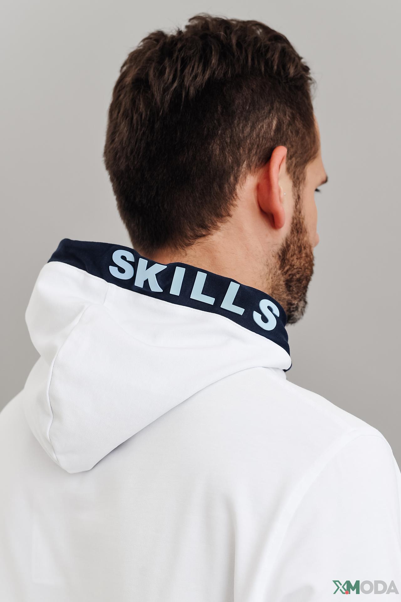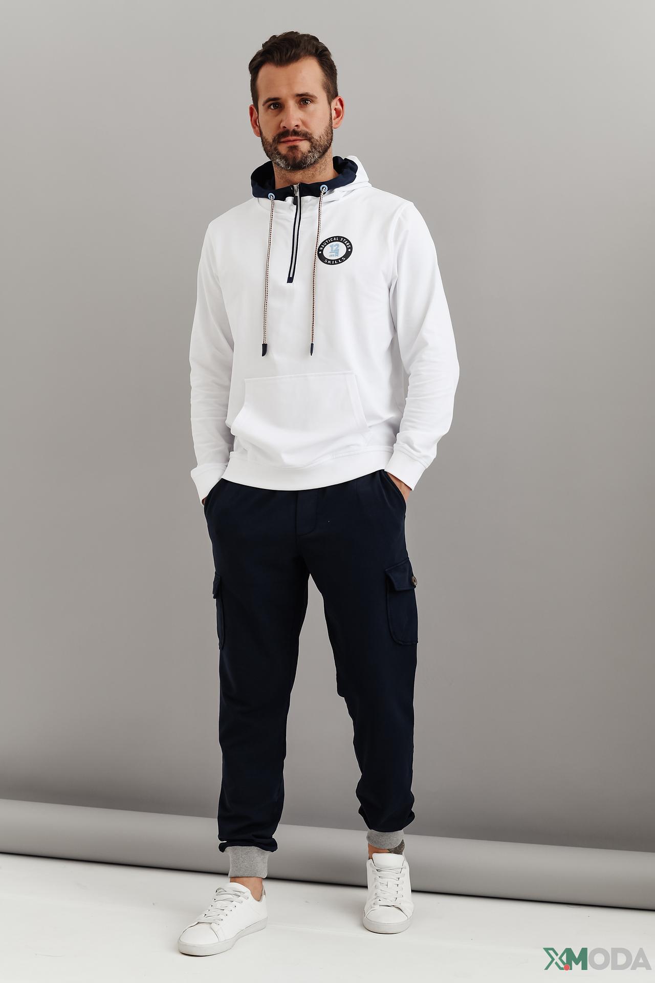 - Дизайн и стиль: Классический белый цвет дополнен контрастными синими элементами в капюшоне и на молнии, а также оригинальной нашивкой на груди. Акцентные шнурки с цветными вкраплениями придают модели динамичный и модный вид.