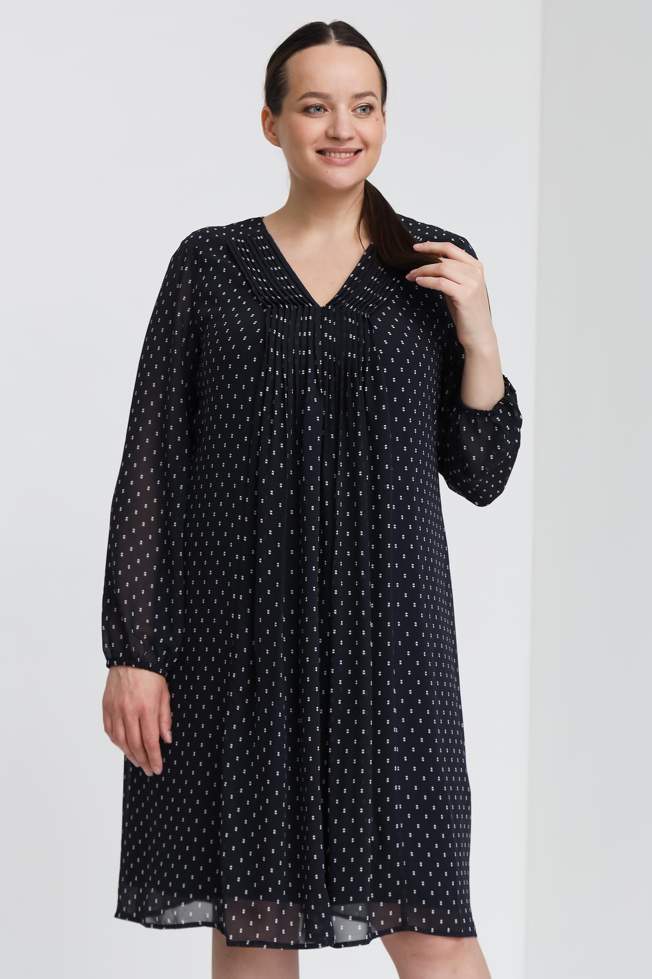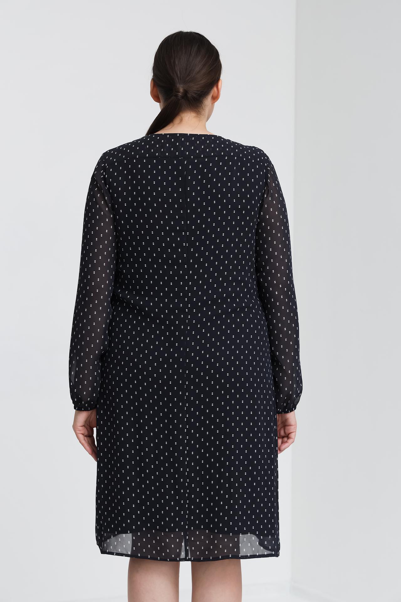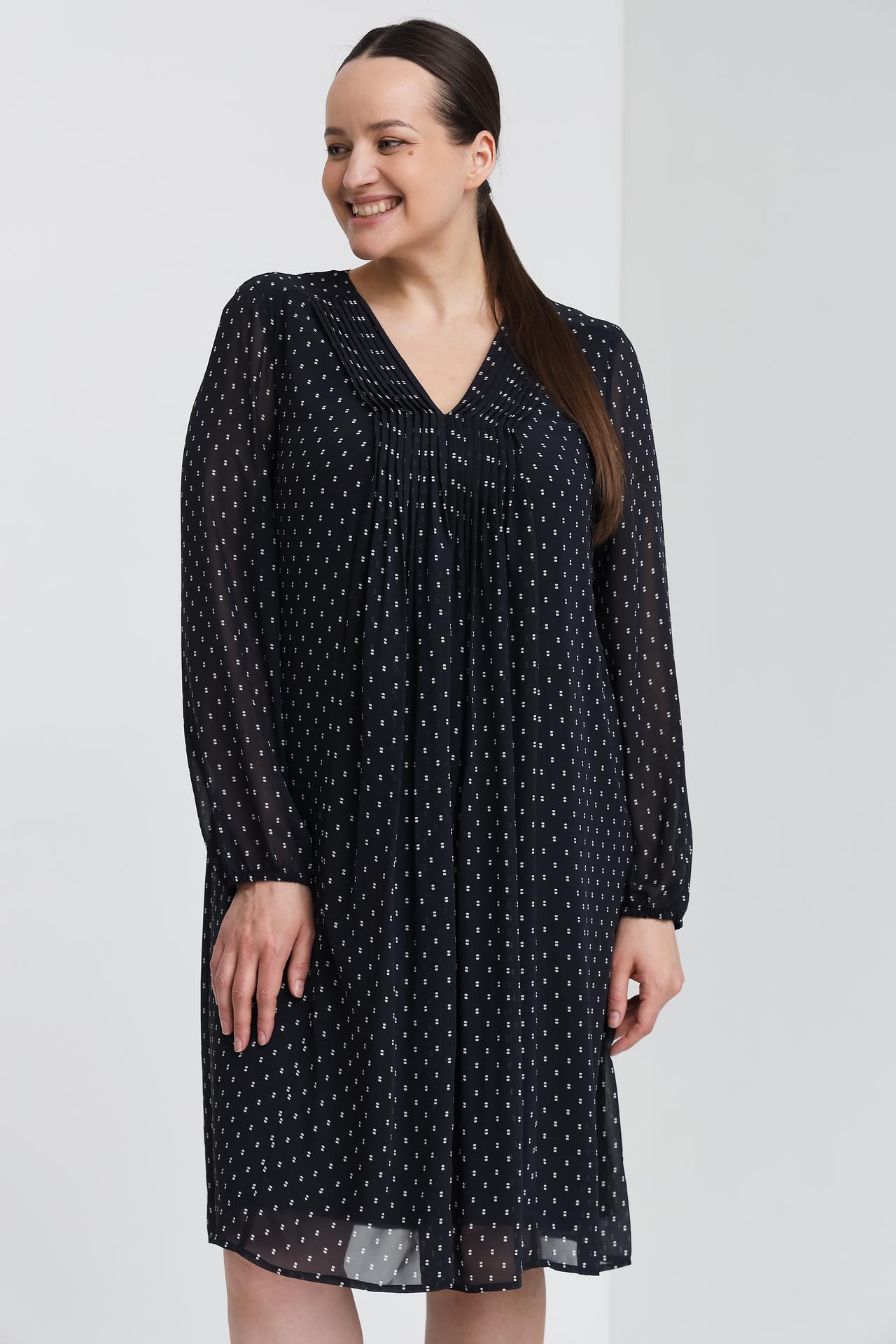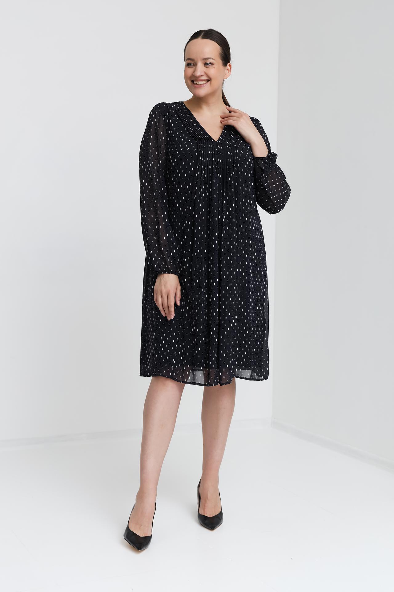 Дизайн платья привлекает внимание V-образным вырезом и изящными складками, которые создают женственный силуэт. Мелкий белый принт на тёмном фоне добавляет образу утонченности и стиля. Длинные рукава и оптимальная длина до колена делают платье универсальным для различных случаев.