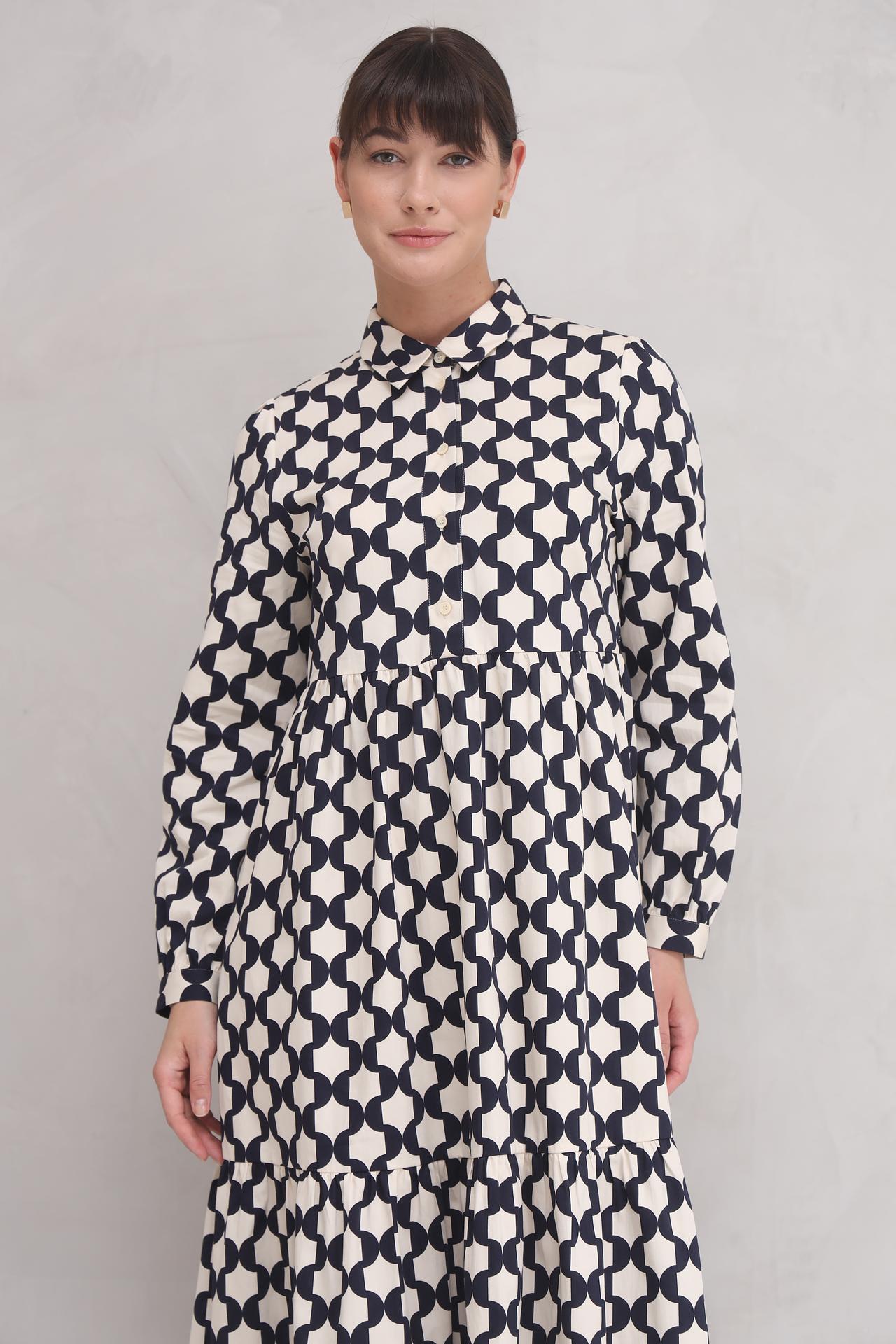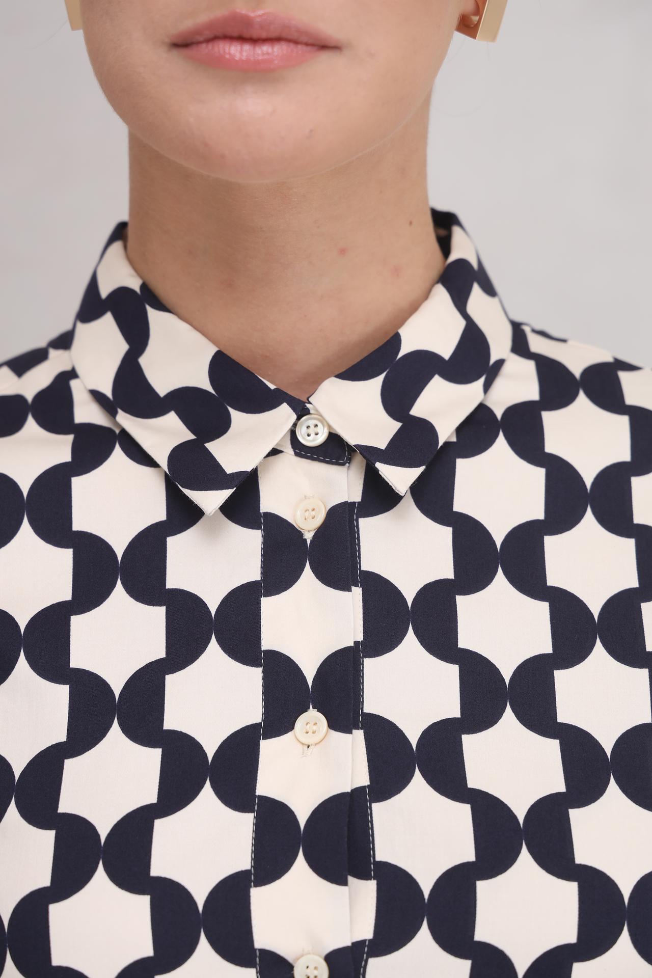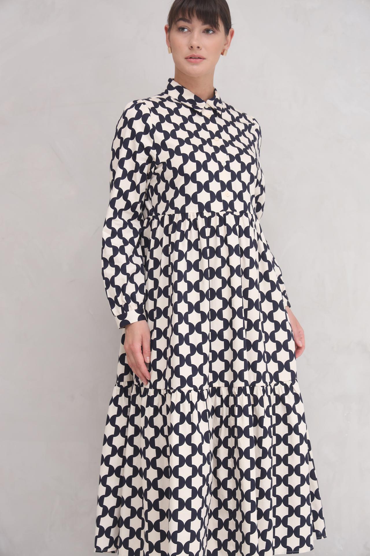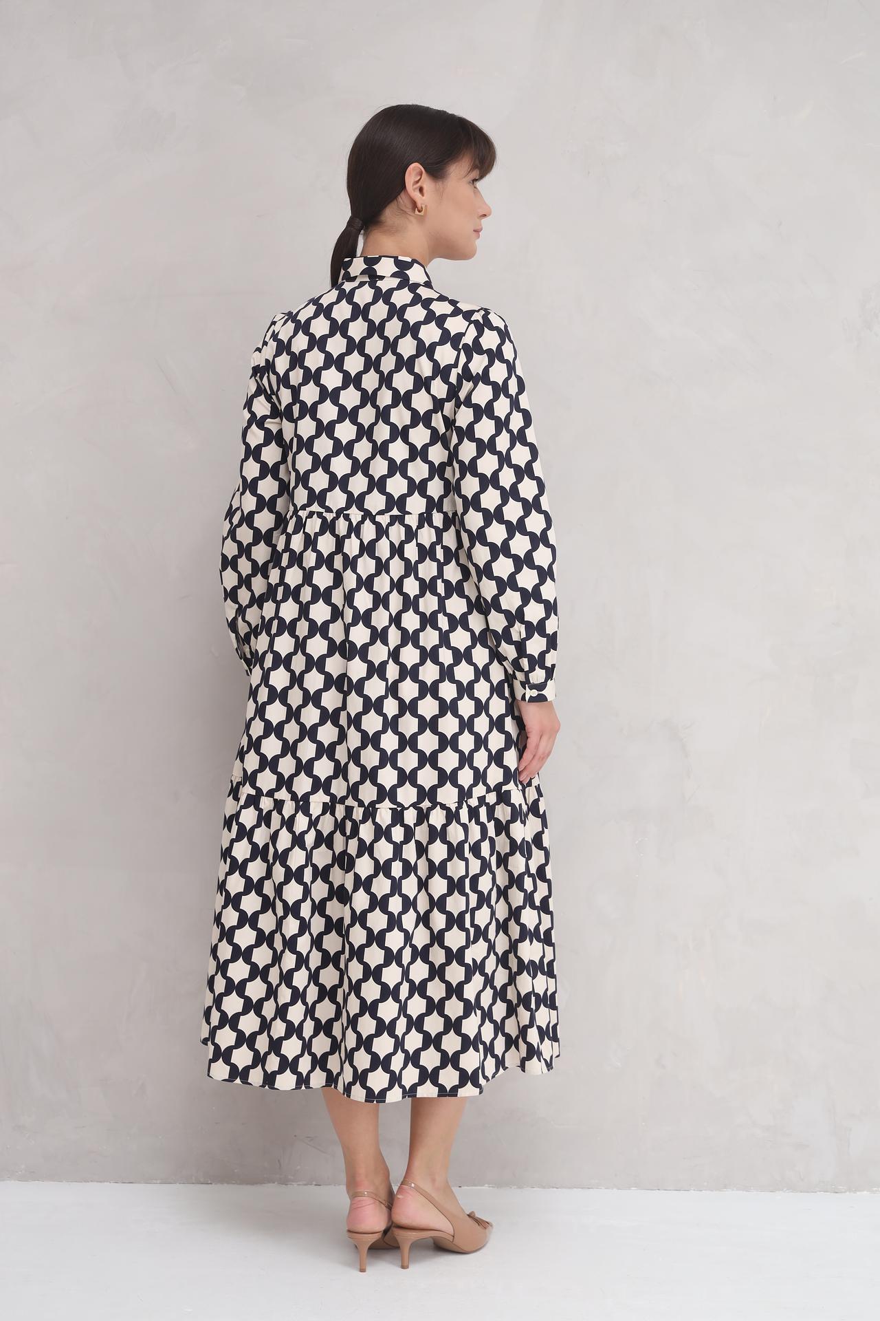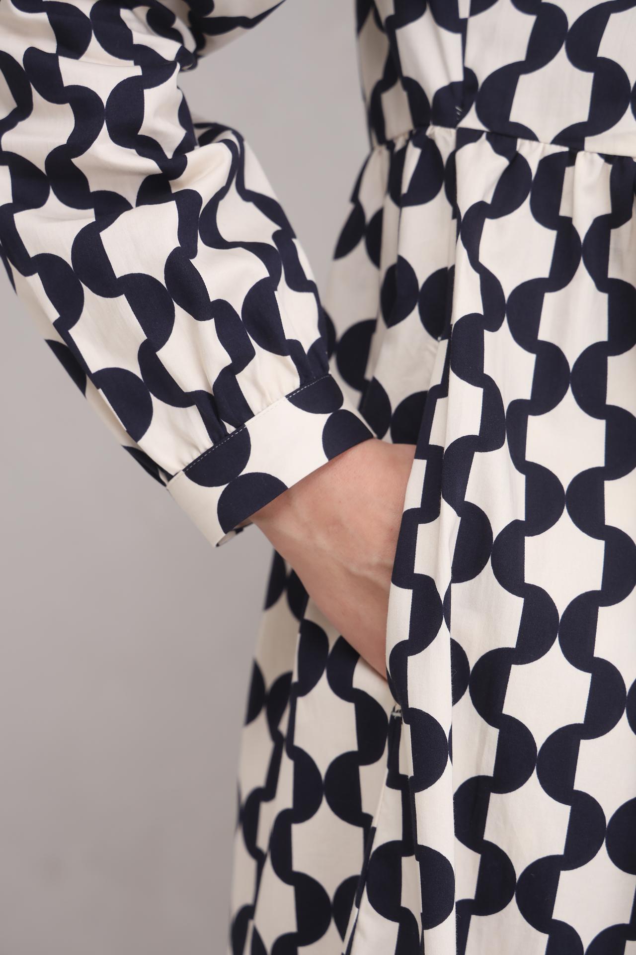 Дизайн платья продуман до мелочей. Темно-синий и белый геометрический принт выглядит эффектно и современно. Классический крой платья подчеркнет достоинства фигуры, а мягкие ткани обеспечат идеальную посадку.