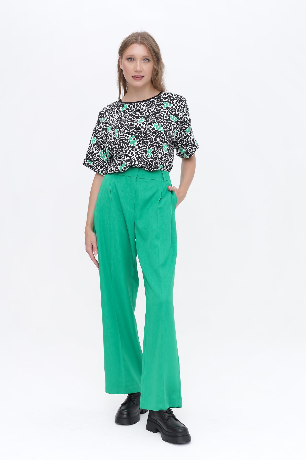 Блуза отлично сочетается как с классическими брюками, так и с джинсами, позволяя создавать разнообразные комплекты для работы, встреч с друзьями или прогулок по городу. Свободный крой не сковывает движения, а короткий рукав с отворотом добавляет образу непринужденности.
