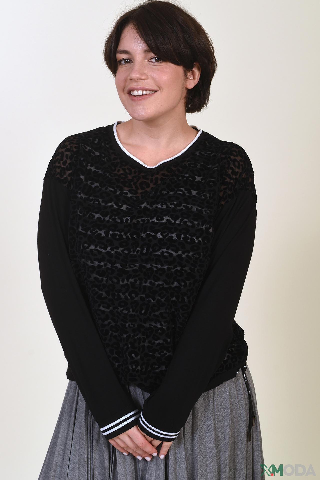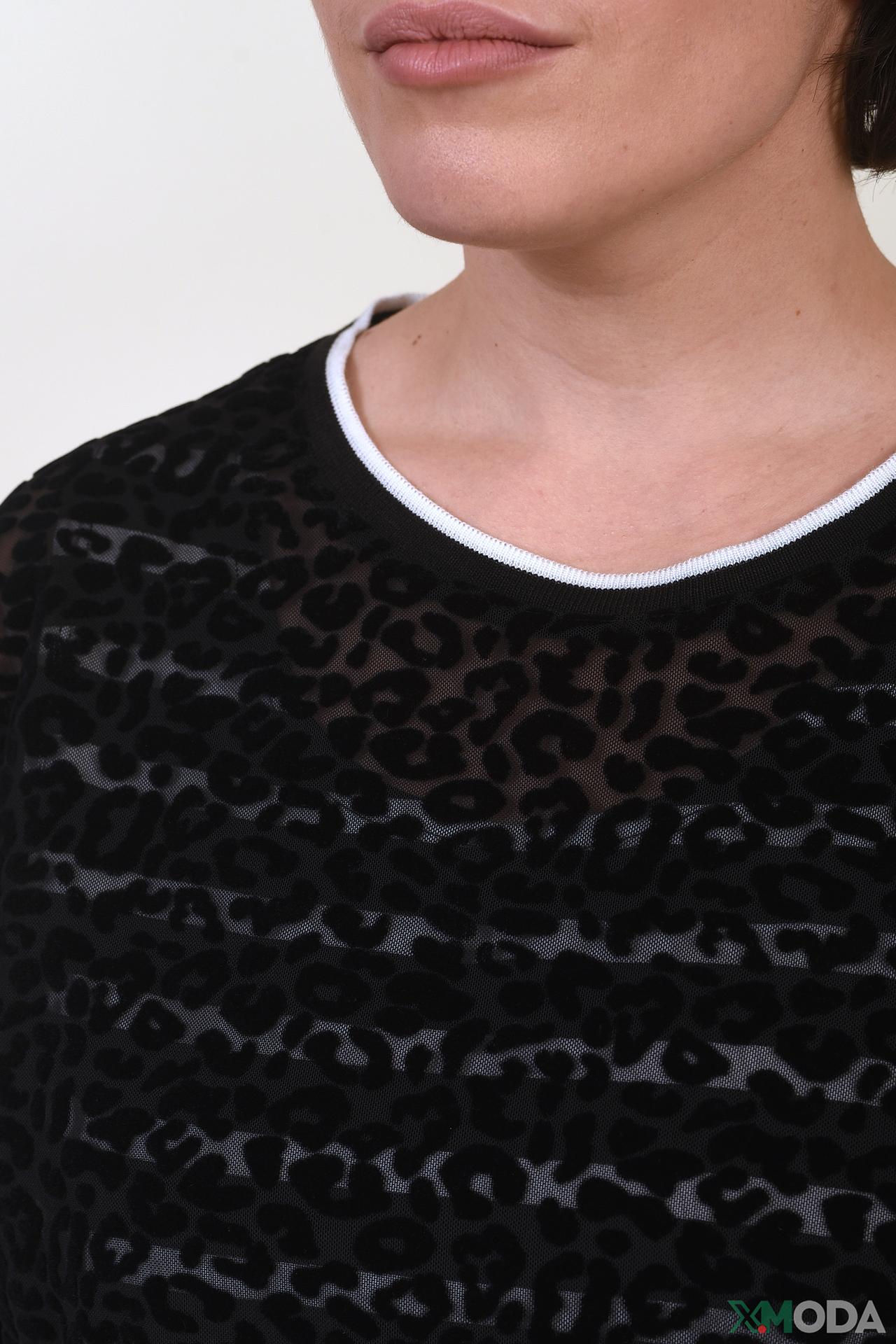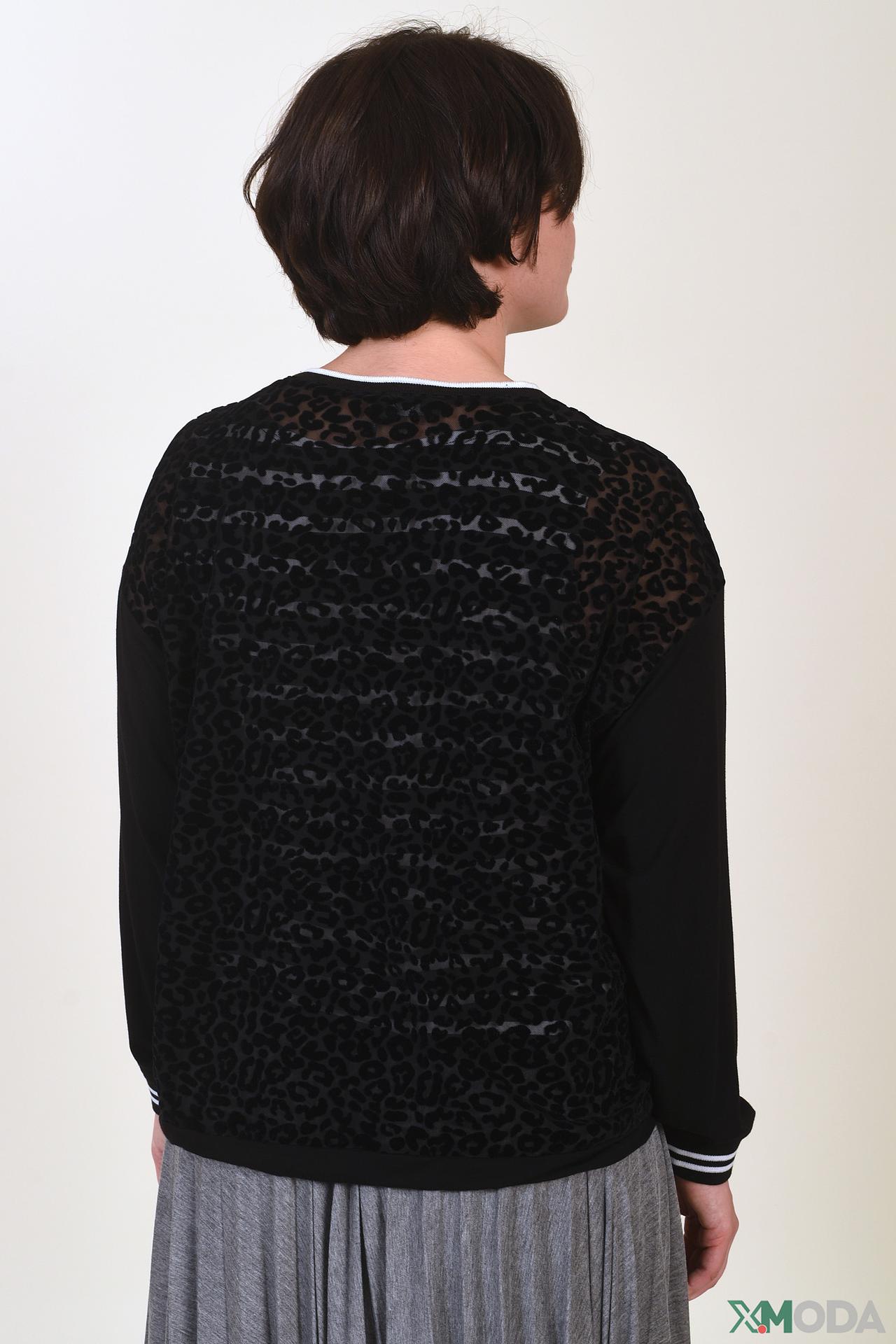 - Дизайн: Классический крой с длинными рукавами и V-образным вырезом. Прозрачная вставка с леопардовым принтом на груди и спине создает эффектный акцент.