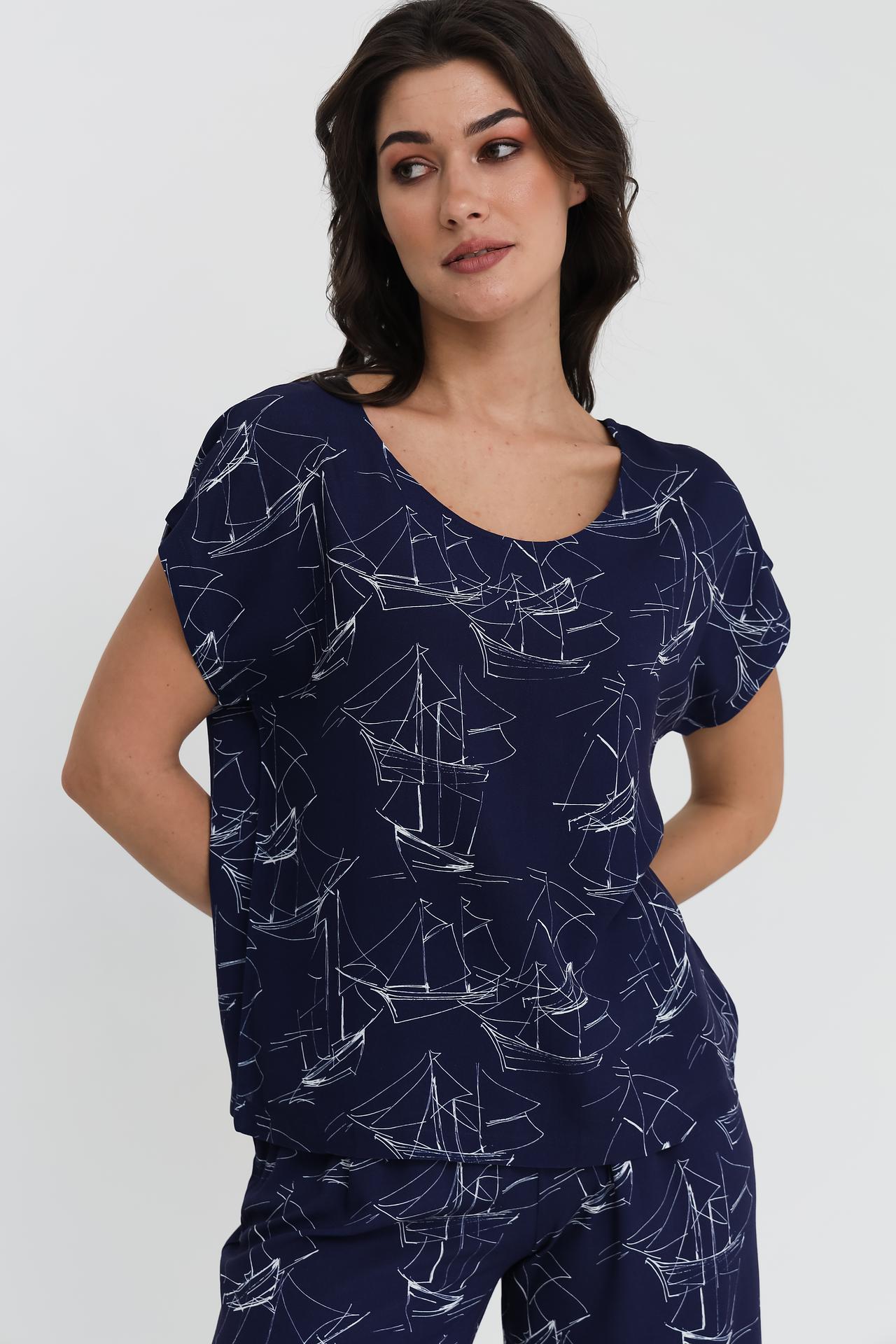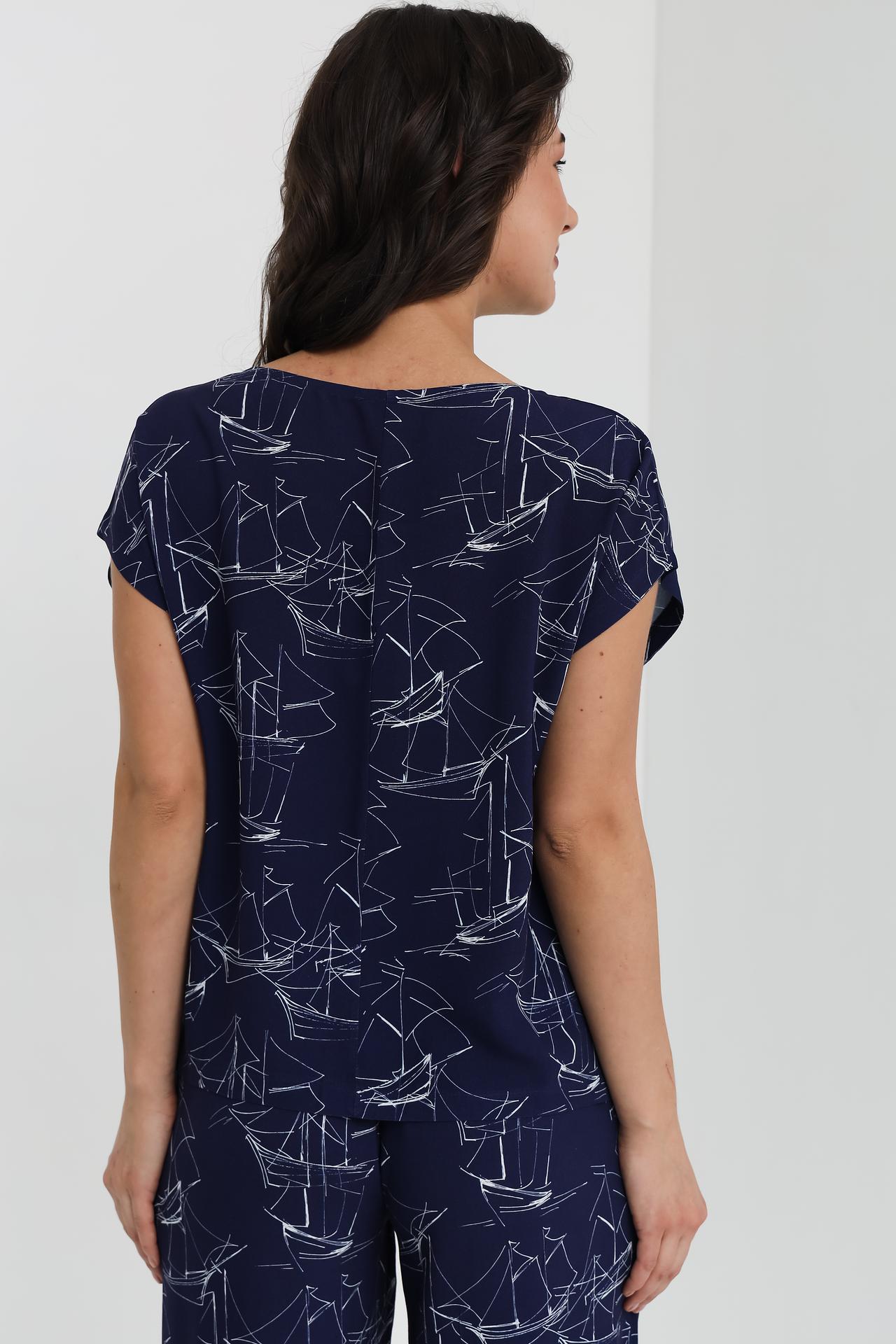 Насыщенный синий цвет в сочетании с оригинальным принтом в виде парусников создает образ, полный морской романтики и элегантности. Эта блуза идеально подходит как для повседневных образов, так и для создания более нарядных комплектов.