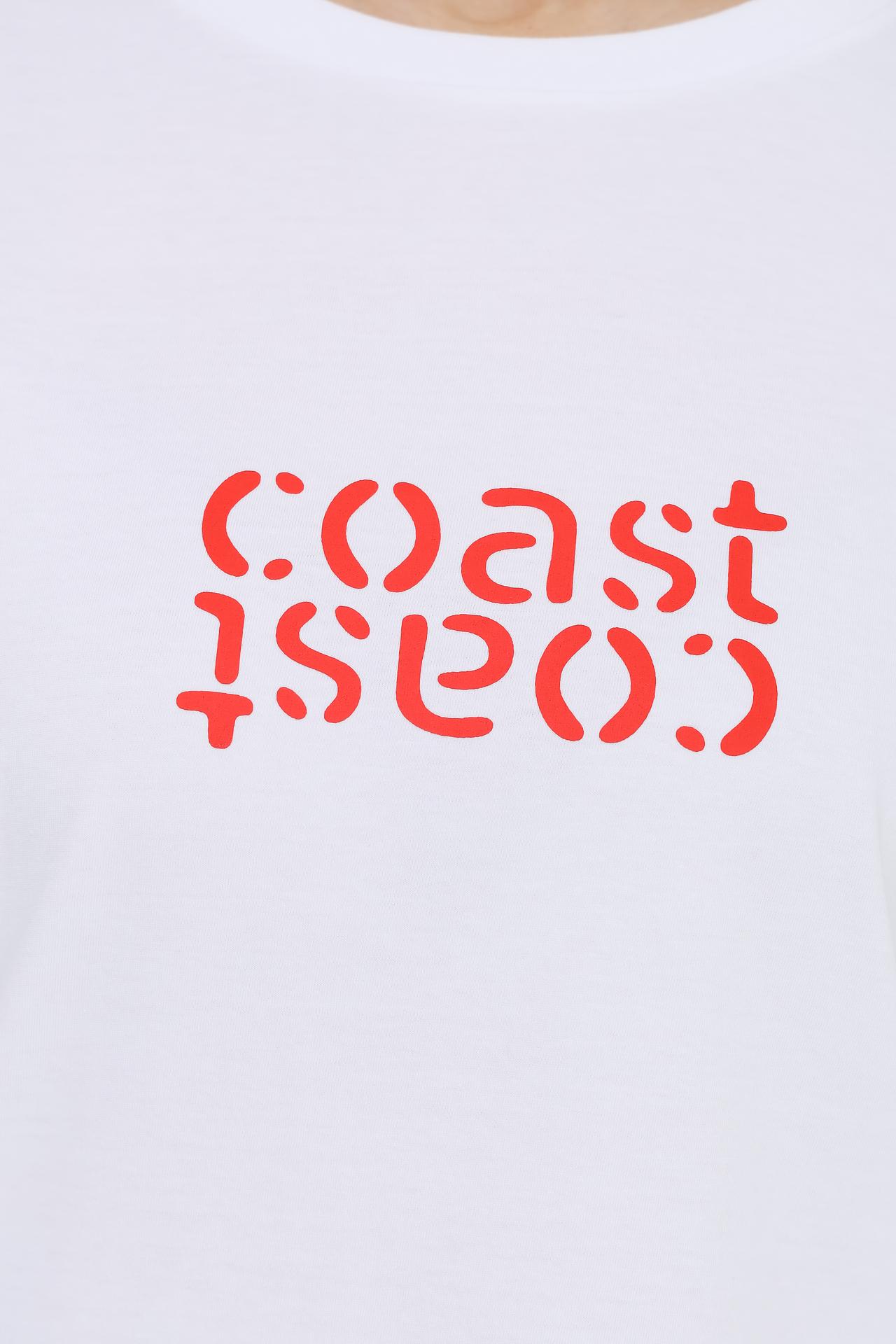 - Стильный дизайн. Классический белый цвет и оригинальный красный принт "coast" создают современный и непринужденный образ. Рукава с отворотами добавляют стильную деталь.