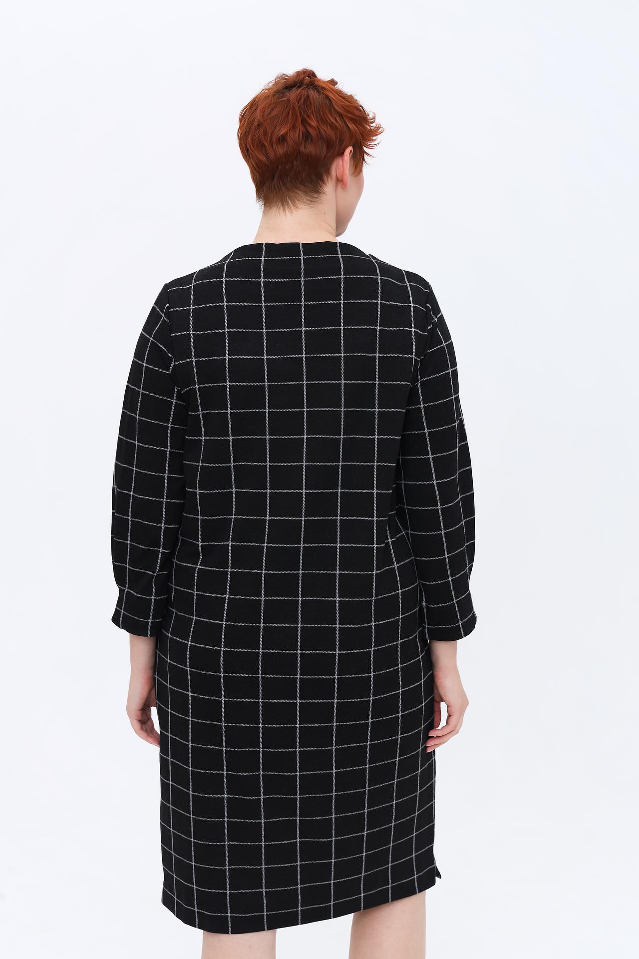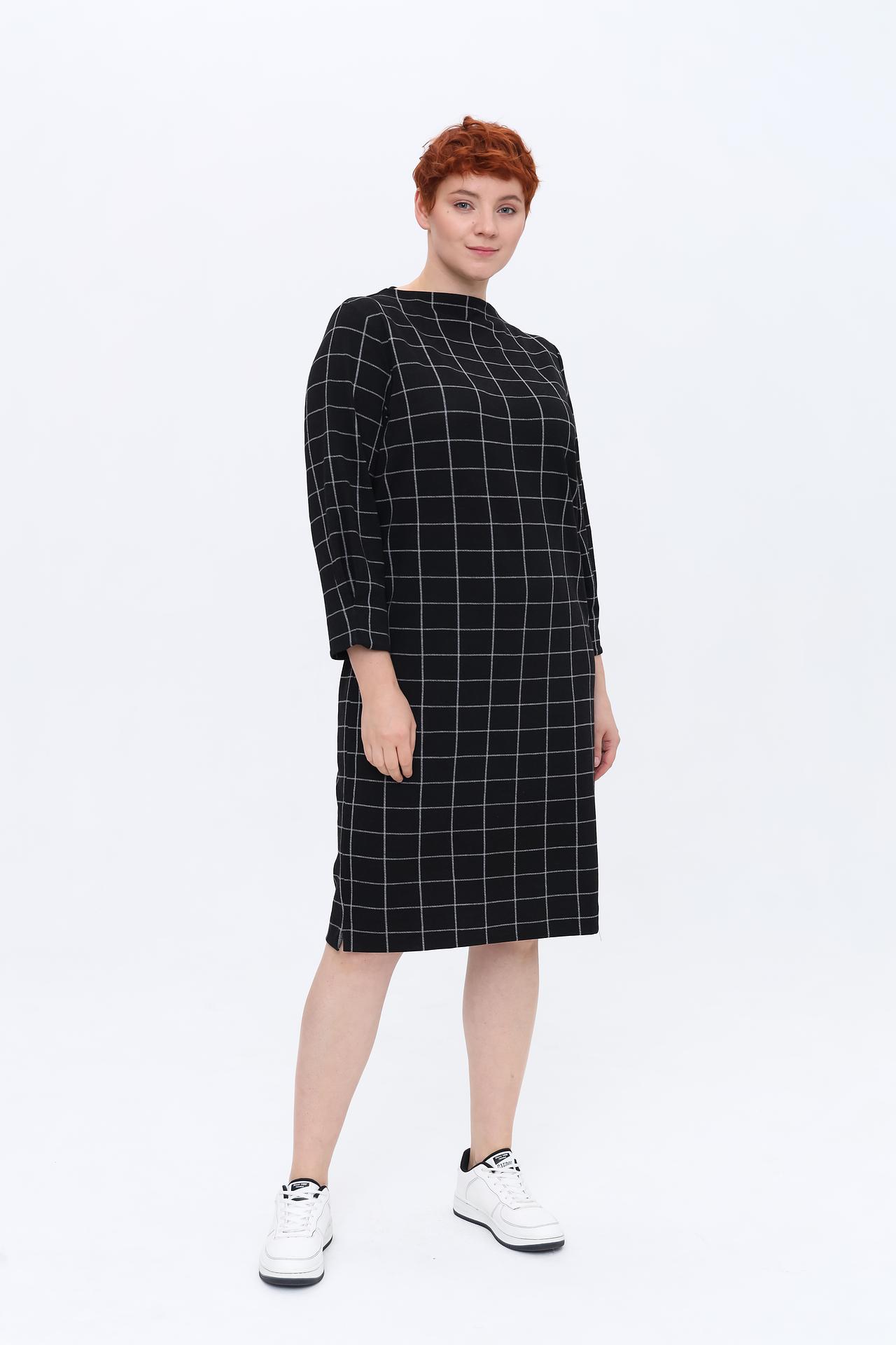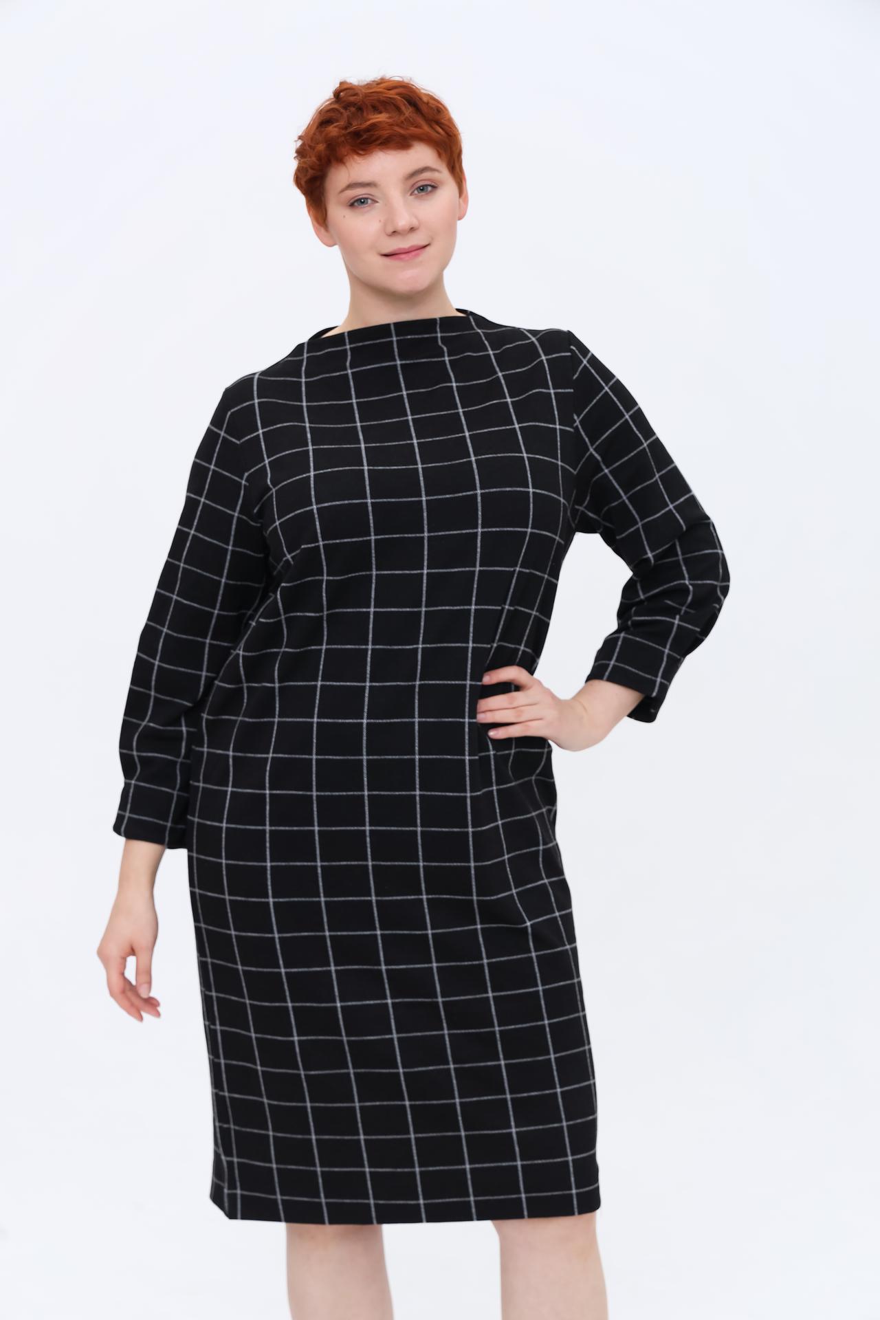 - Дизайн: Классическое платье прямого силуэта в черно-серую клетку. Круглый вырез горловины и рукав длиной три четверти создают лаконичный и элегантный образ.