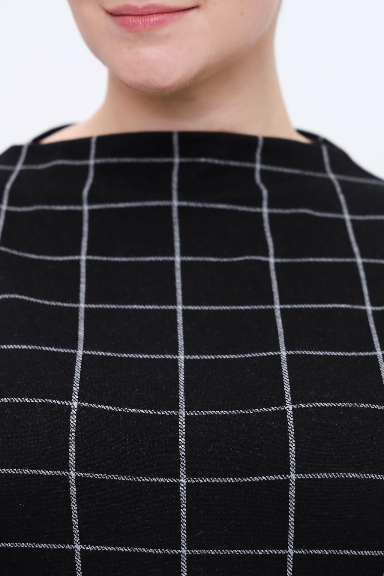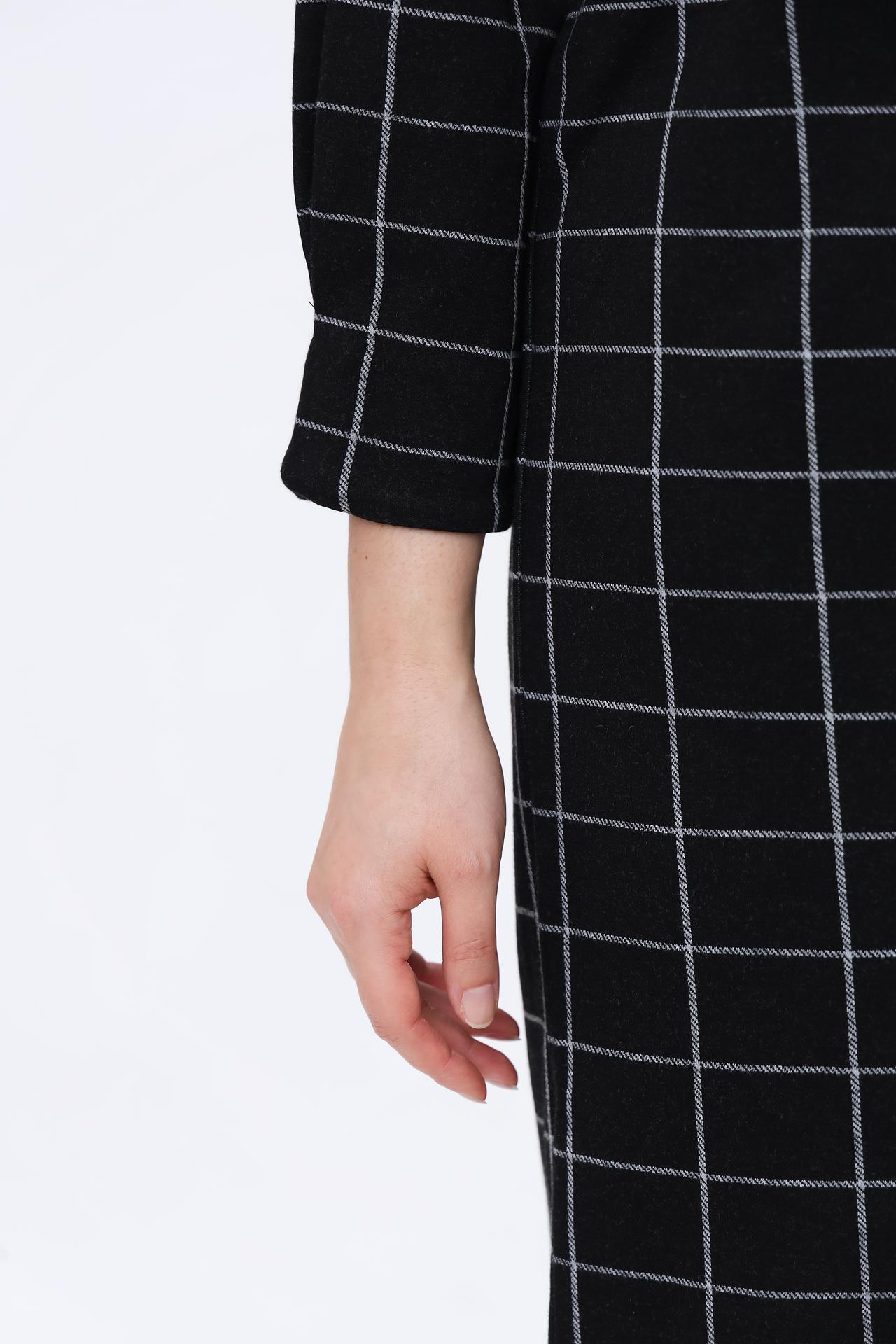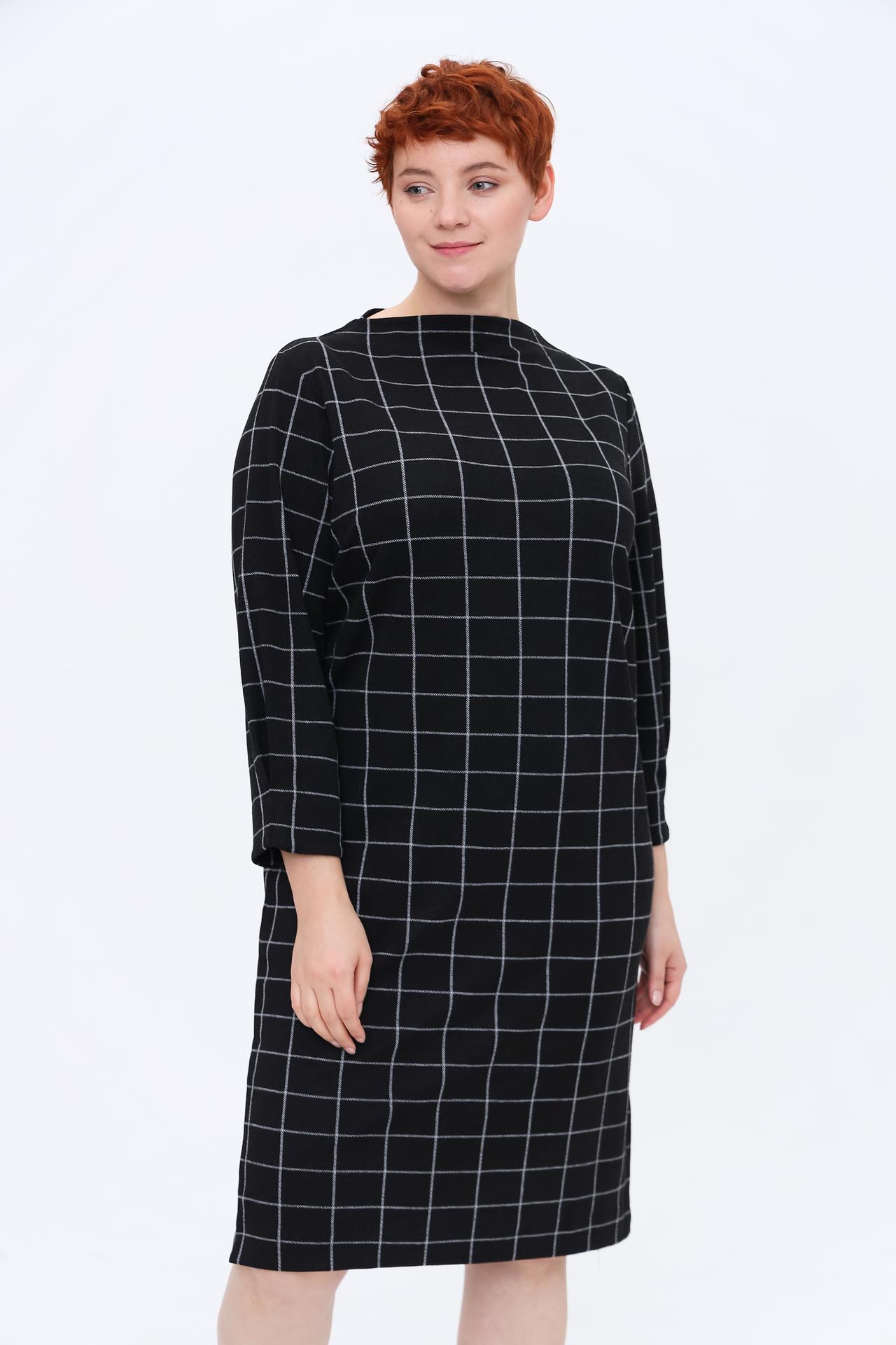 - Дизайн: Классическое платье прямого силуэта в черно-серую клетку. Круглый вырез горловины и рукав длиной три четверти создают лаконичный и элегантный образ.