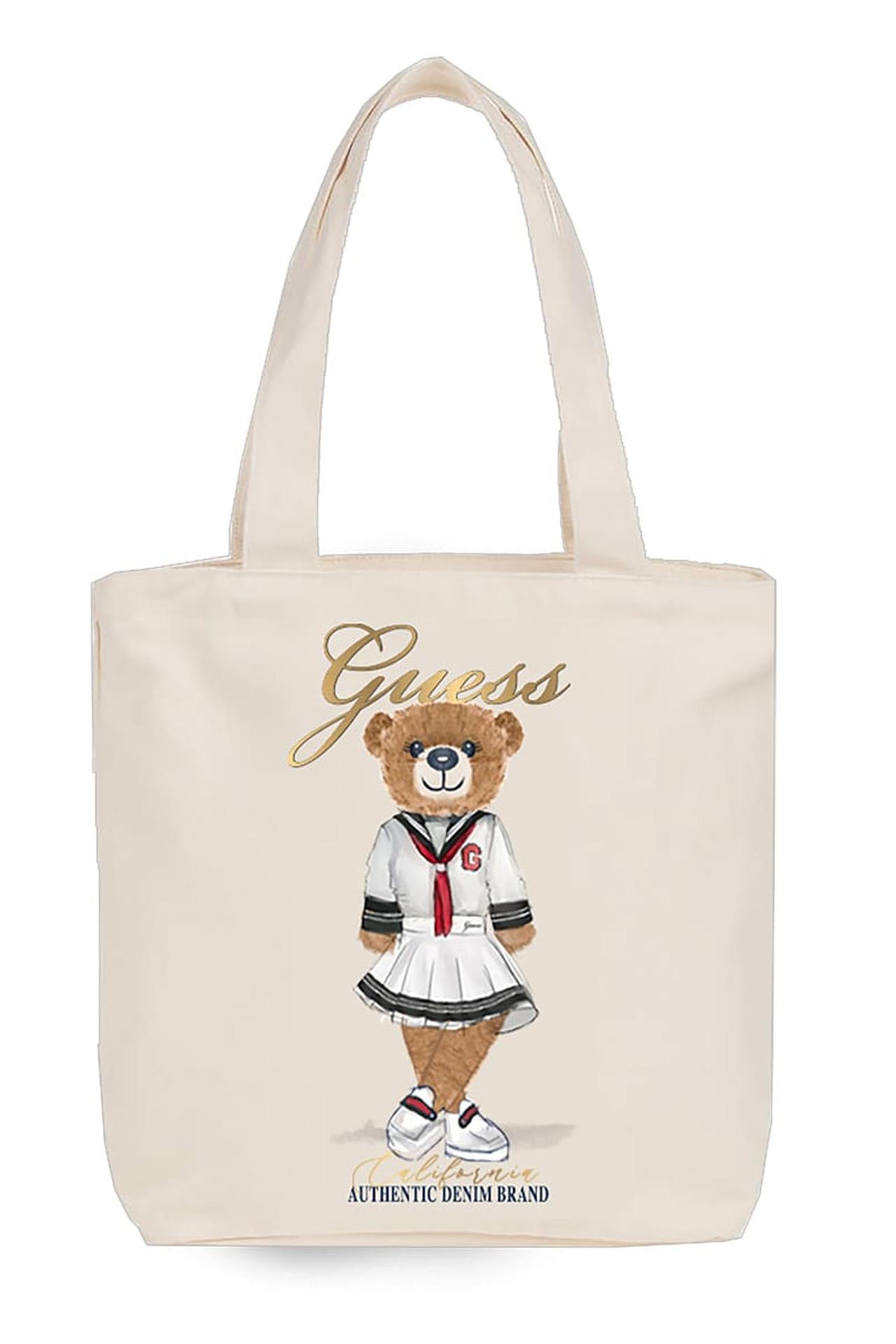 - Уникальный дизайн: Центральный элемент — детализированный принт забавного медвежонка в стильном наряде, дополненный золотистым логотипом Guess. Такой аксессуар подчеркнет индивидуальность и создаст игривый образ.