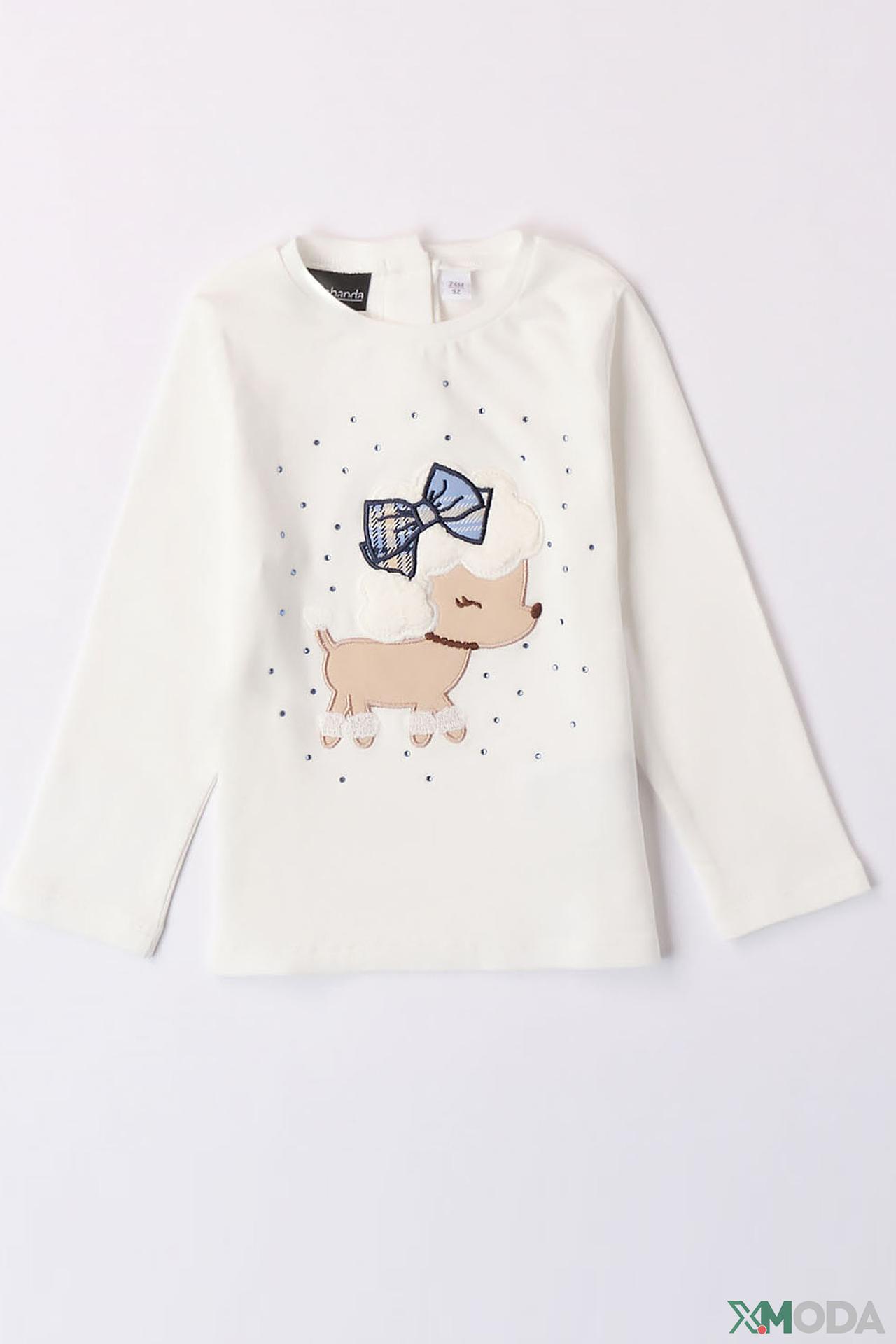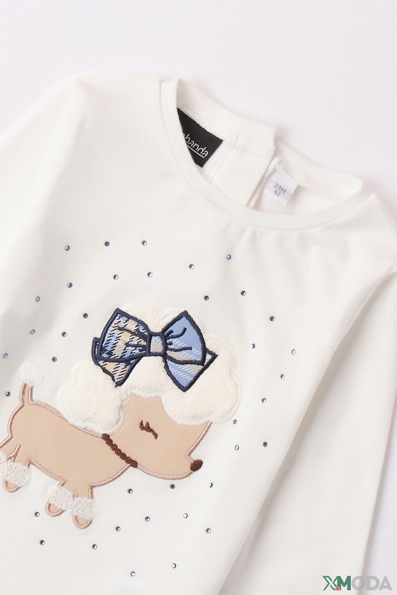 - Дизайн: Белый цвет джемпера является универсальным и легко сочетается с другой одеждой. Оригинальная аппликация в виде пушистой собачки с бантиком и россыпь страз добавляют изделию очарования и делают его заметным.