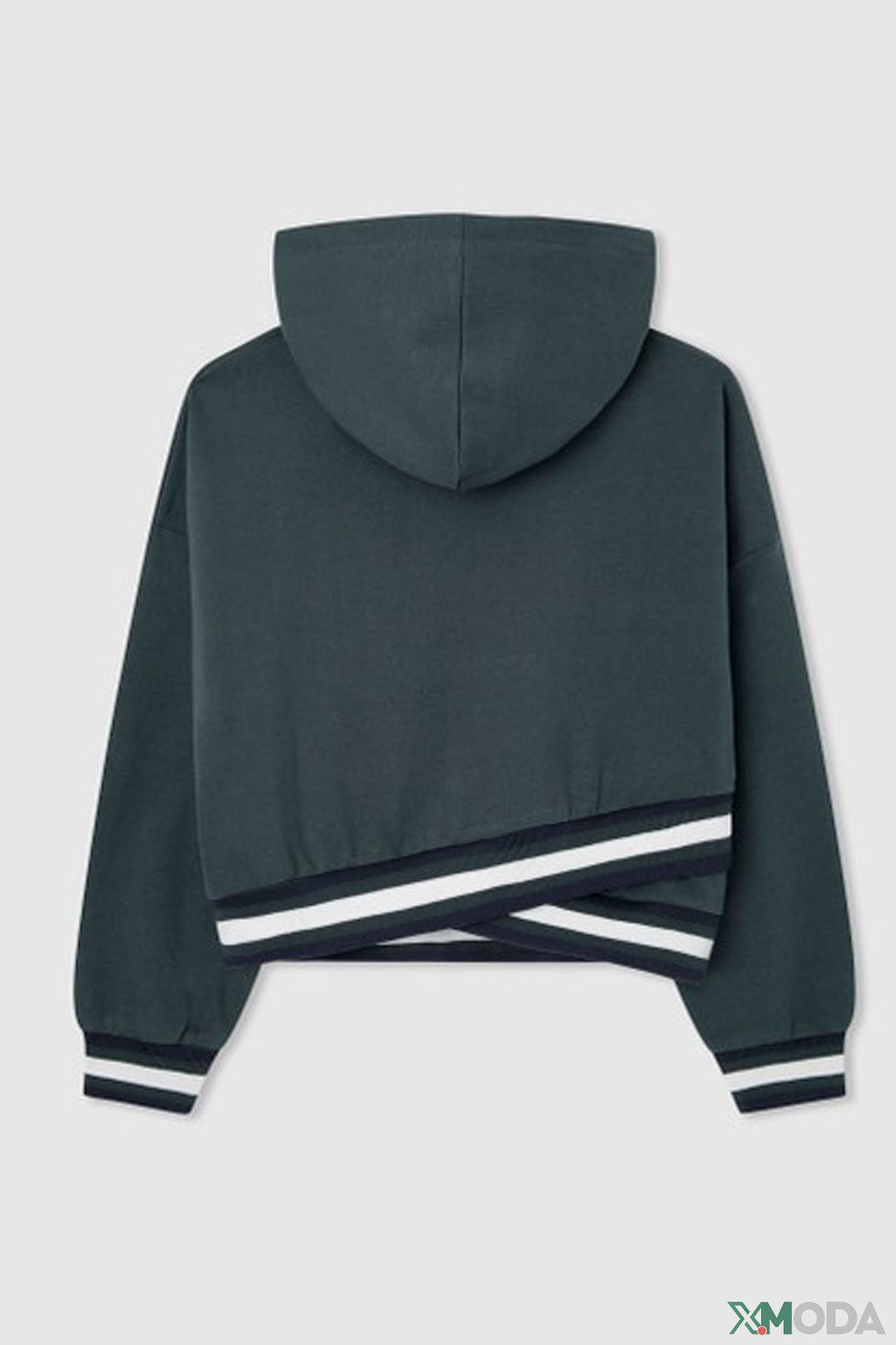 Стильный джемпер с капюшоном в темно-зеленом цвете – идеальный выбор для создания модных и комфортных образов. Этот джемпер станет незаменимой вещью в вашем гардеробе, сочетая в себе удобство и актуальный дизайн. Декоративная надпись на груди и полосатая отделка по низу добавляют образу спортивный шик.