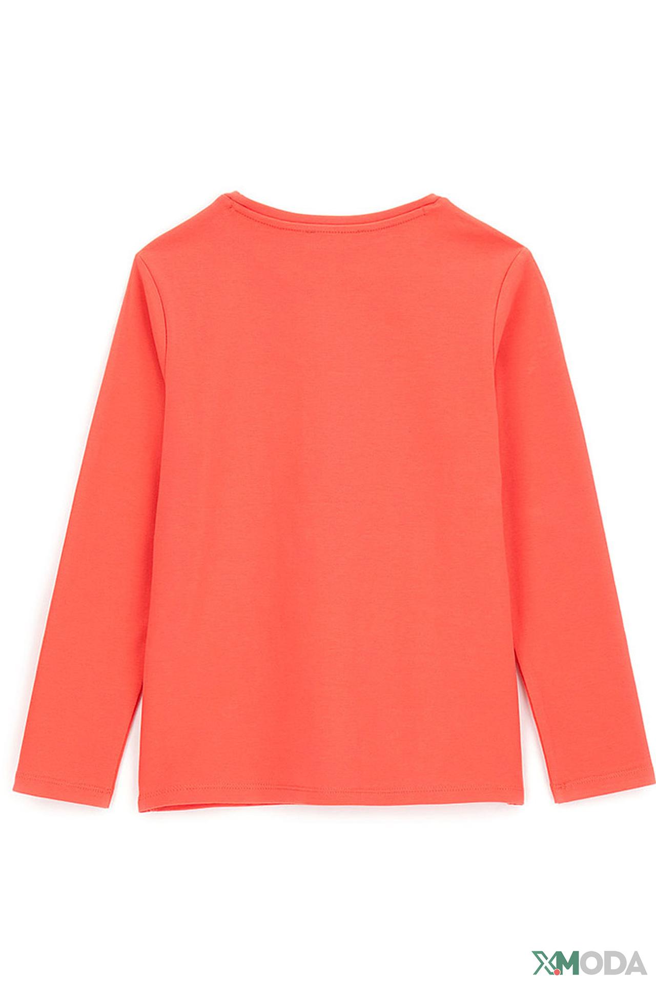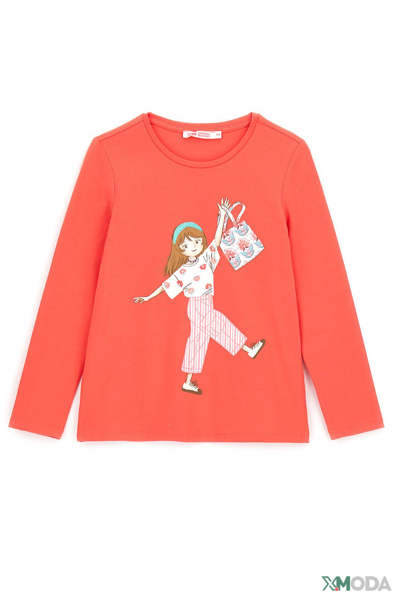 Яркий коралловый оттенок и забавный принт с изображением девочки, несущей сумку, делают этот лонгслив уникальным и запоминающимся. Он отлично подойдет для повседневной носки, школы или прогулок.
