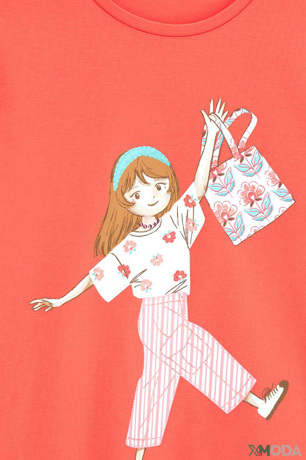 - Яркий дизайн: Насыщенный коралловый оттенок и оригинальный принт с девочкой добавят игривости в детский гардероб и поднимут настроение, выделяя вашу дочку.