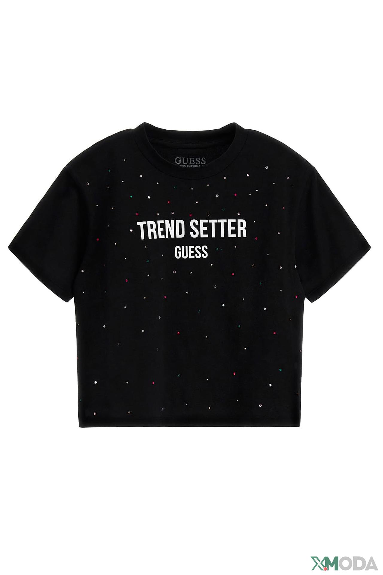 - Дизайн: Черный цвет, короткий рукав, круглый вырез горловины. Оригинальная принтованная надпись "TREND SETTER GUESS" и декоративные стразы по всей поверхности футболки.