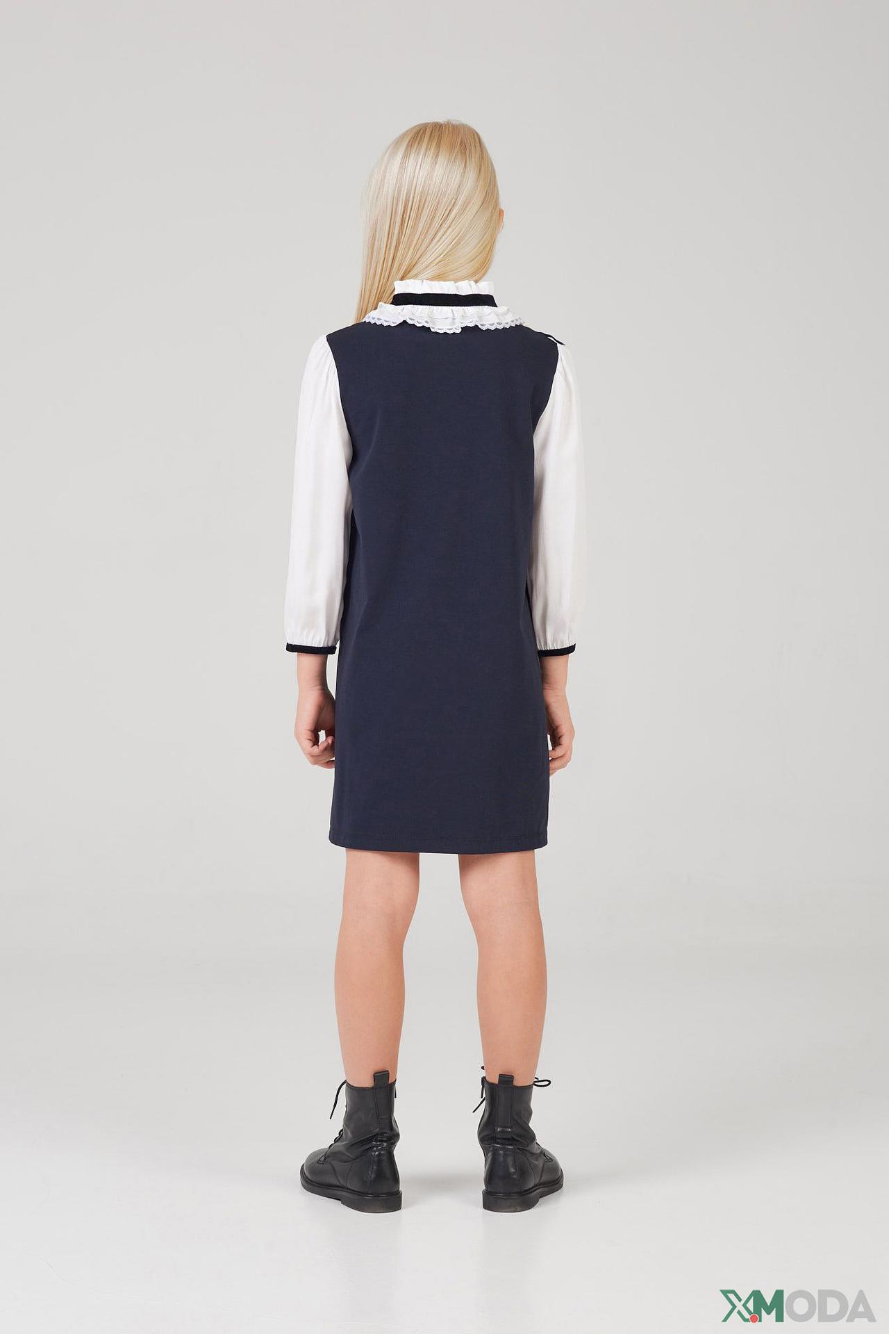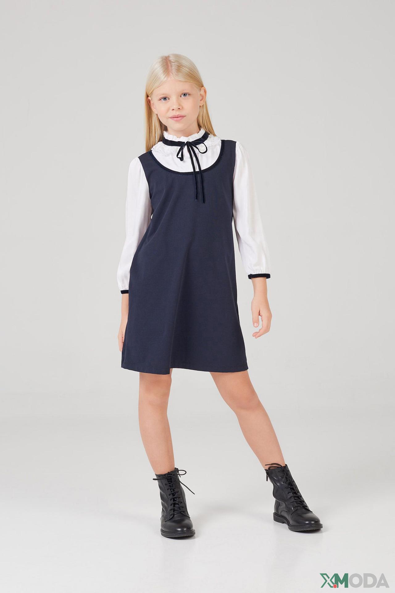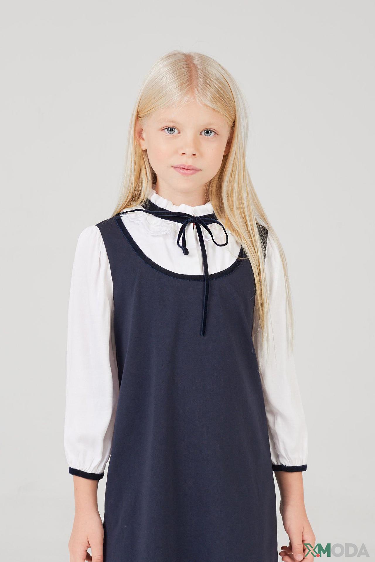 - Классический дизайн: Глубокий тёмно-синий цвет сарафана и контрастная белая блузка с воротником и элегантным чёрным бантом формируют универсальный и всегда актуальный образ, идеально подходящий для школы или торжественных мероприятий.