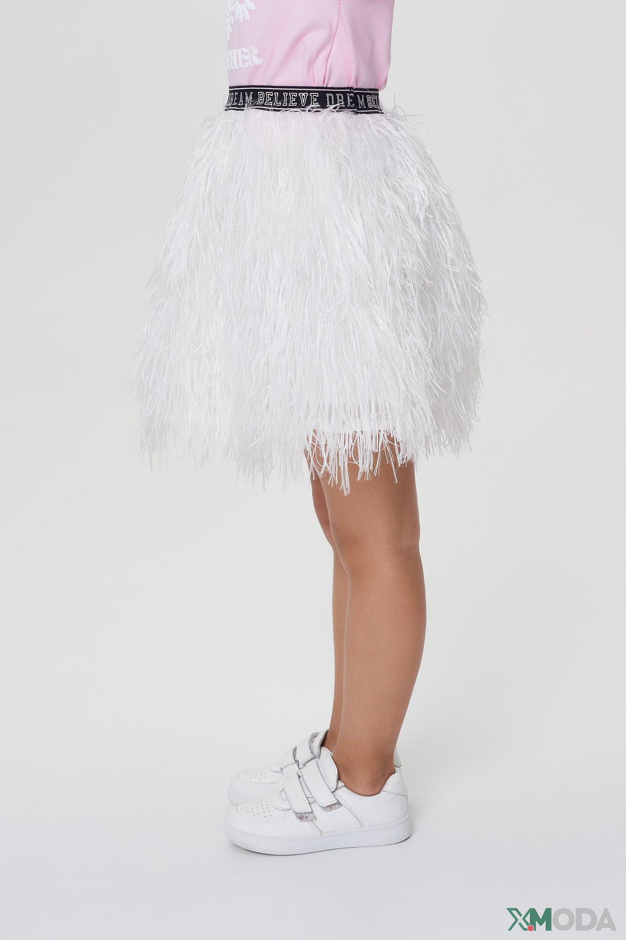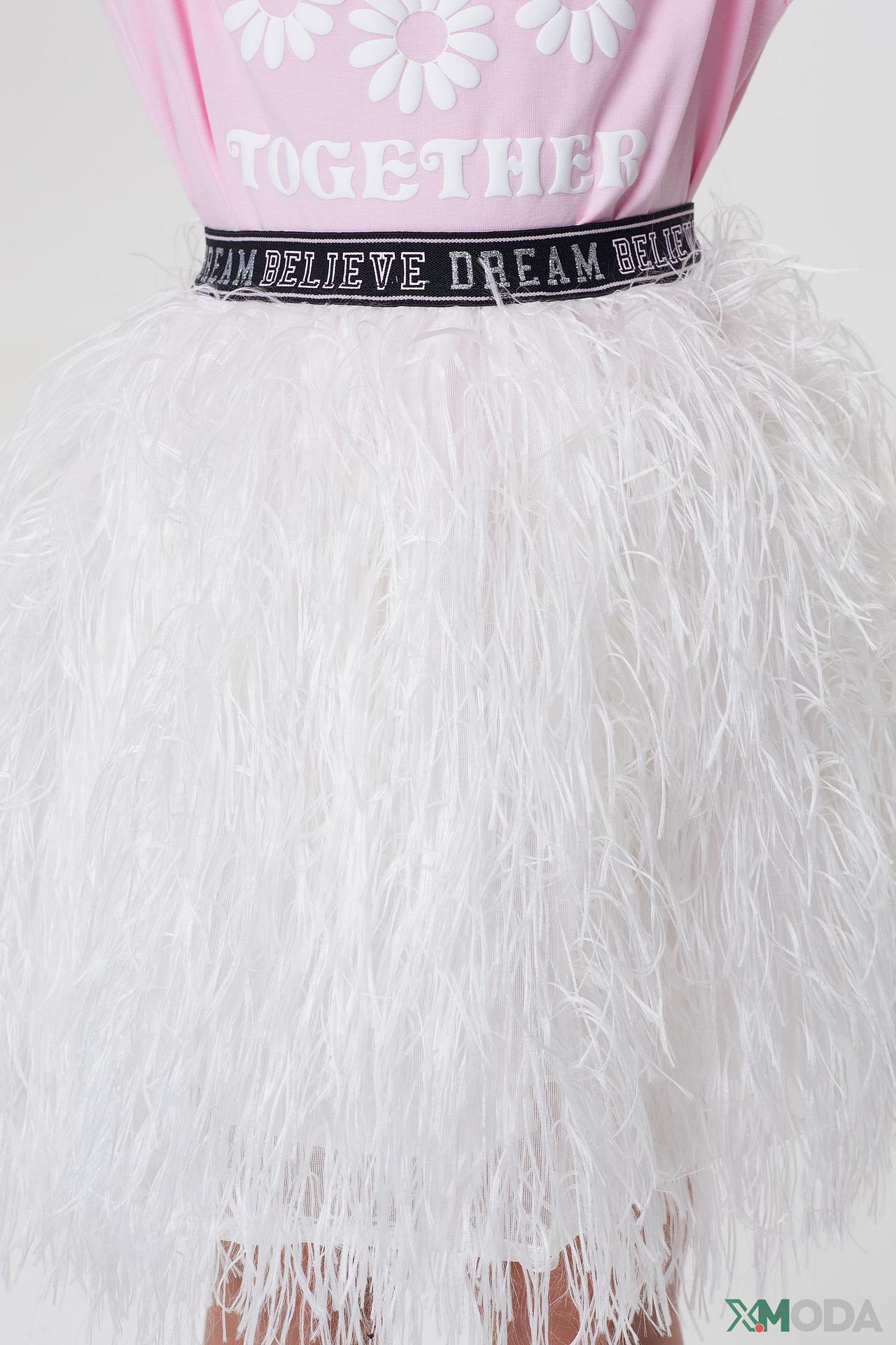- Фактурный дизайн: Юбка украшена уникальным пушистым декором, имитирующим перья, что придает ей особую воздушность и объем.