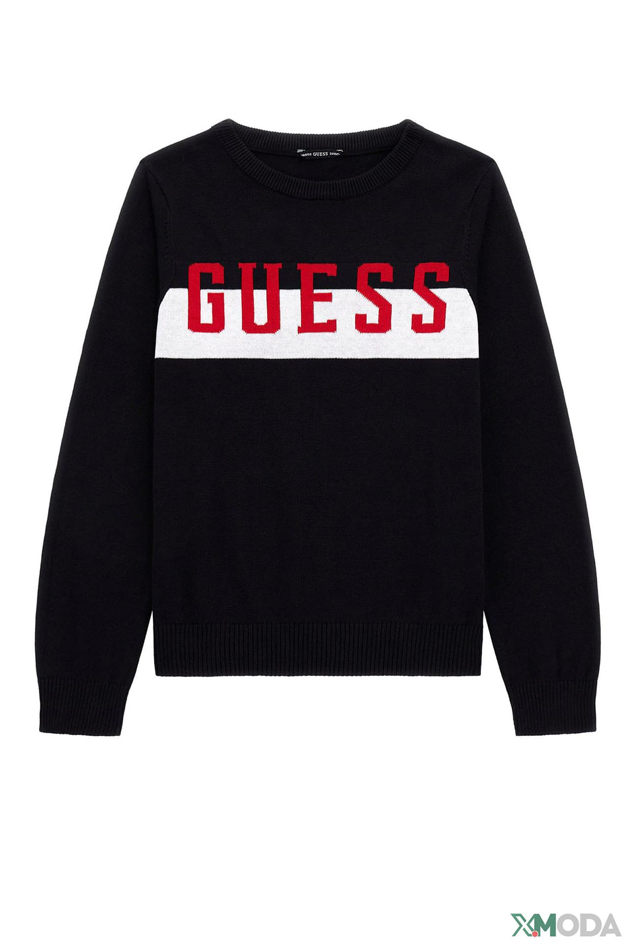 - Дизайн: Классический джемпер с круглым вырезом и длинными рукавами. Контрастная полоса с логотипом Guess на груди придает изделию узнаваемый стиль.