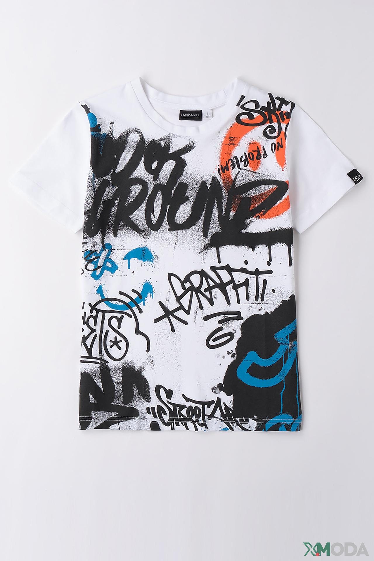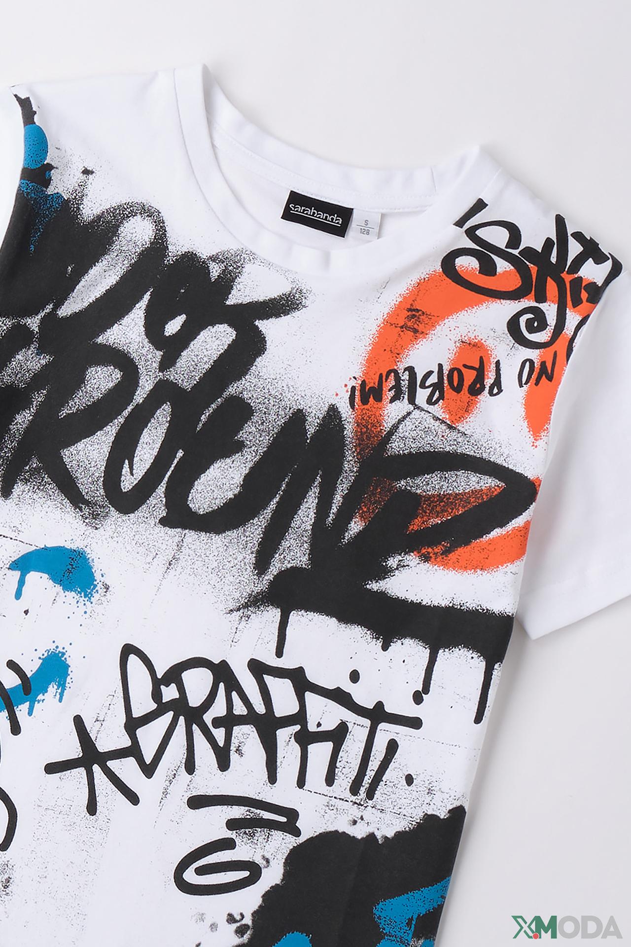 Белая футболка Sarabanda для мальчиков создана из 100% хлопка, обеспечивая комфорт и мягкость в течение всего дня. Модель украшена ярким граффити-принтом, который придаст образу современного городского стиля. Это идеальный выбор для активных детей, ценящих удобство и оригинальность.
