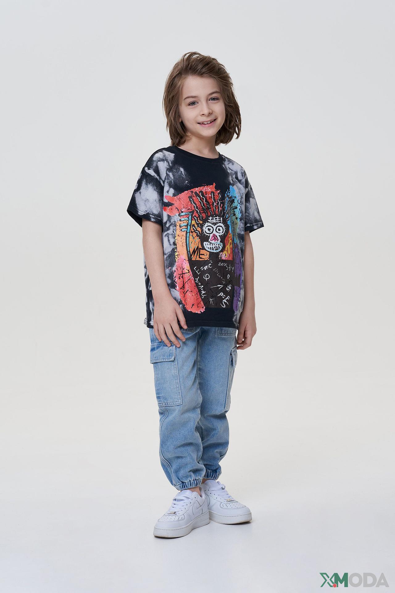 Оригинальный дизайн футболки с эффектом тай-дай на чёрно-серых оттенках и ярким, абстрактным принтом в стиле граффити на груди придает ей уникальность. Красочные детали и необычное изображение делают эту модель по-настоящему выразительной, выделяя вашего ребенка из толпы.