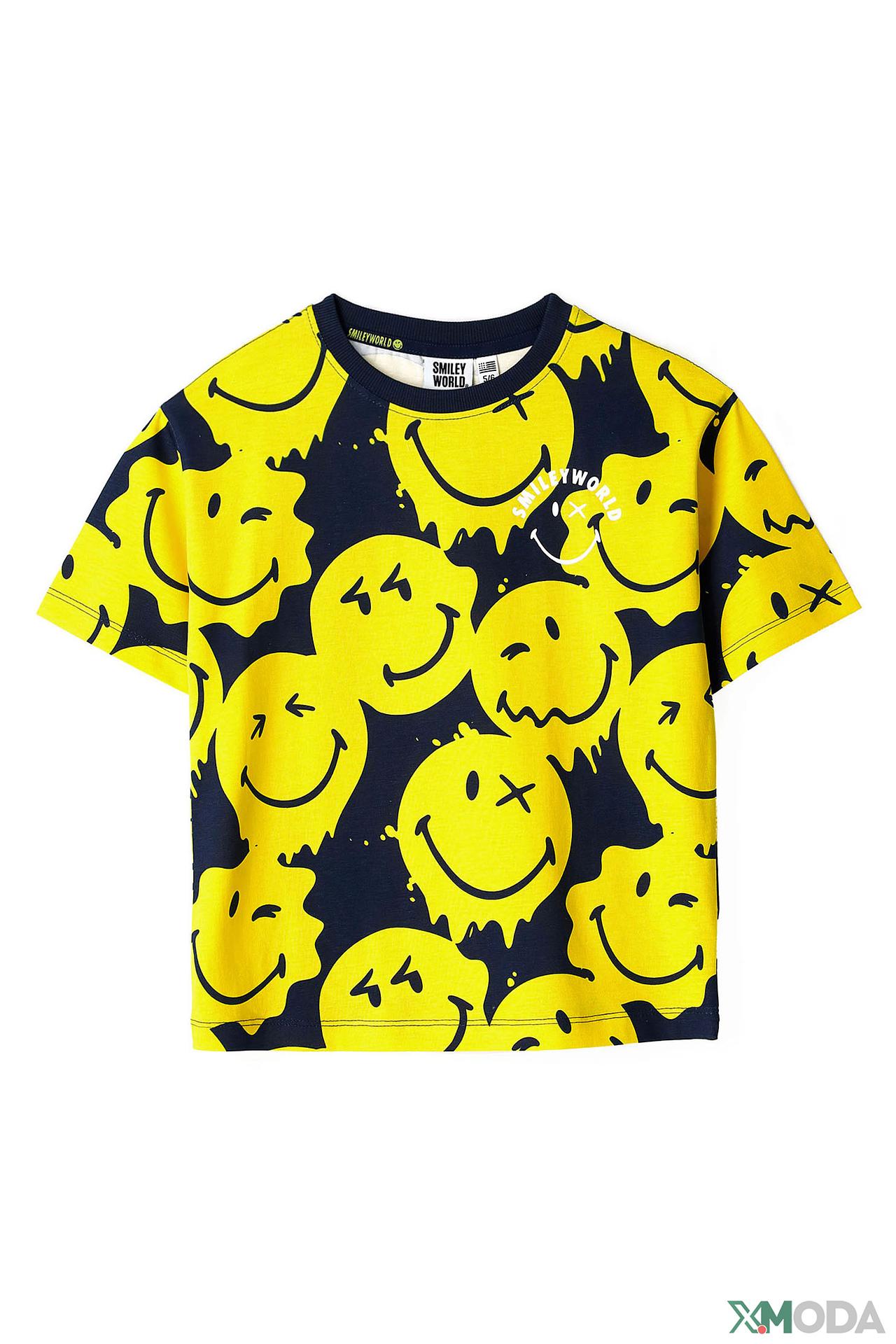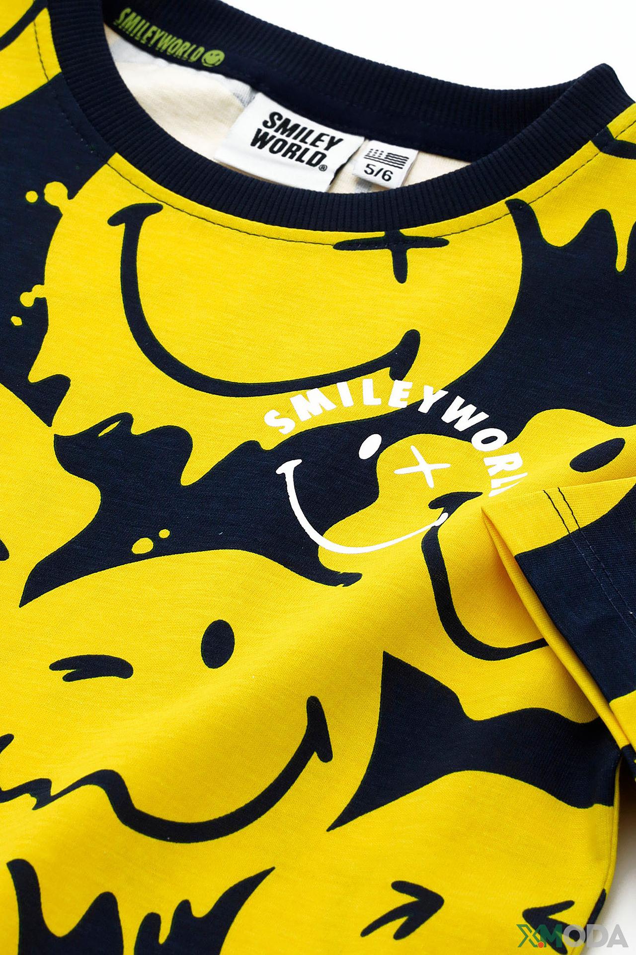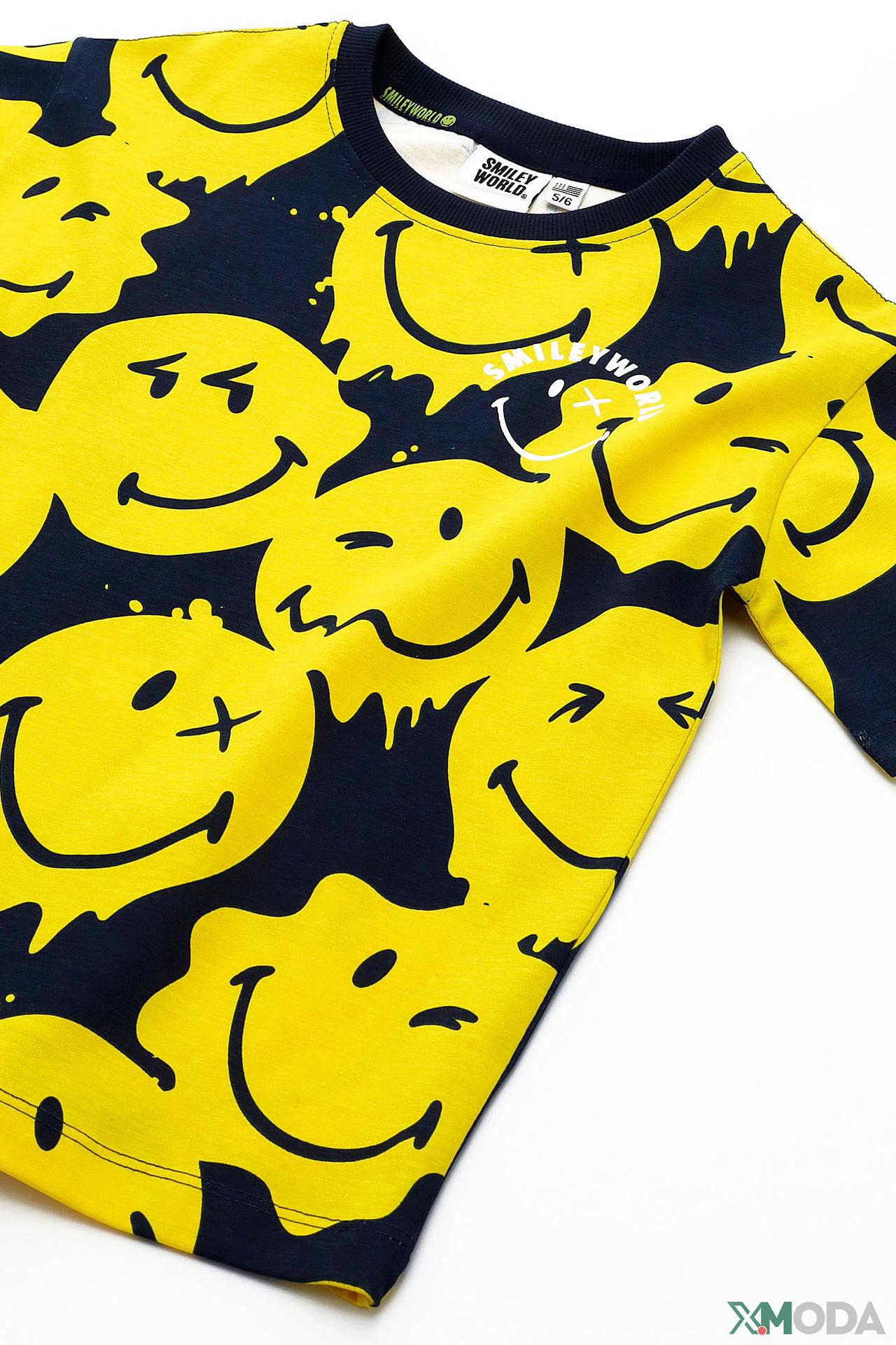 Дизайн футболки украшен озорными принтами в виде смайликов от известной коллаборации SMILEY WORLD, что делает её по-настоящему уникальной и привлекательной для малышей. Сочетание насыщенного жёлтого фона и тёмно-синих изображений создаёт динамичный и позитивный образ, идеально подходящий для активных игр и прогулок.