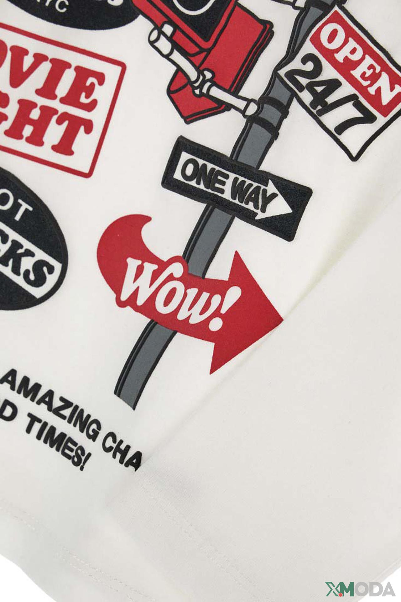 - Яркий дизайн: Оригинальный принт в стиле Нью-Йорка с множеством деталей и надписей привлекает внимание и развивает воображение. Цветовая гамма принта (красный, чёрный, серый) эффектно выделяется на белом фоне, создавая модный и современный образ для мальчика или девочки.