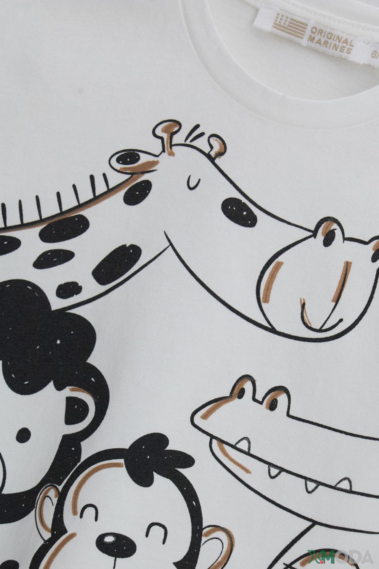 Детская футболка Original Marines с длинным рукавом – идеальный выбор для юных модников. Выполнена из 100% мягкого хлопка, обеспечивая максимальный комфорт и нежность к чувствительной детской коже. Стильный белый цвет и забавный принт с изображением жирафа, льва, обезьяны и крокодила делают эту детскую футболку яркой и привлекательной для малышей.